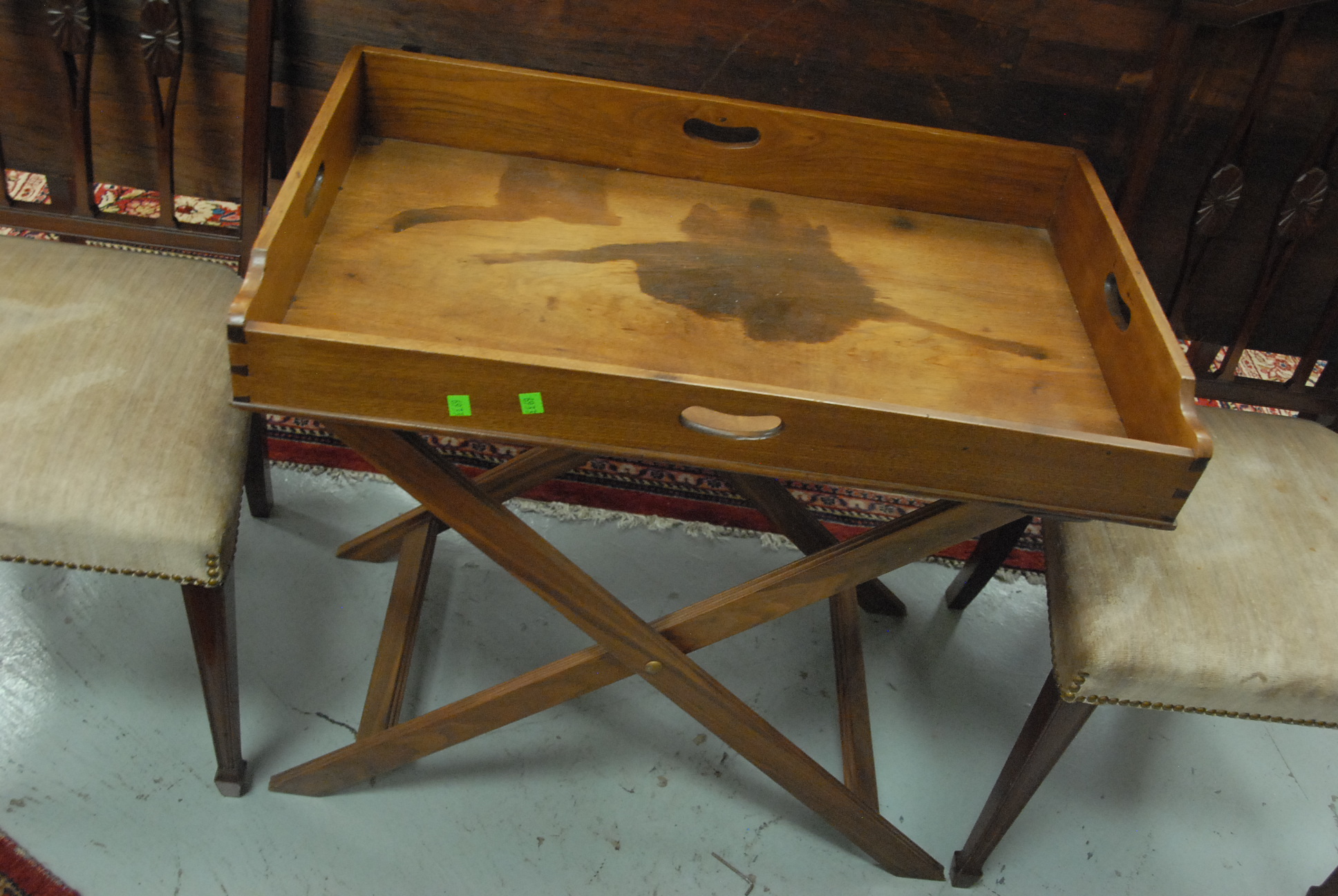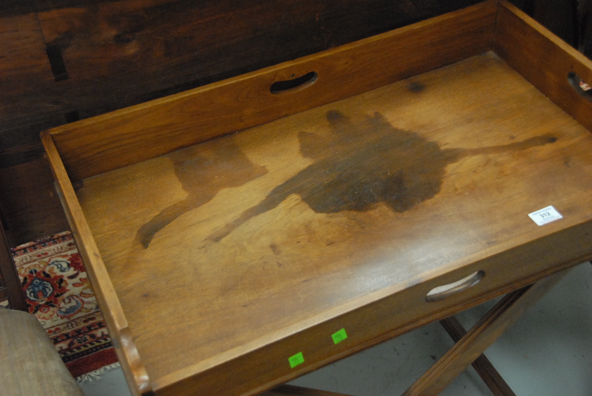 Mahogany serving tray on stand. tray: 18 1/2 x 30 1/2
