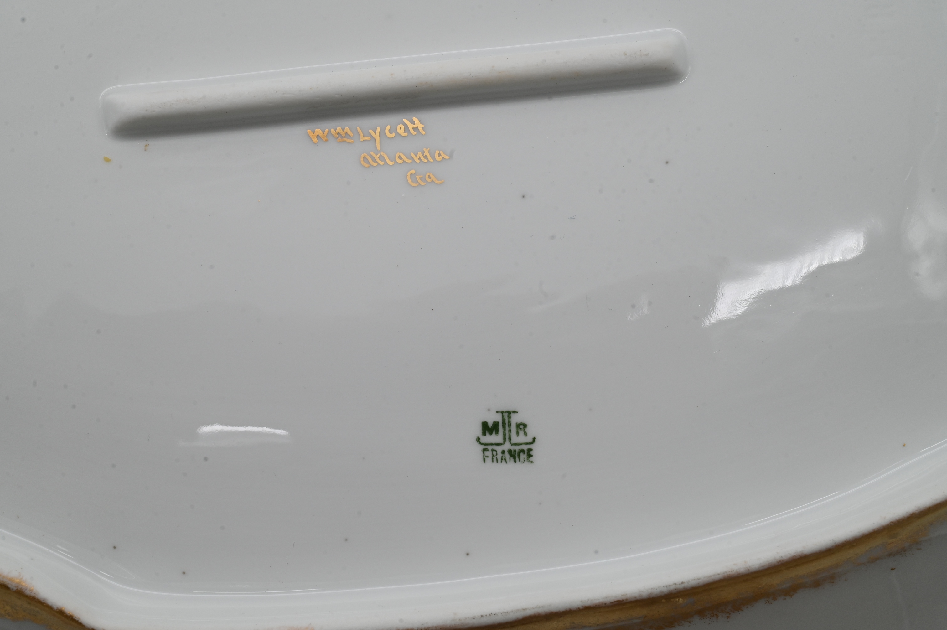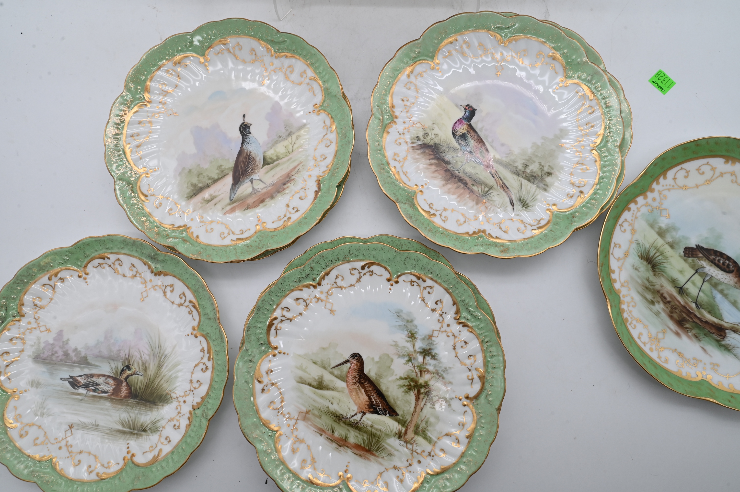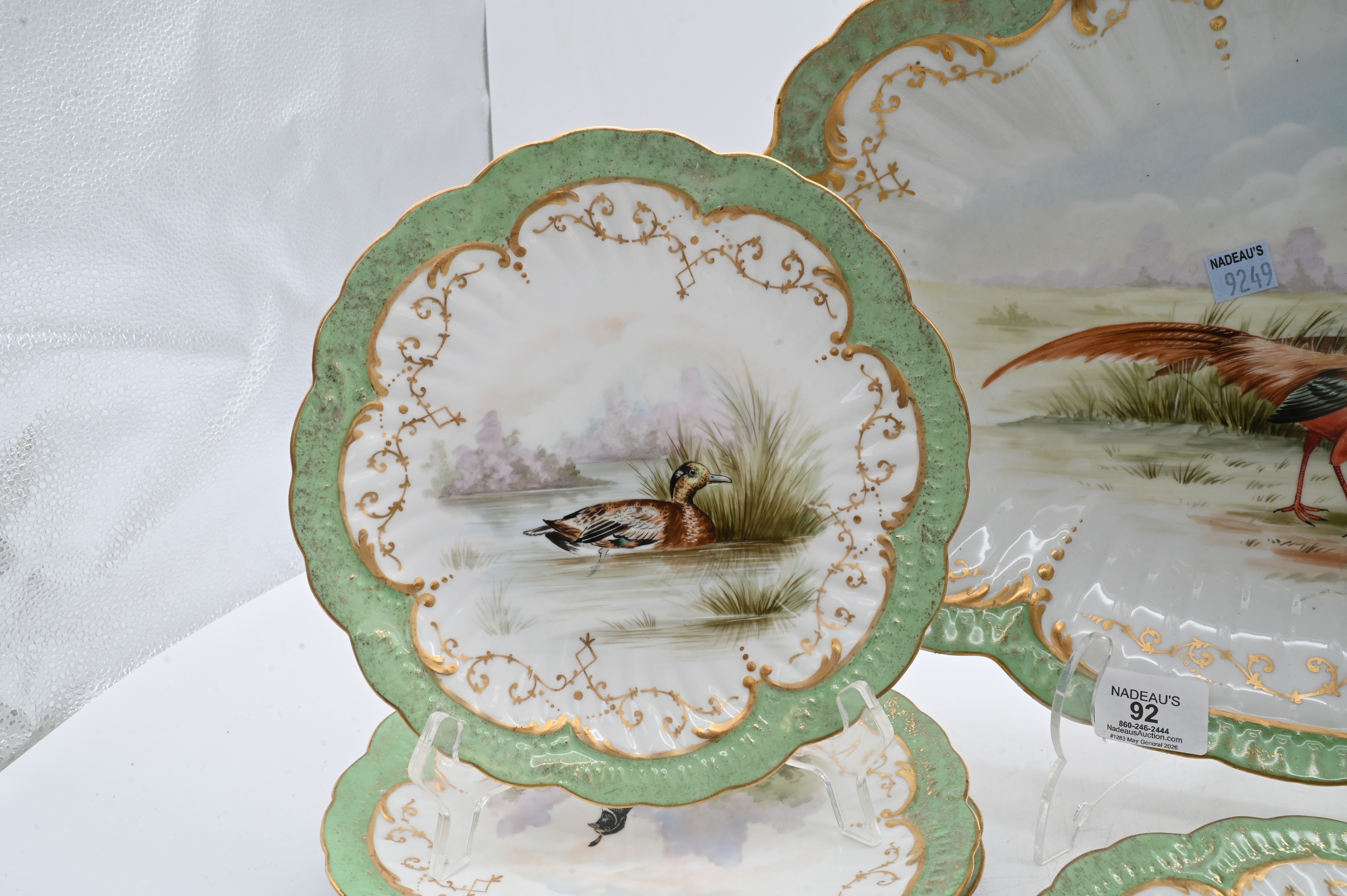 a large shaped platter and eight matching plates having green borders with gilt decoration and hand-painted bird motifs within scalloped reserve