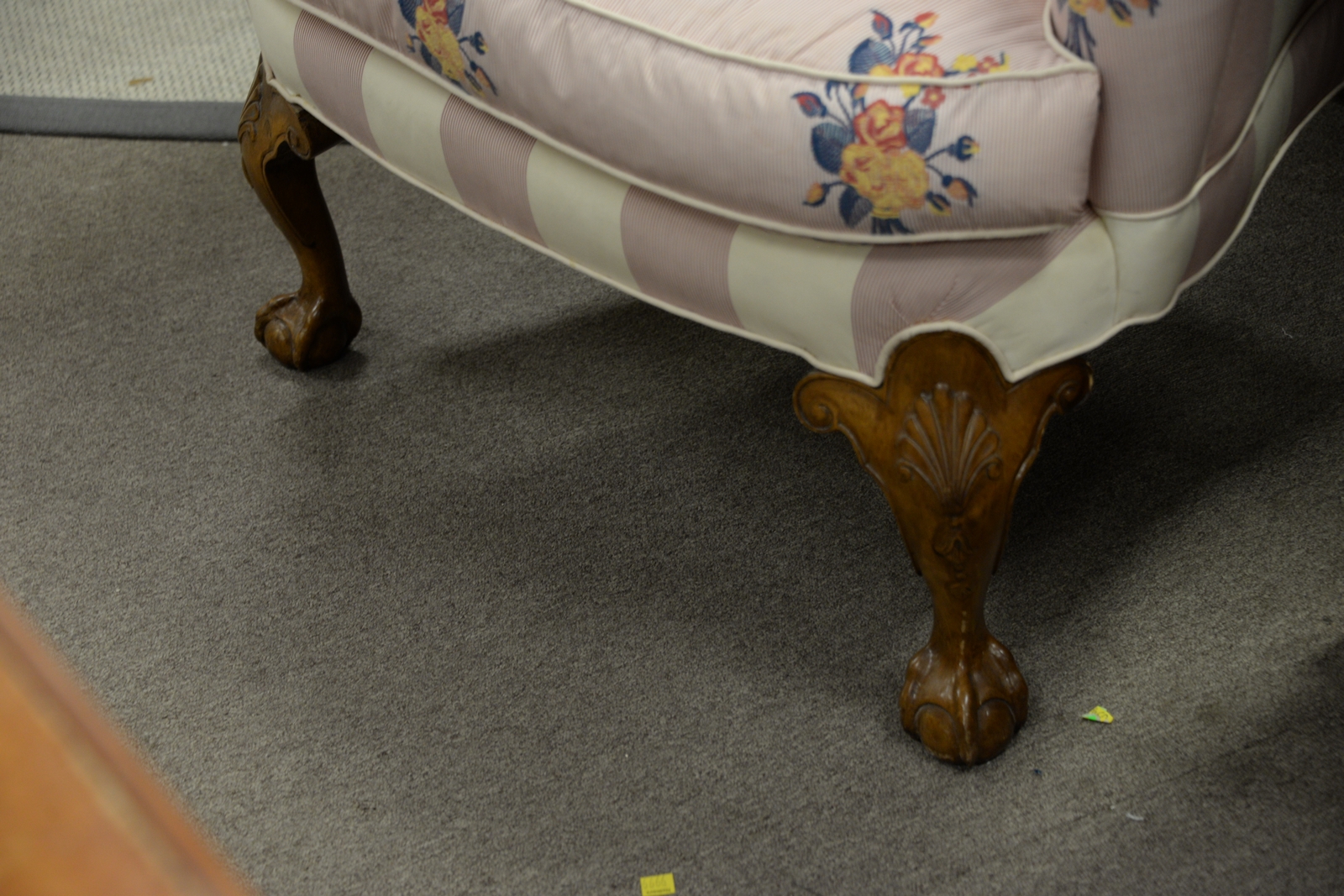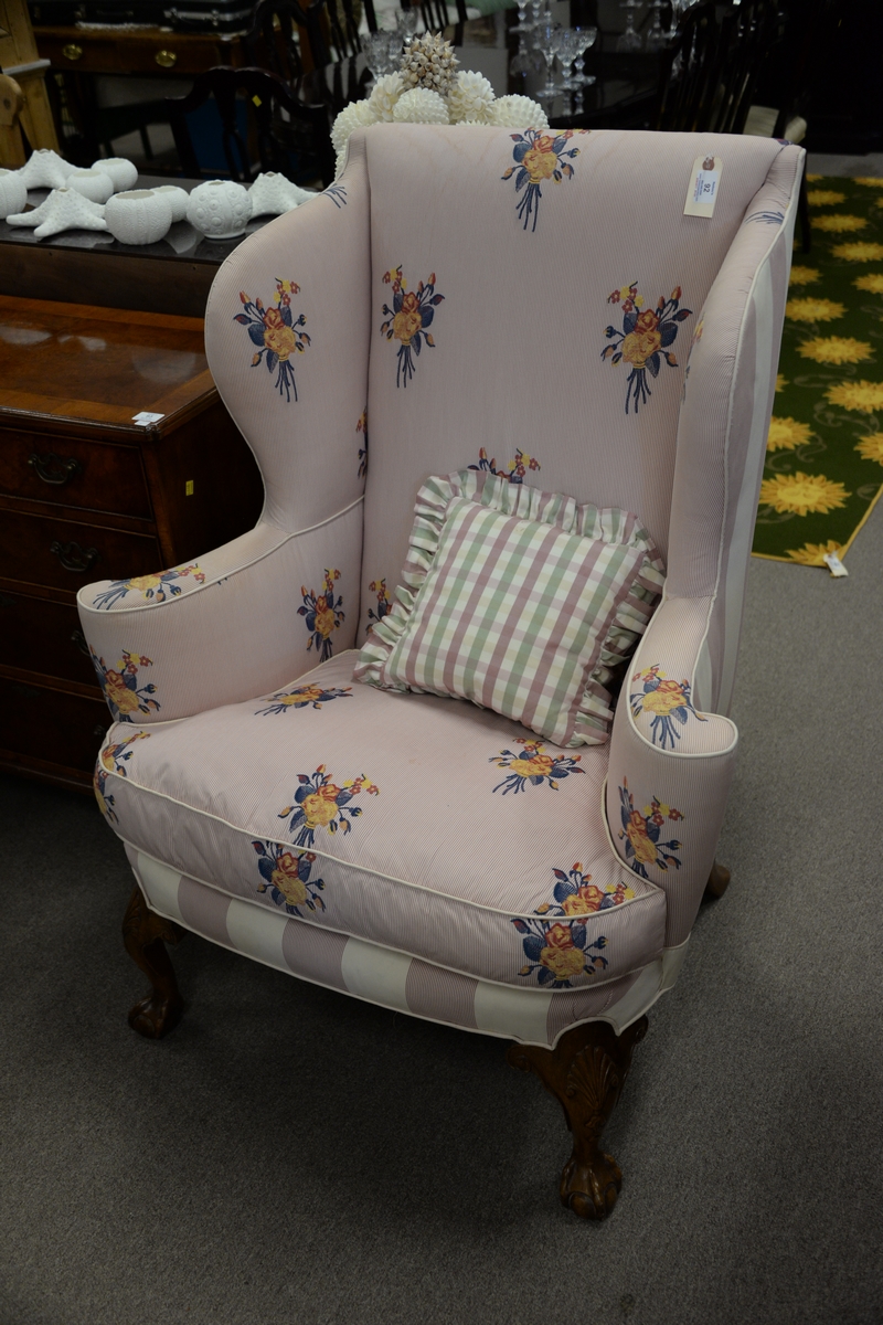 Lot 92: Pair of custom Chippendale style upholstered wing chairs minor imperfections in upholstery. total ht. 44in.