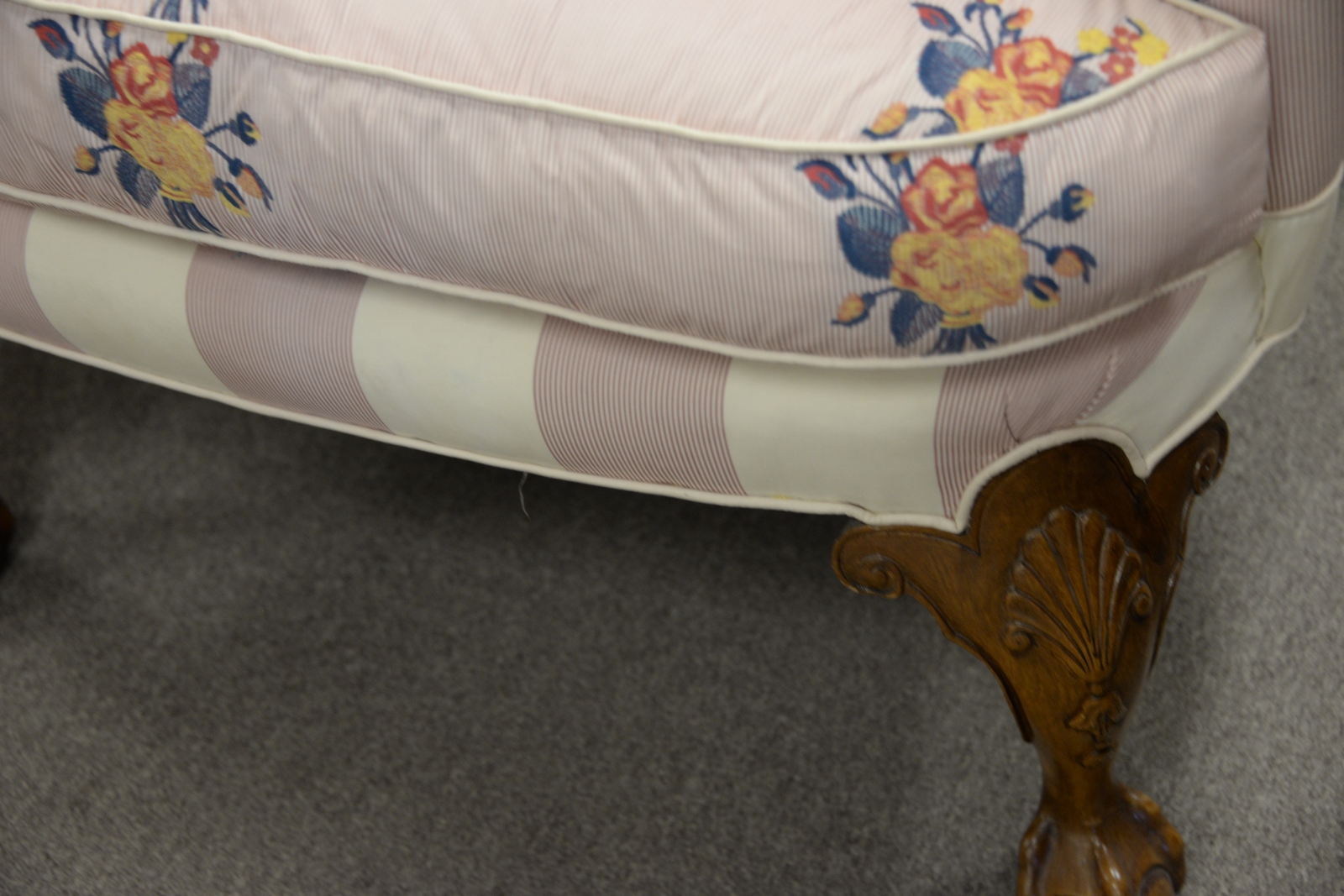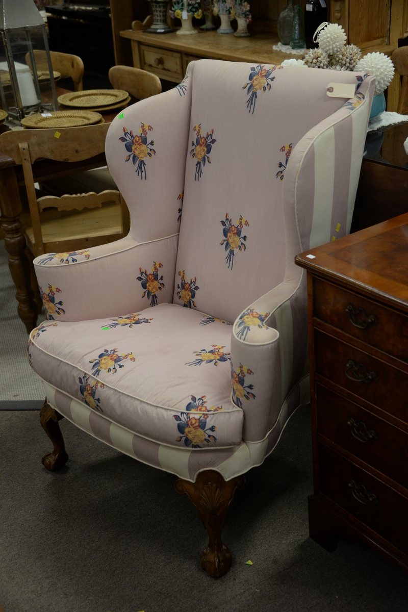Pair of custom Chippendale style upholstered wing chairs minor imperfections in upholstery. total ht. 44in.