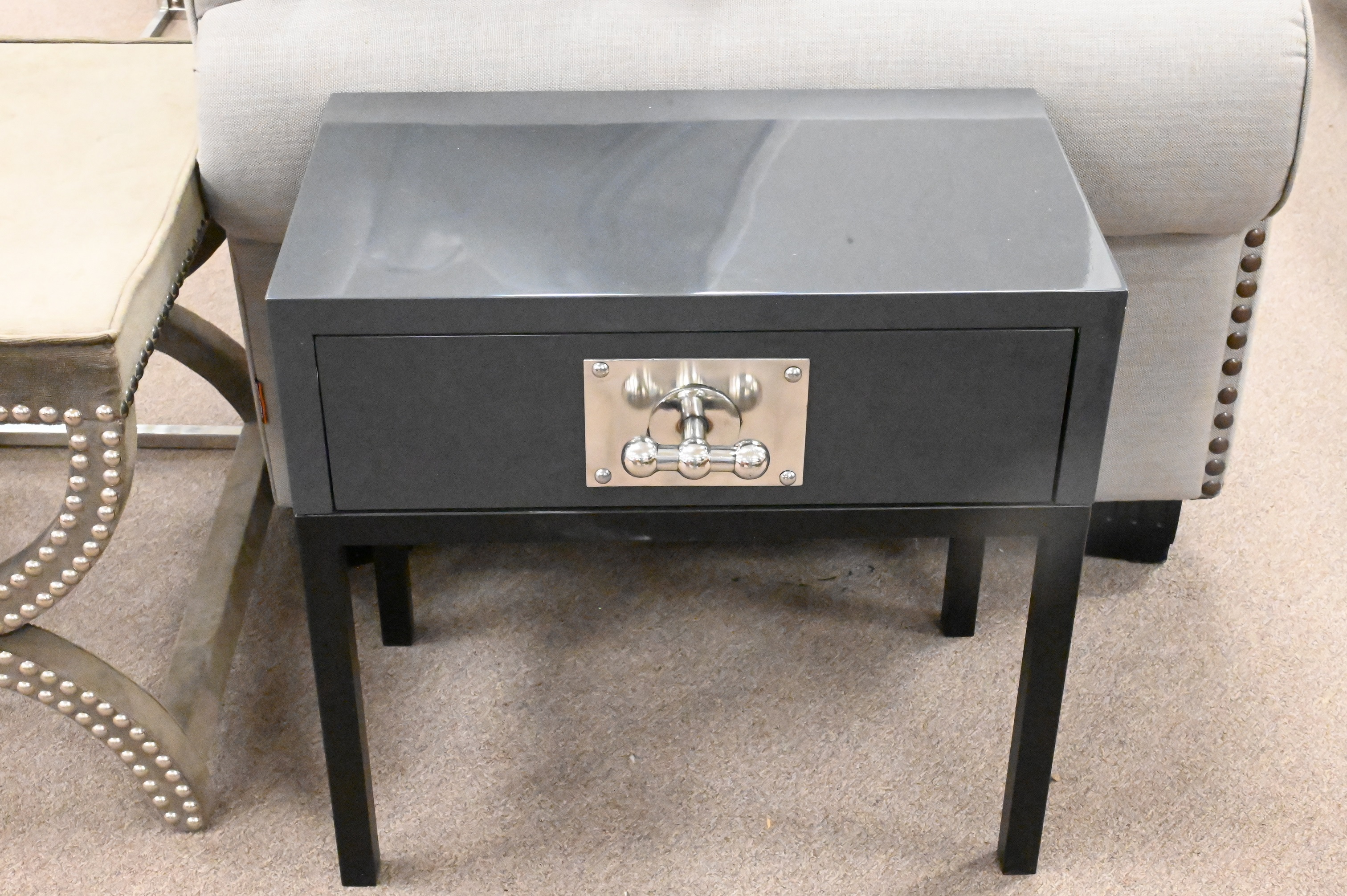 having one drawer with chrome hardware