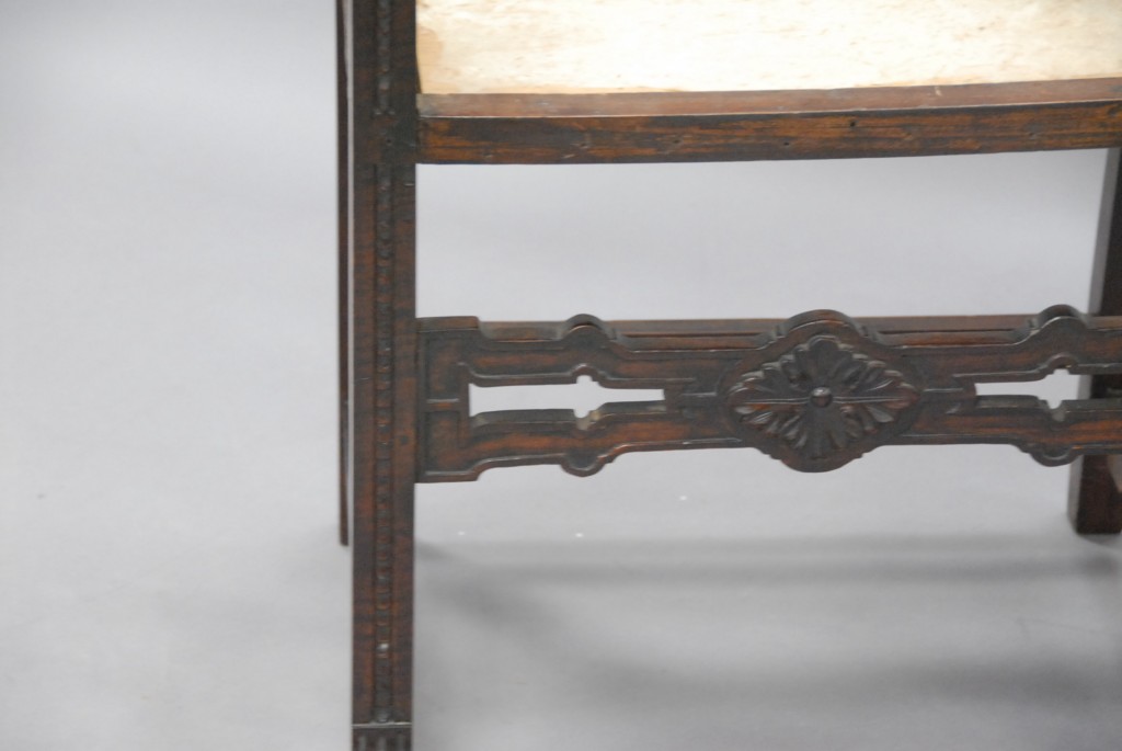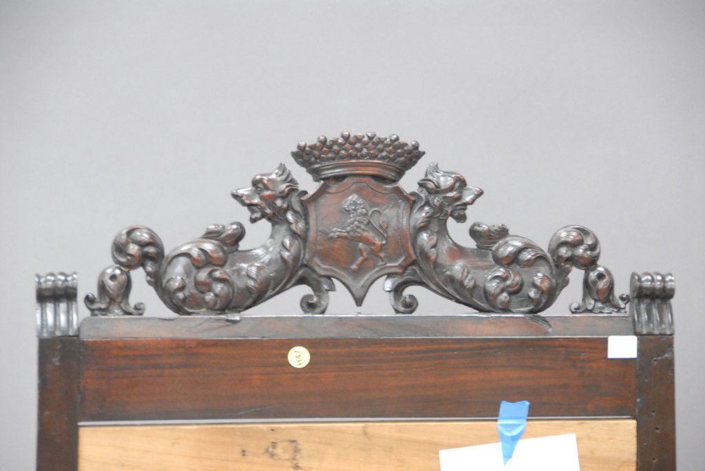 Pair of mahogany Continental style armchairs with carved crests.