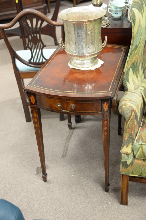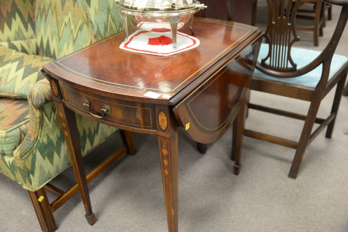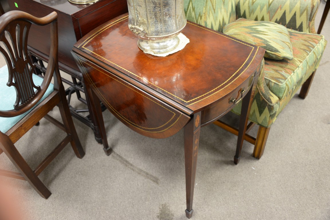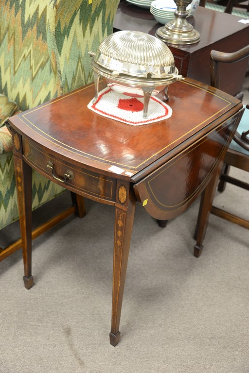 Lot 92: Pair of mahogany Pembroke table with bell flower inlay and leather top, signed Weiman. ht. 29in., top: 19 x 28