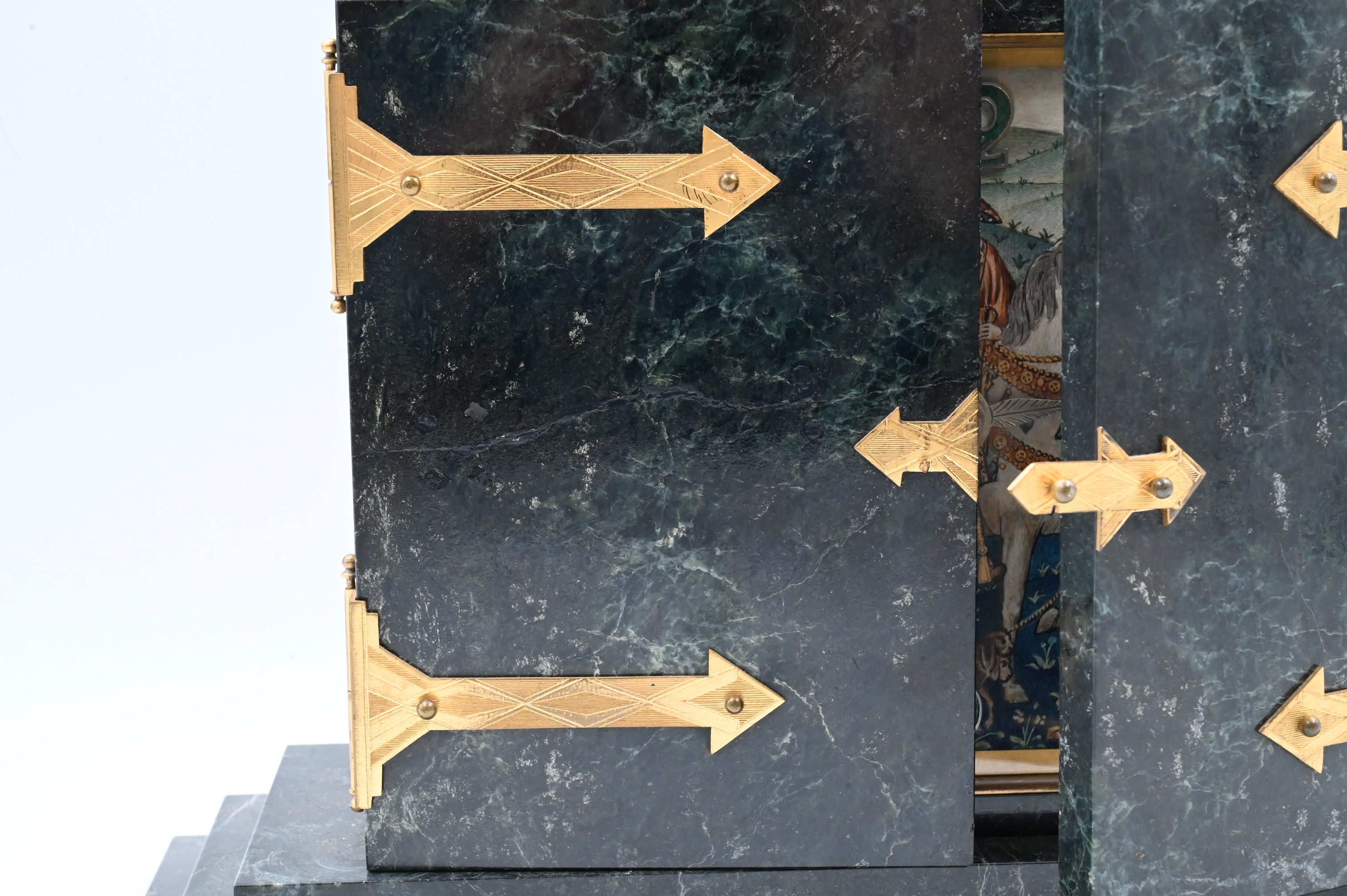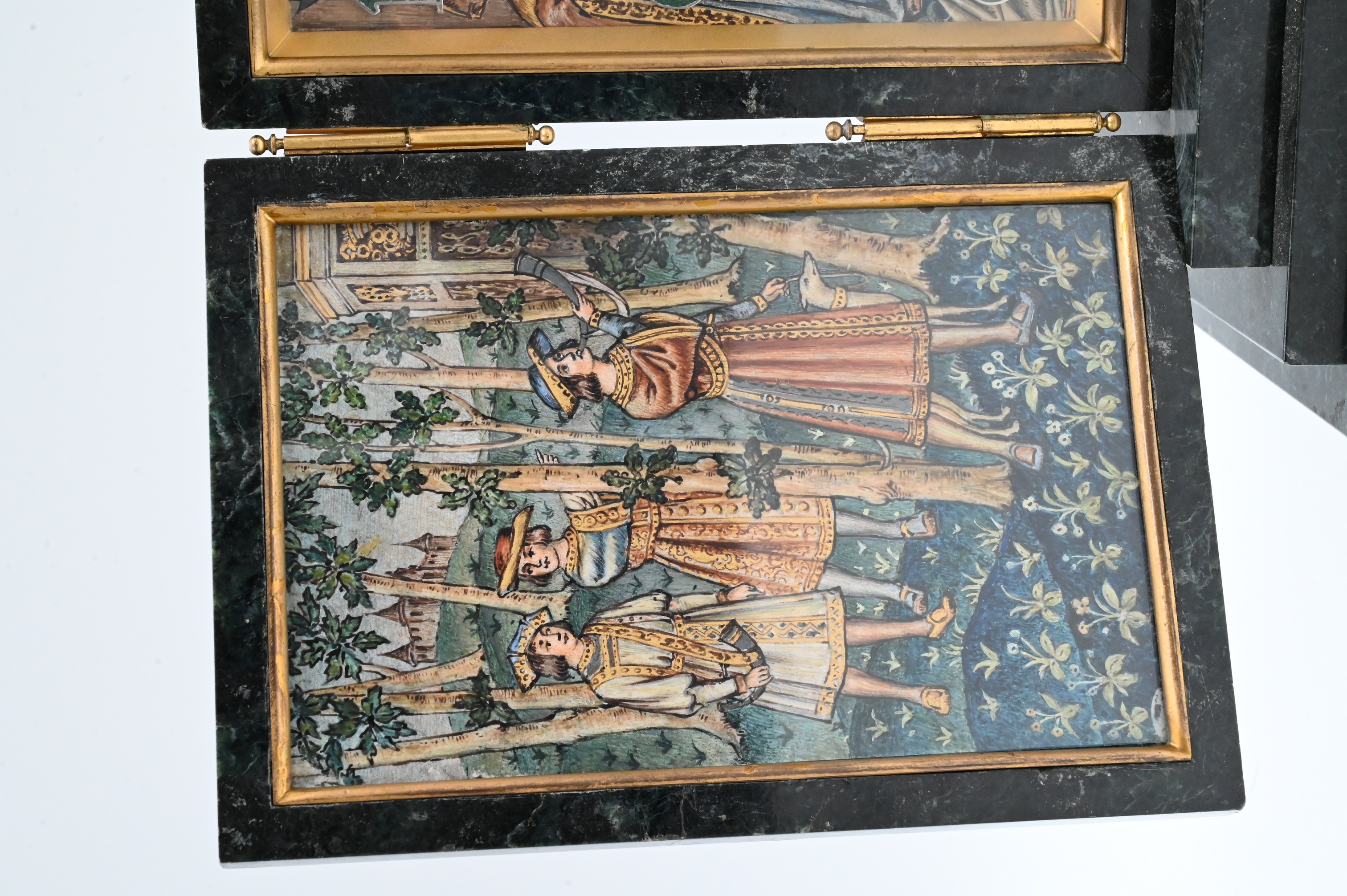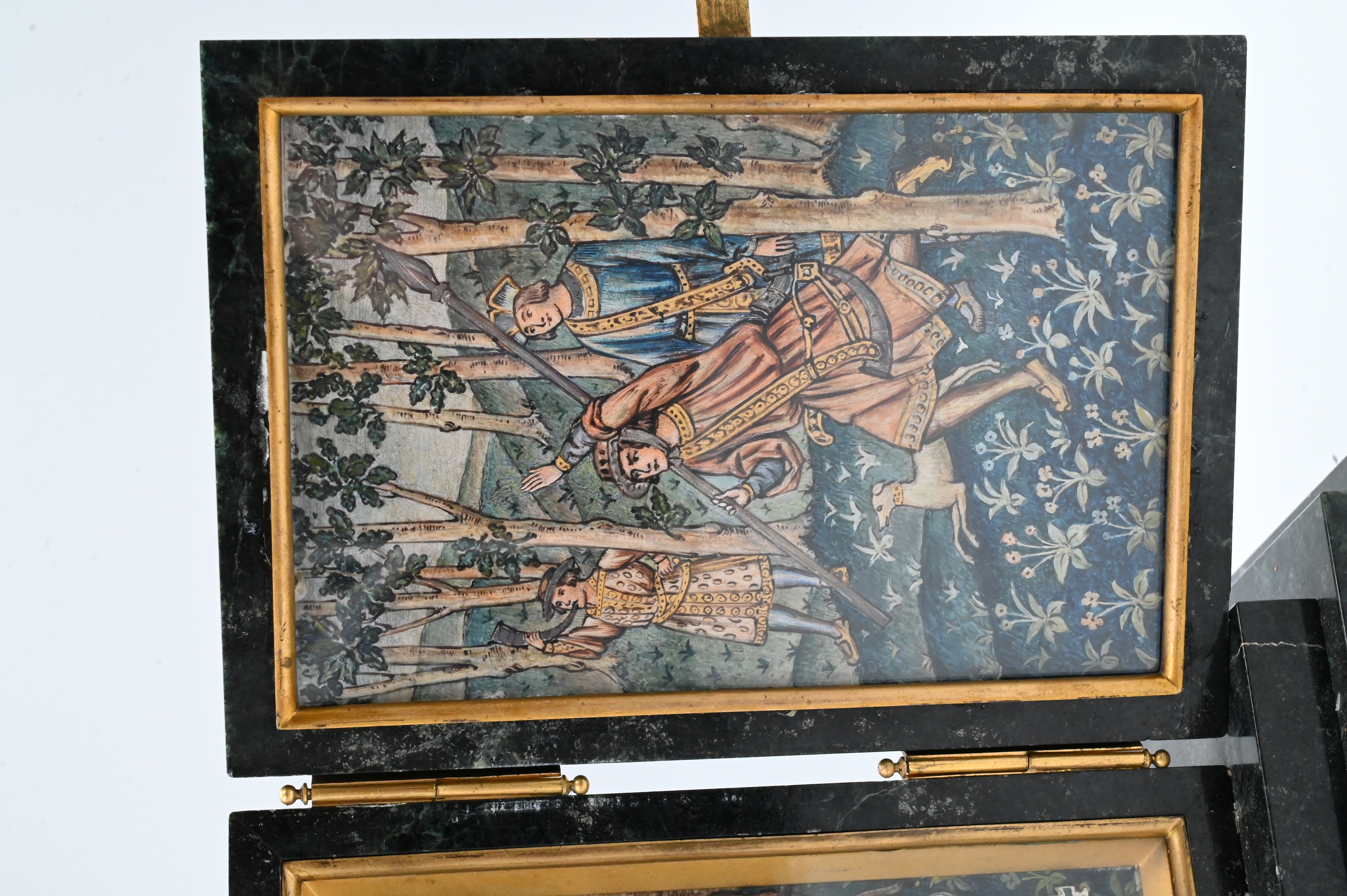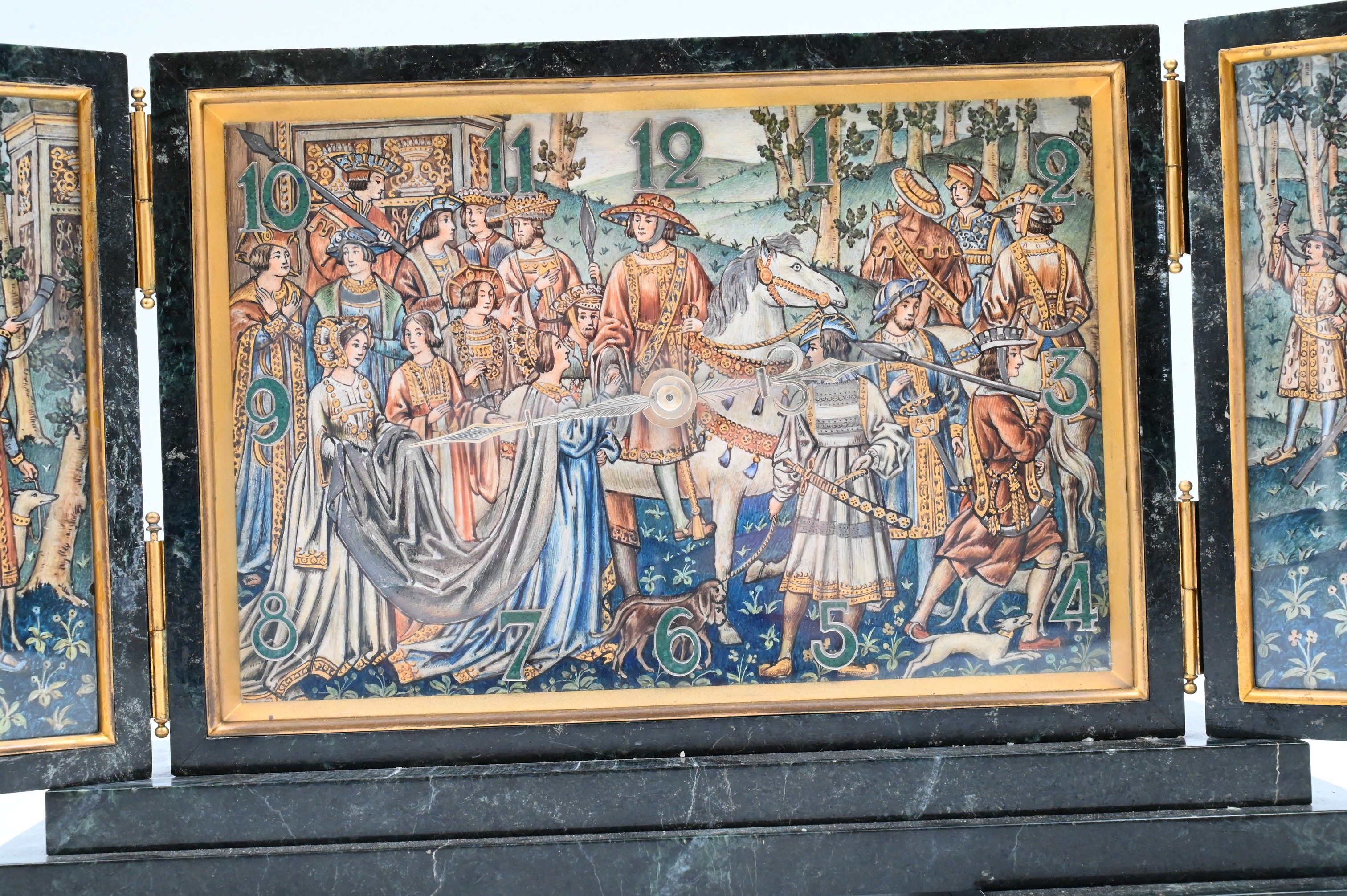 the central panel fitted with an enamel-numbered dial over finely painted watercolor scenes, flanked by two hinged watercolor side panels depicting medieval figures in a wooded landscape,each panel is set in a gilt metal frame and mounted on a stepped green marble base, the clock retains its brass works mounted on a brass plate, the reverse of one panel bears a pencil inscription, appearing to read “Doizece” (or similar), likely the artist’s surname