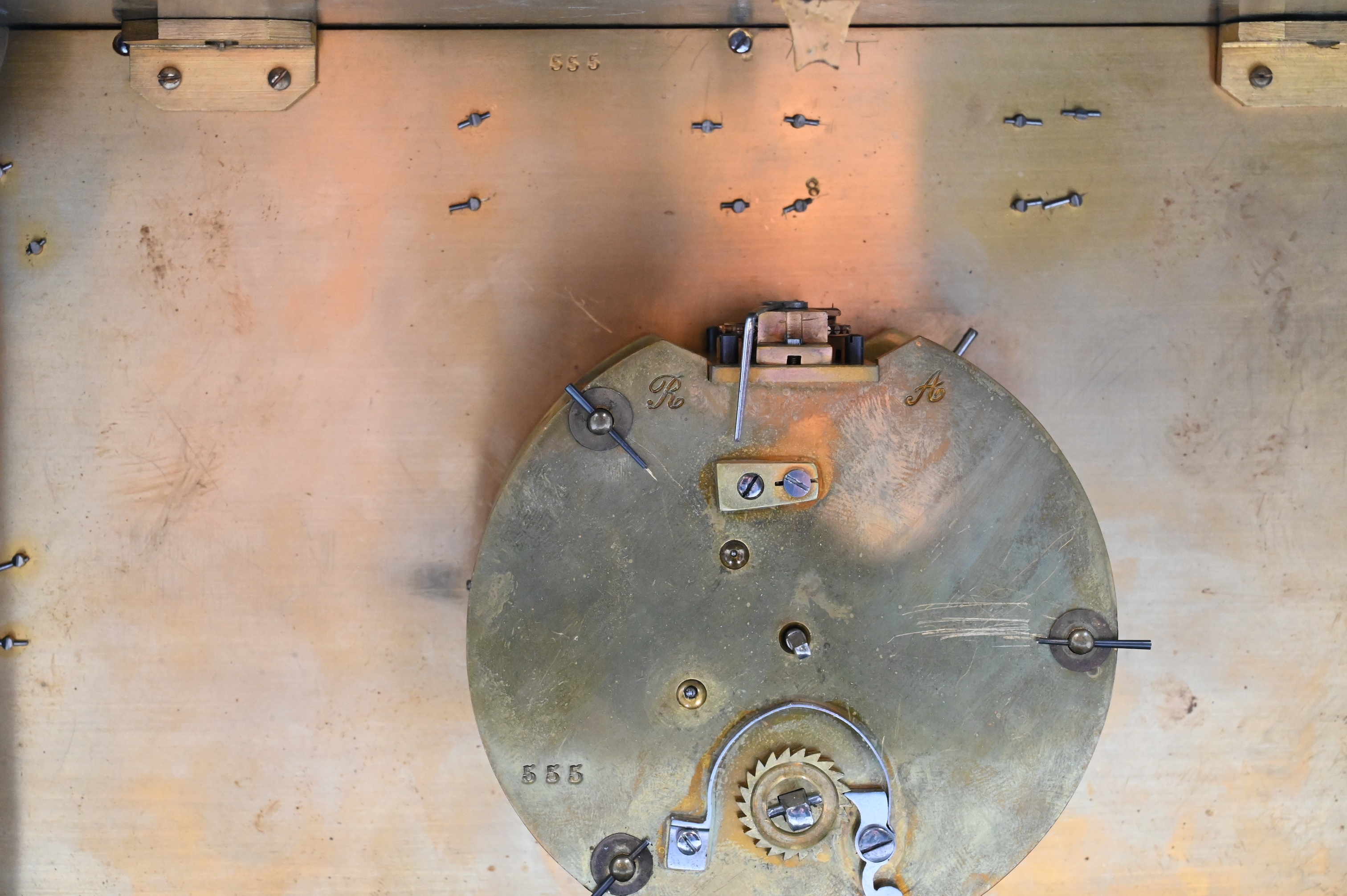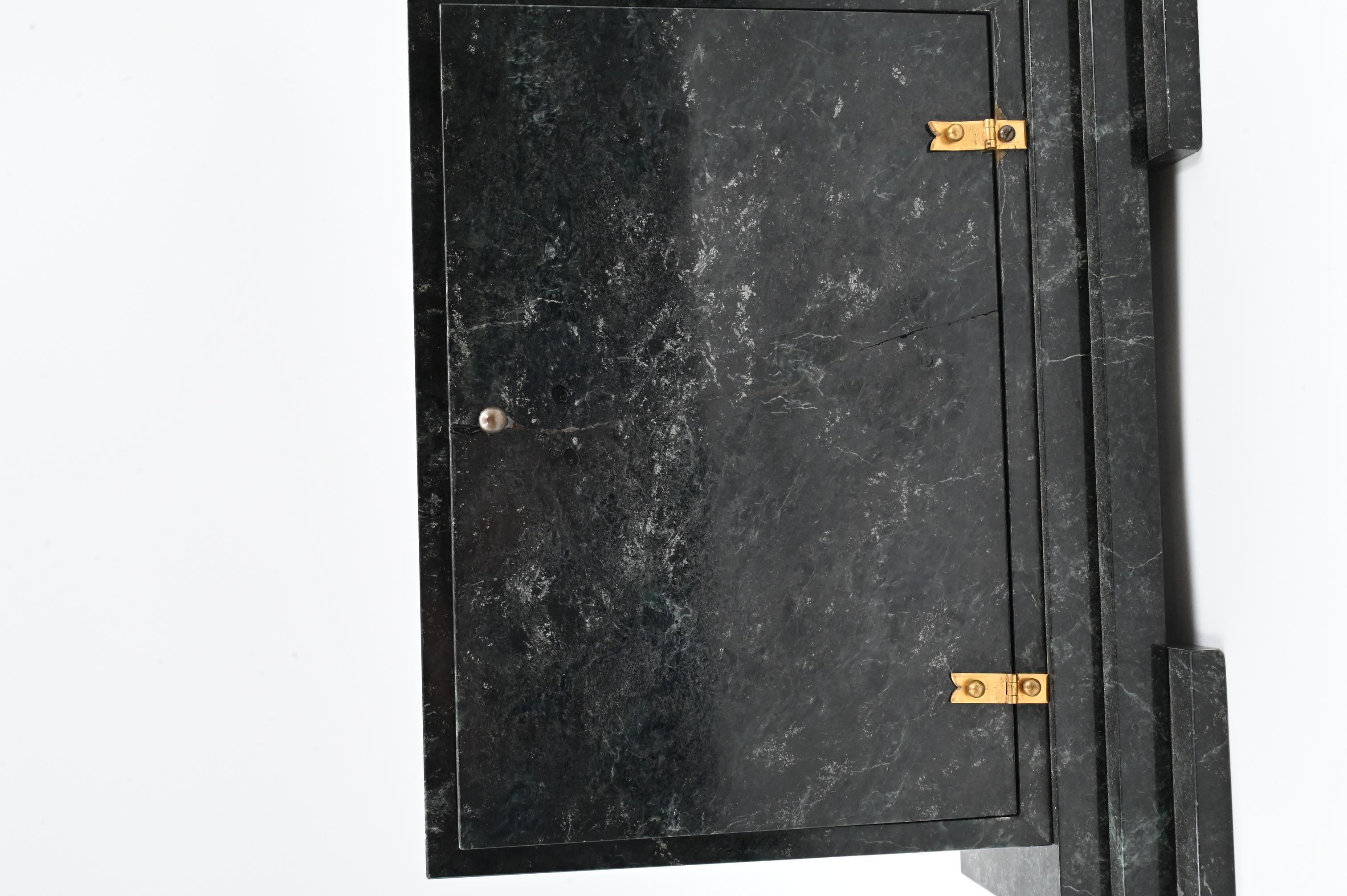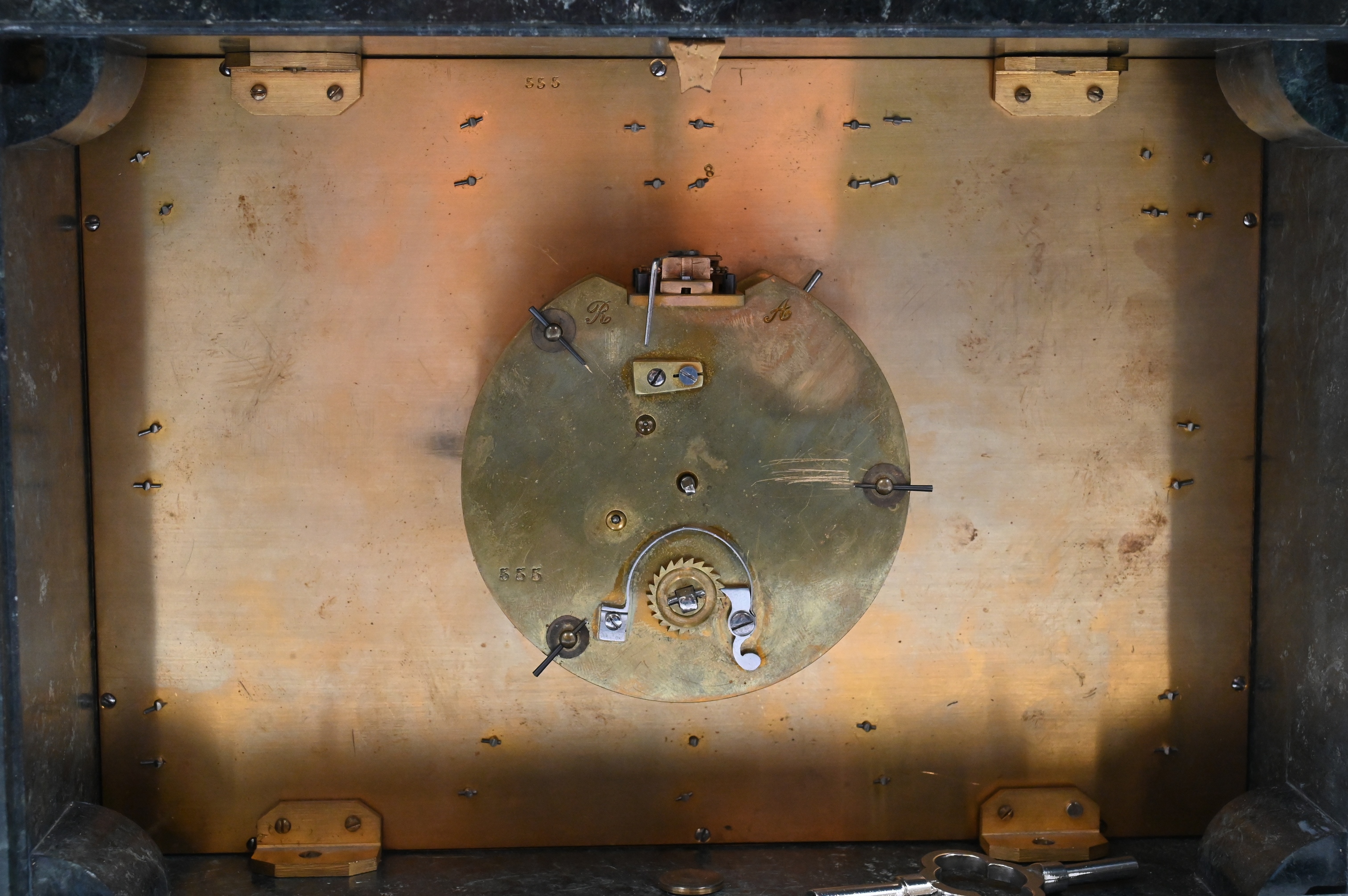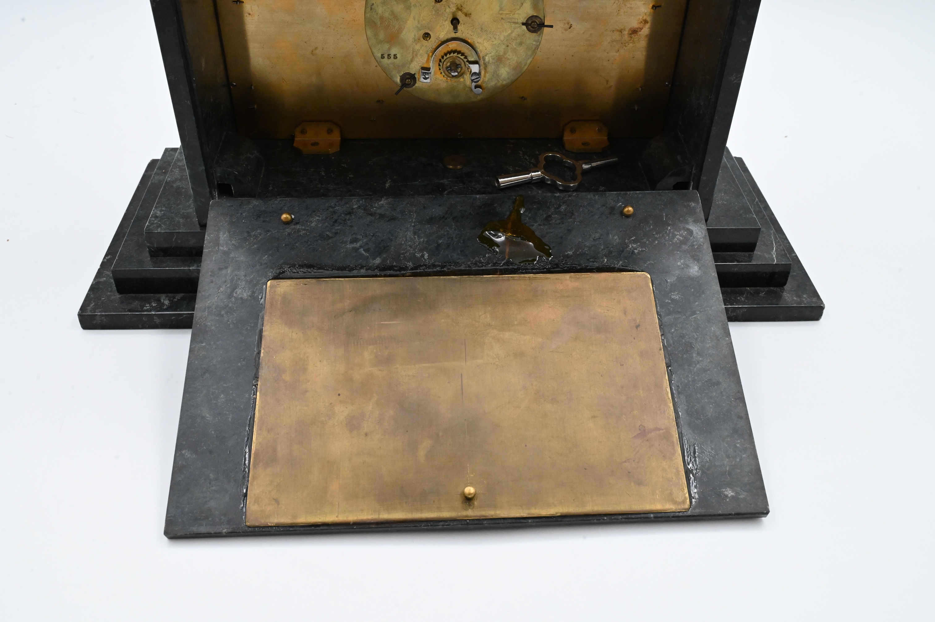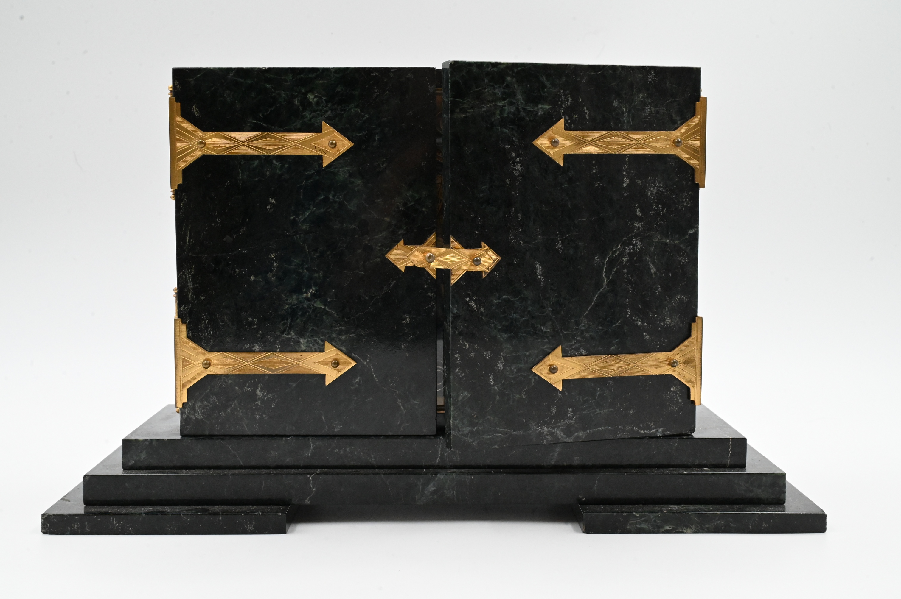 the central panel fitted with an enamel-numbered dial over finely painted watercolor scenes, flanked by two hinged watercolor side panels depicting medieval figures in a wooded landscape,each panel is set in a gilt metal frame and mounted on a stepped green marble base, the clock retains its brass works mounted on a brass plate, the reverse of one panel bears a pencil inscription, appearing to read “Doizece” (or similar), likely the artist’s surname
