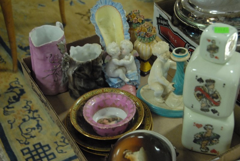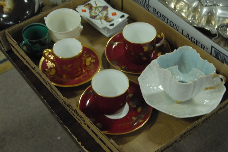 Two box lots to include playing card decanter, small box, cups, and saucers, etc.