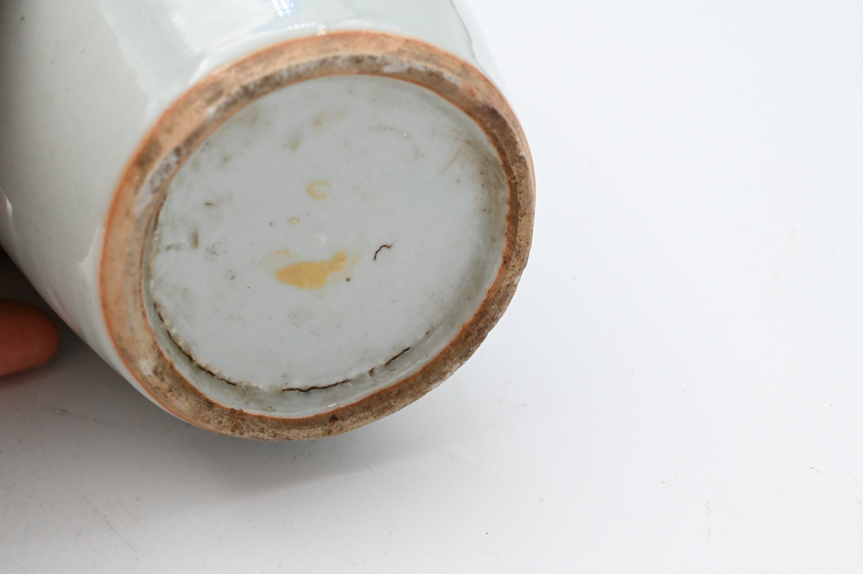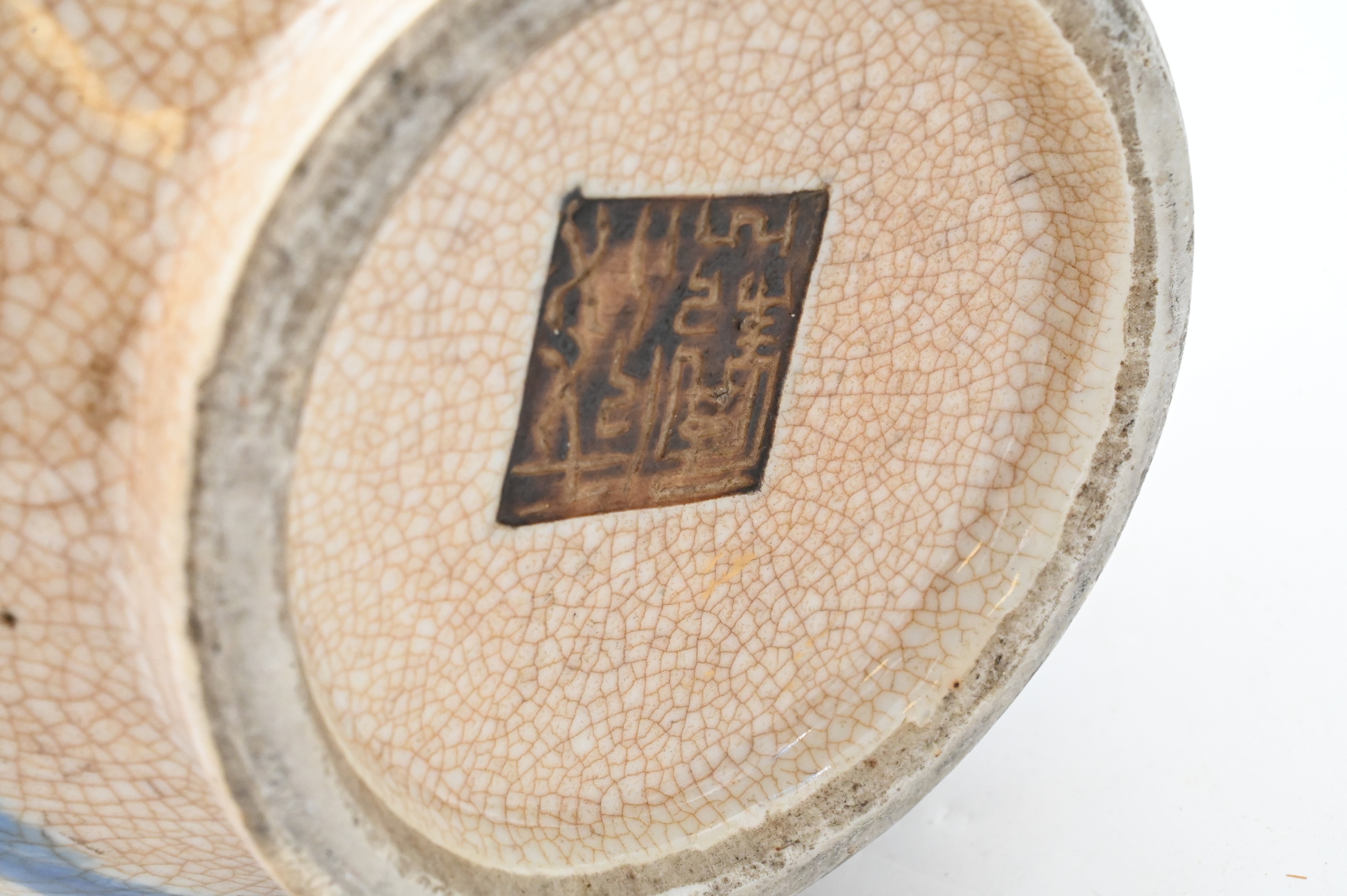 one squat bottle neck vase with crackle glaze and falcon in tree branch motif, character mark to underside along with smaller tapering vase with cherry blossom design