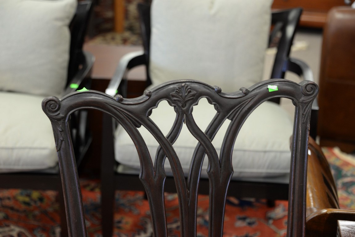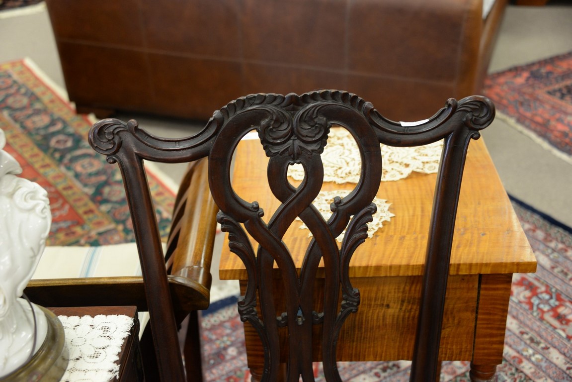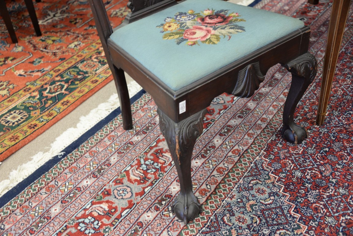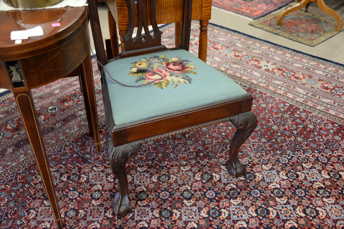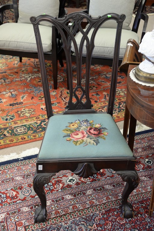 Two custom mahogany Chippendale style side chairs with needlepoint seats.