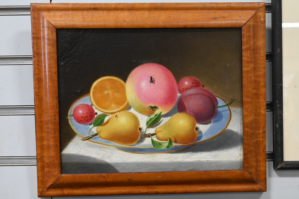 Lot 92: Two Framed Pieces, to include still life of fruit on a plate, oil on board, signed illegibly lower left, 1884, 8 1/2″ x 10 1/2″; alo…