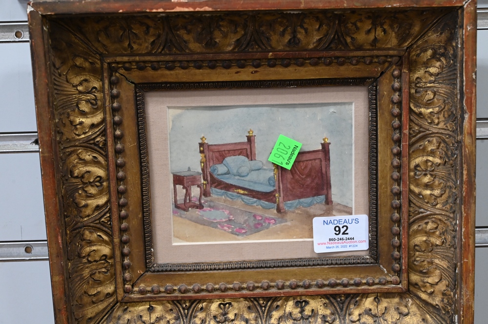 Two Framed Pieces, to include still life of fruit on a plate, oil on board, signed illegibly lower left, 1884, 8 1/2″ x 10 1/2″; along with a watercolor of a bed, signed lower right, 4″ x 5″.