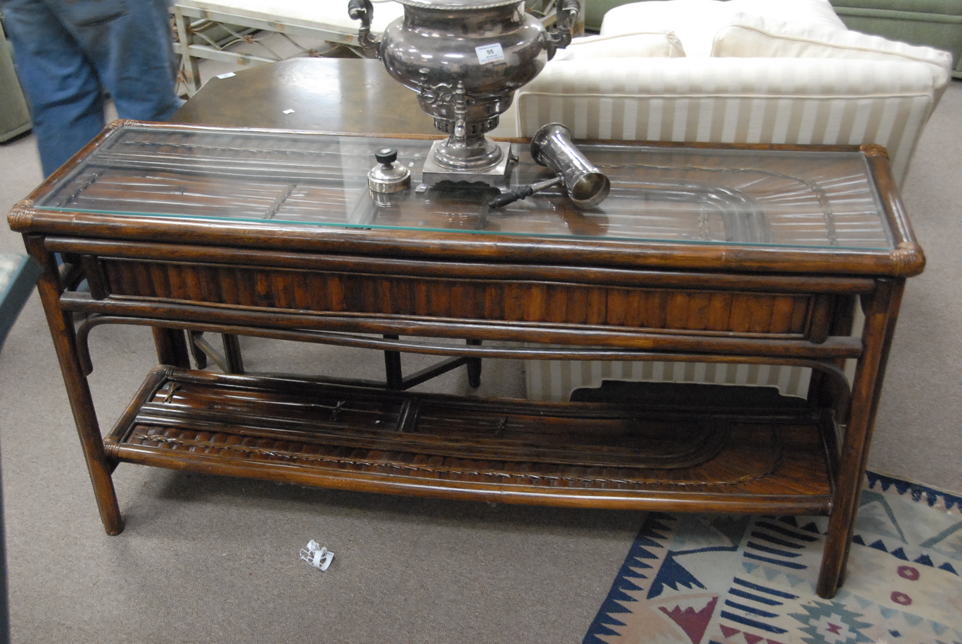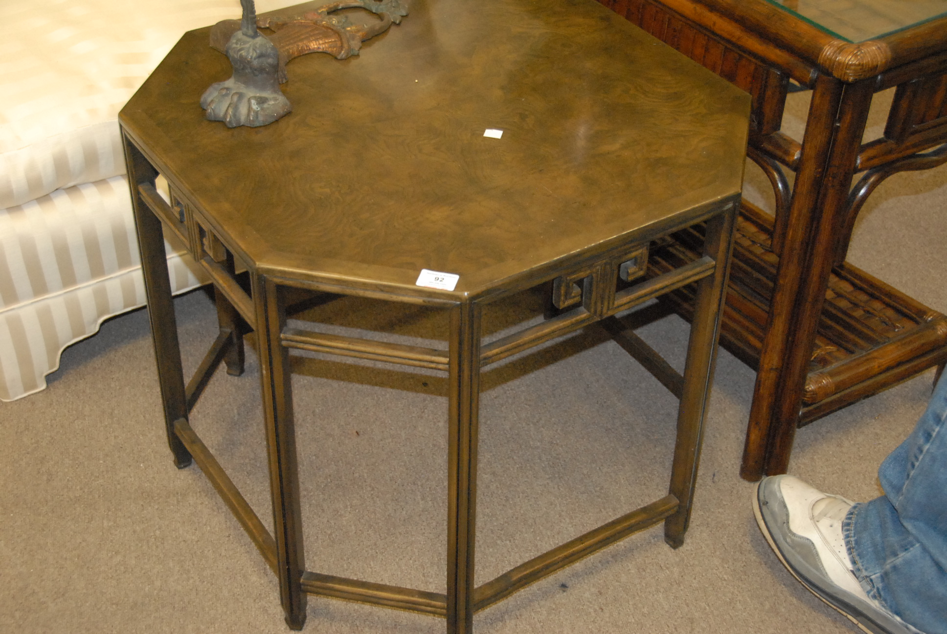 Lot 92: Two piece lot to include rattan and glass top sofa table lg. 53in. ht. 26in. and Baker burl wood octagon table ht. 22in. top: 26 …