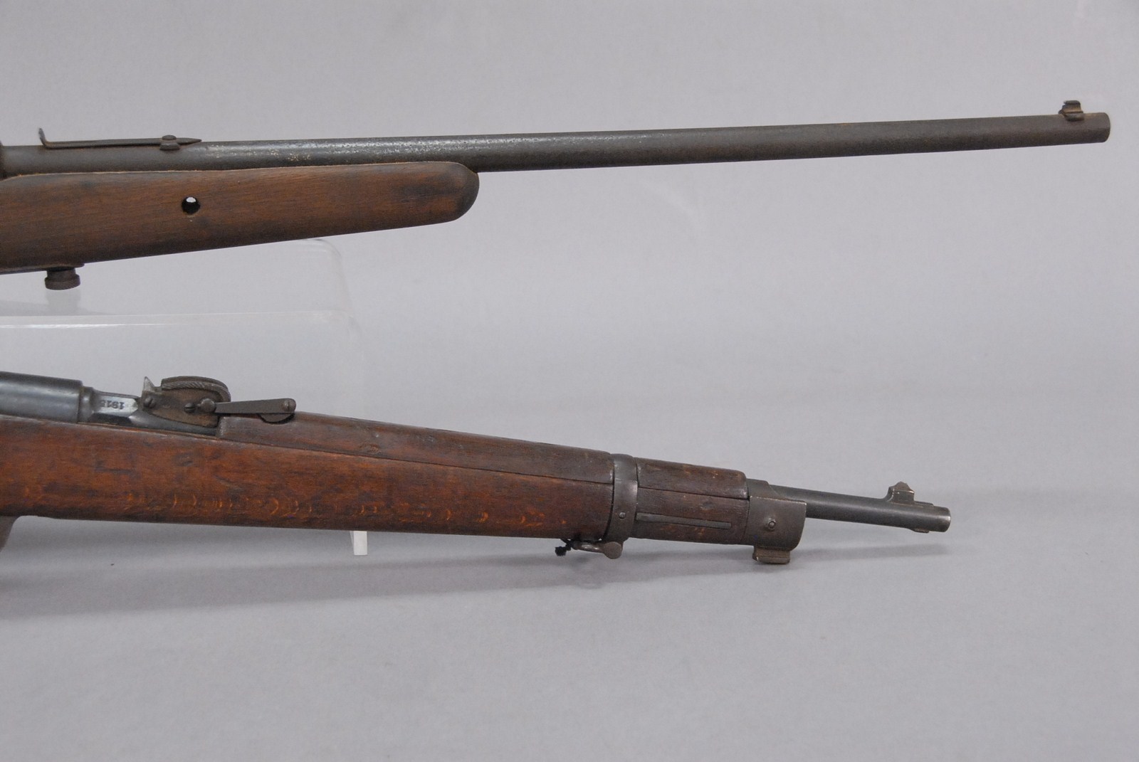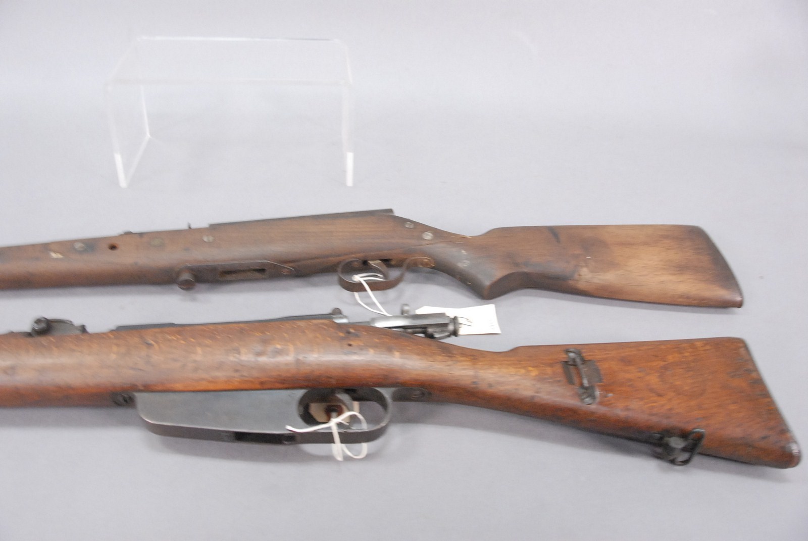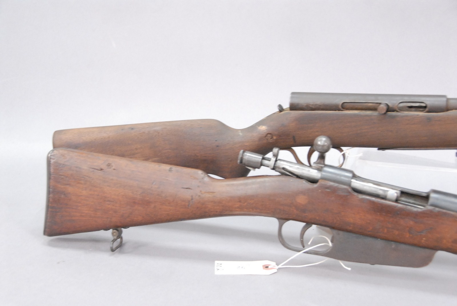 Two rifles. 1 Brescia 1891 rifle, 6.5 mm, 17 1/4 barrel, bolt action. 120 SN-S4447 and 2 Ranger 34A rifle, .22 caliber as is. 54 SN-None
