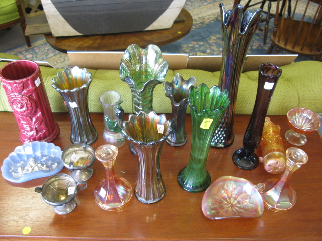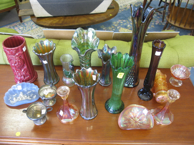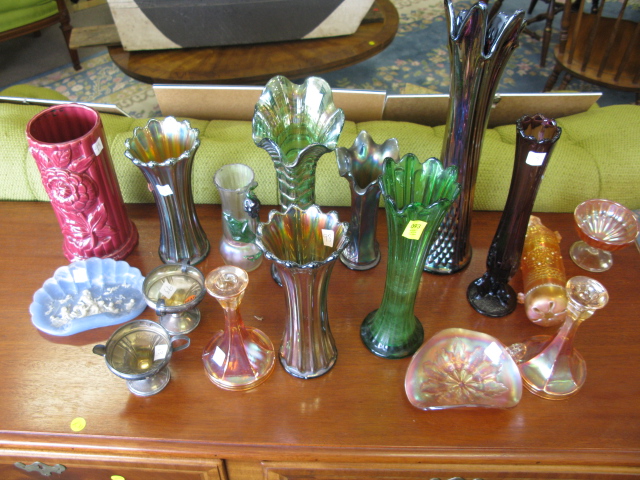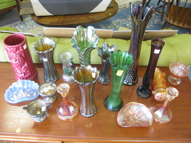 15 pc. lot including carnival glass, vases, candlesticks, small dish, & weighted sterling silver sugar & creamer, etc.