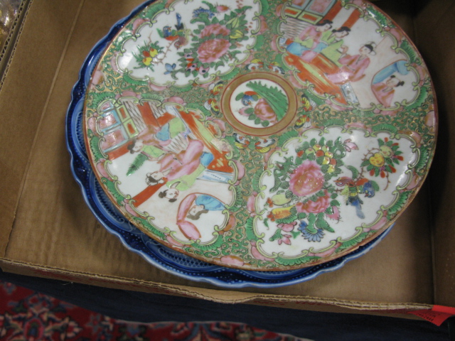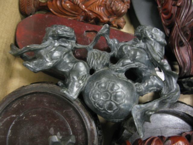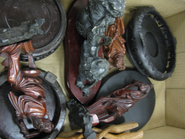4 box lots of Oriental items to include stone carved figures, cinnabar vases, Imari plate, Japanese plates, Rose Medallion plates, small table screen, chopsticks etc