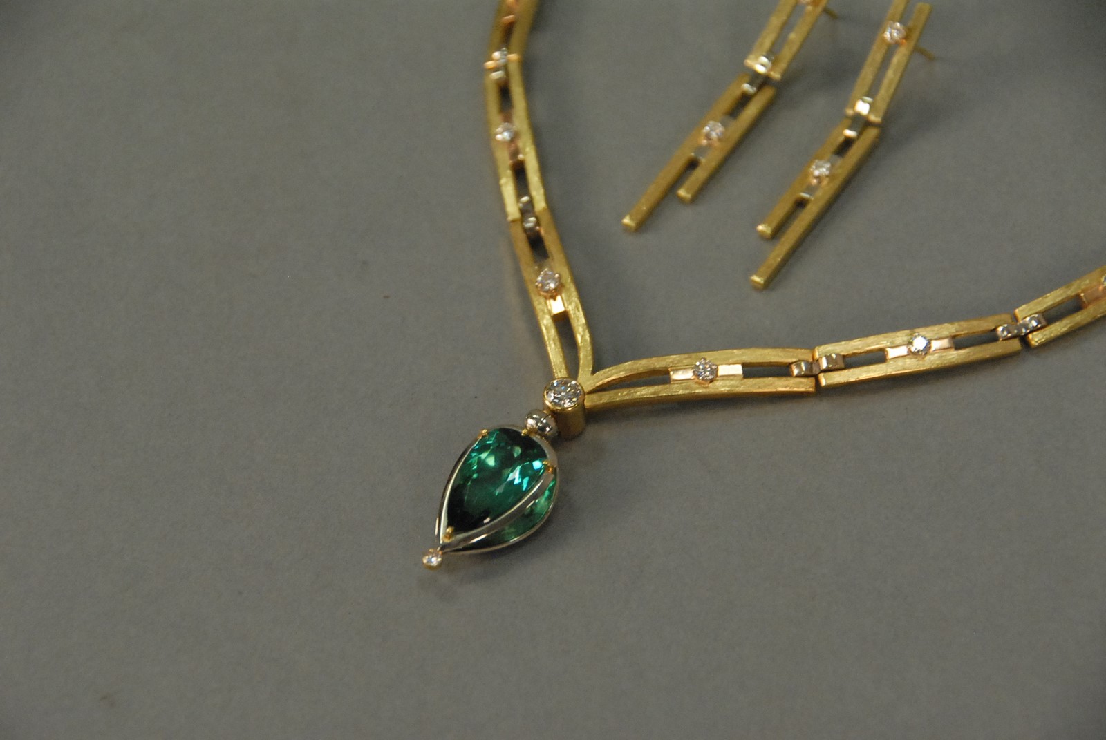 Alberto Becker 18K gold convertible collier and matching earrings, collier with one diamond .46 cts plus fourteen small diamonds having removable 7.38 ct tourmaline earrings having two diamonds each with all original paperwork and key to remove tourmaline pendant. 95.1 total grams