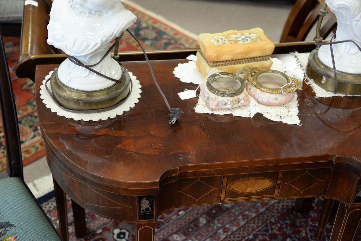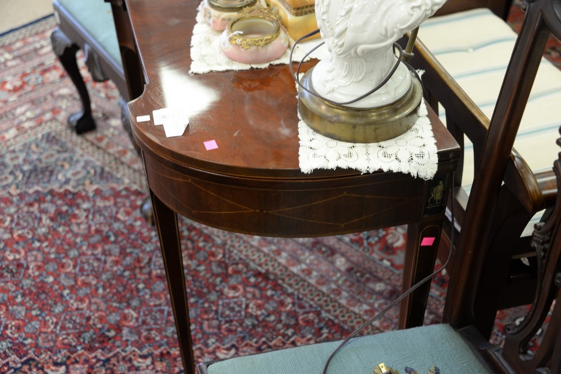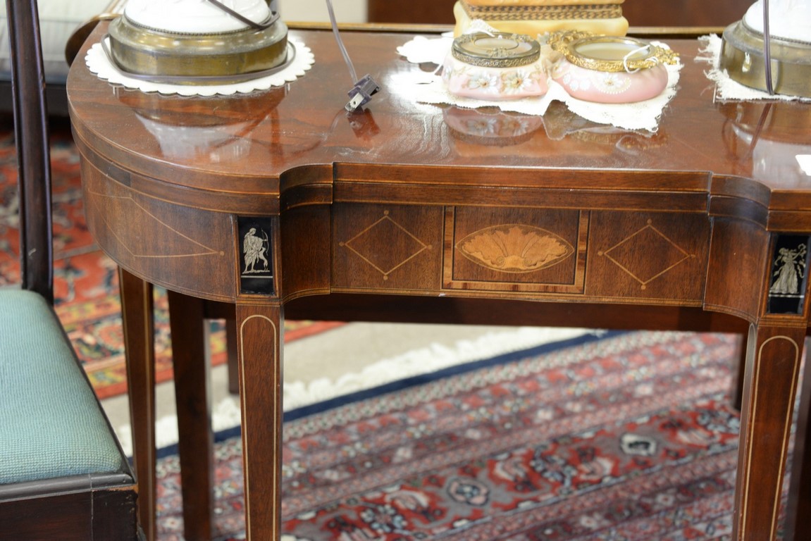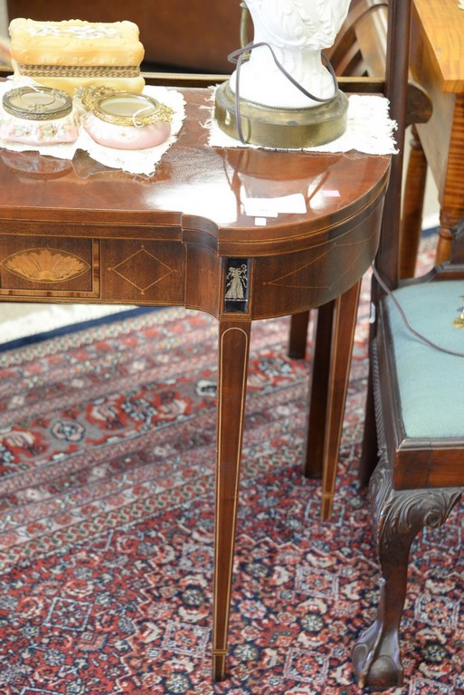 Lot 93: Baker Historic Charleston, Baltimore style mahogany inlaid game table with inlaid glass panels. ht. 29 in. wd. 36 in. dp. 17 in.