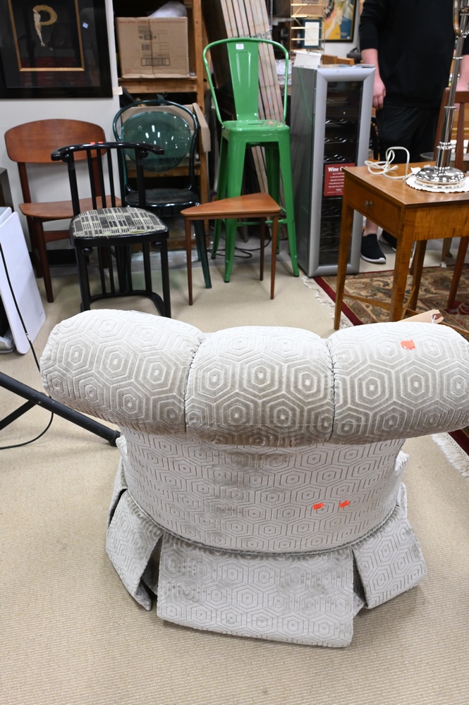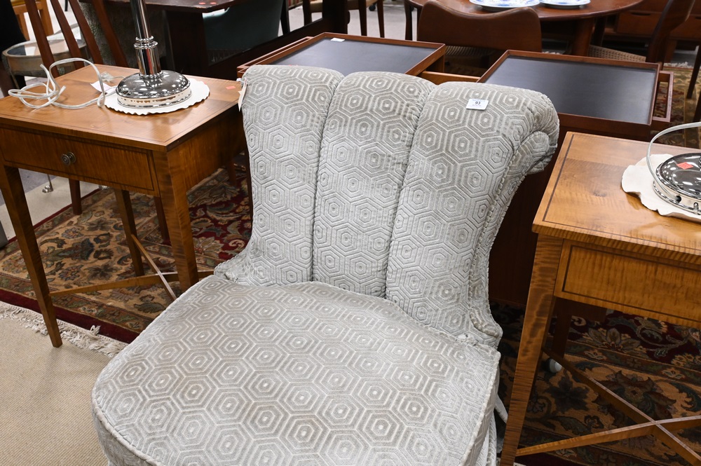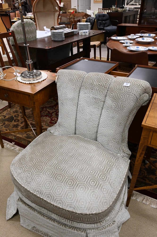 Lot 93: Century Furniture Company Gray Upholstered Boudoir Chair, with rolled back, seat height 20 inches, height to top of back 33 inches.