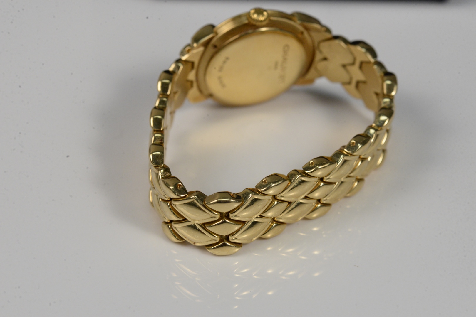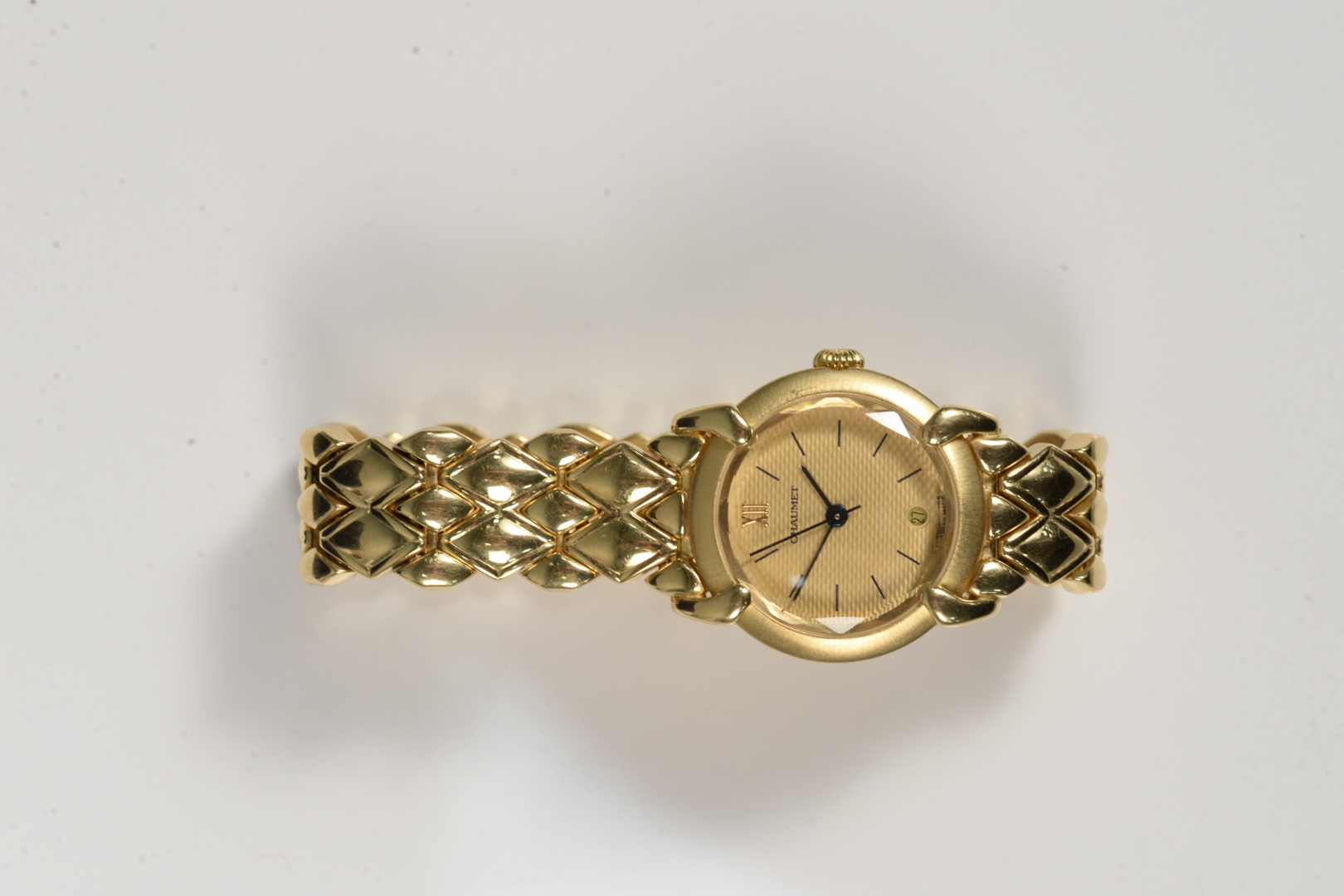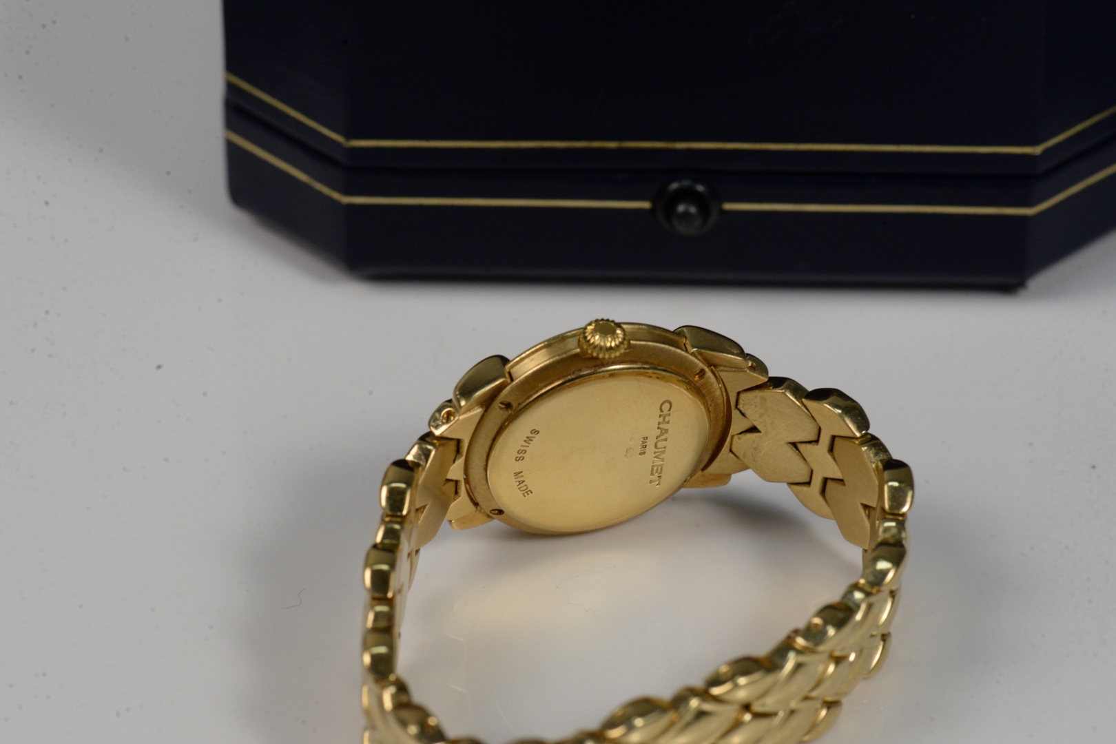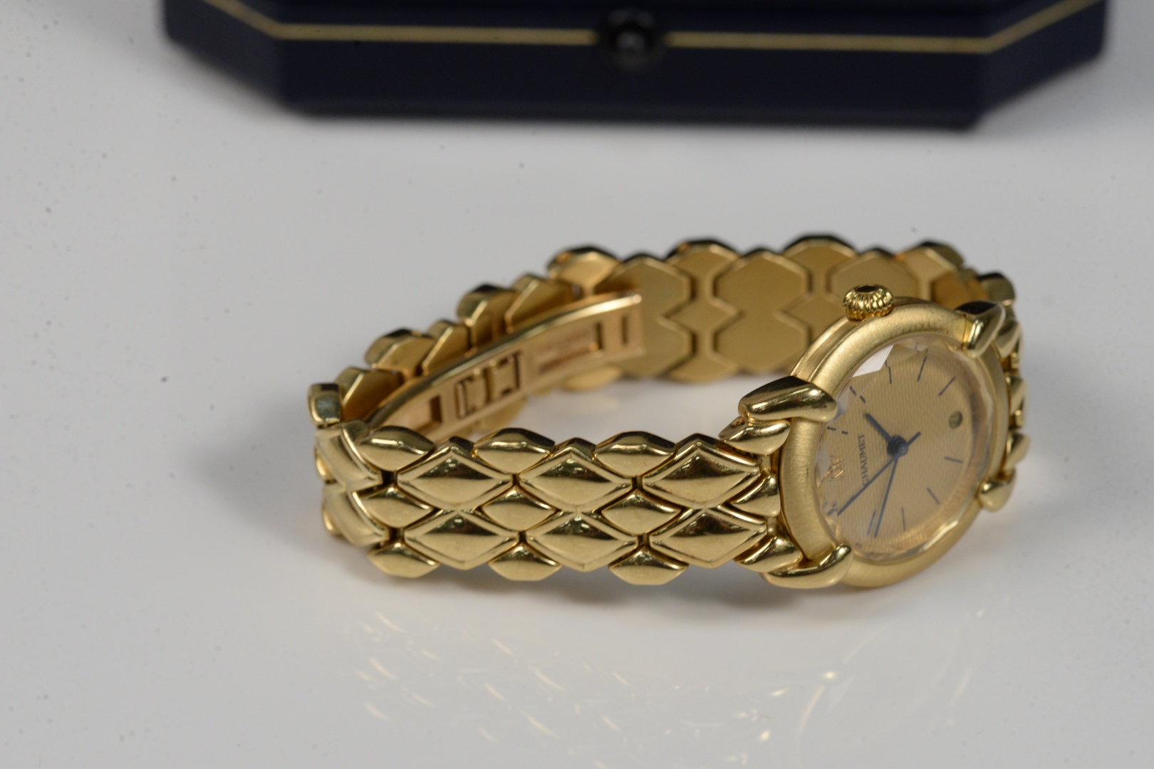 Lot 93: Chaumet 18 Karat Gold Ladies Watch with 18K Gold Band in original box 26.3 millimeters total weight 90 grams