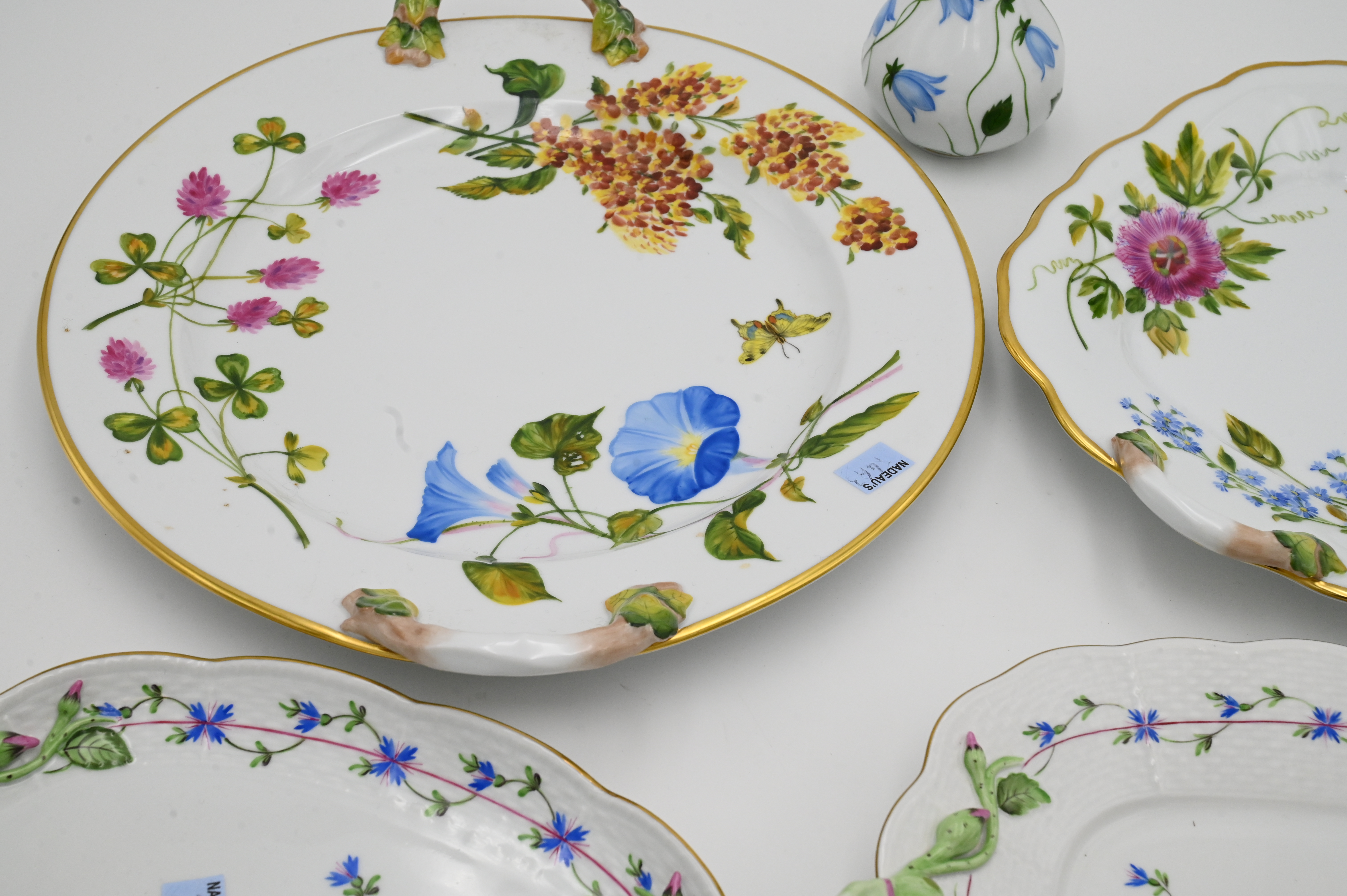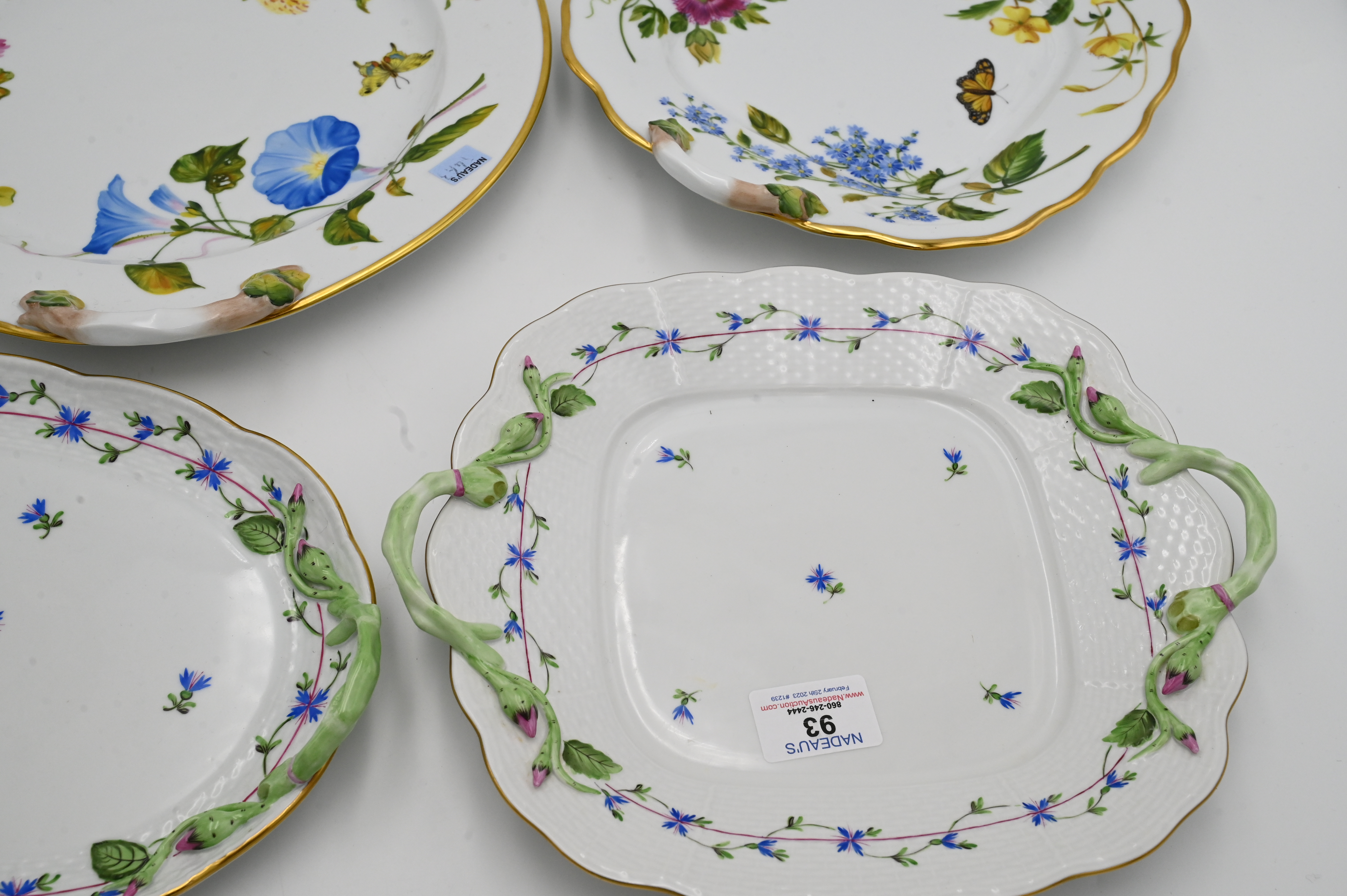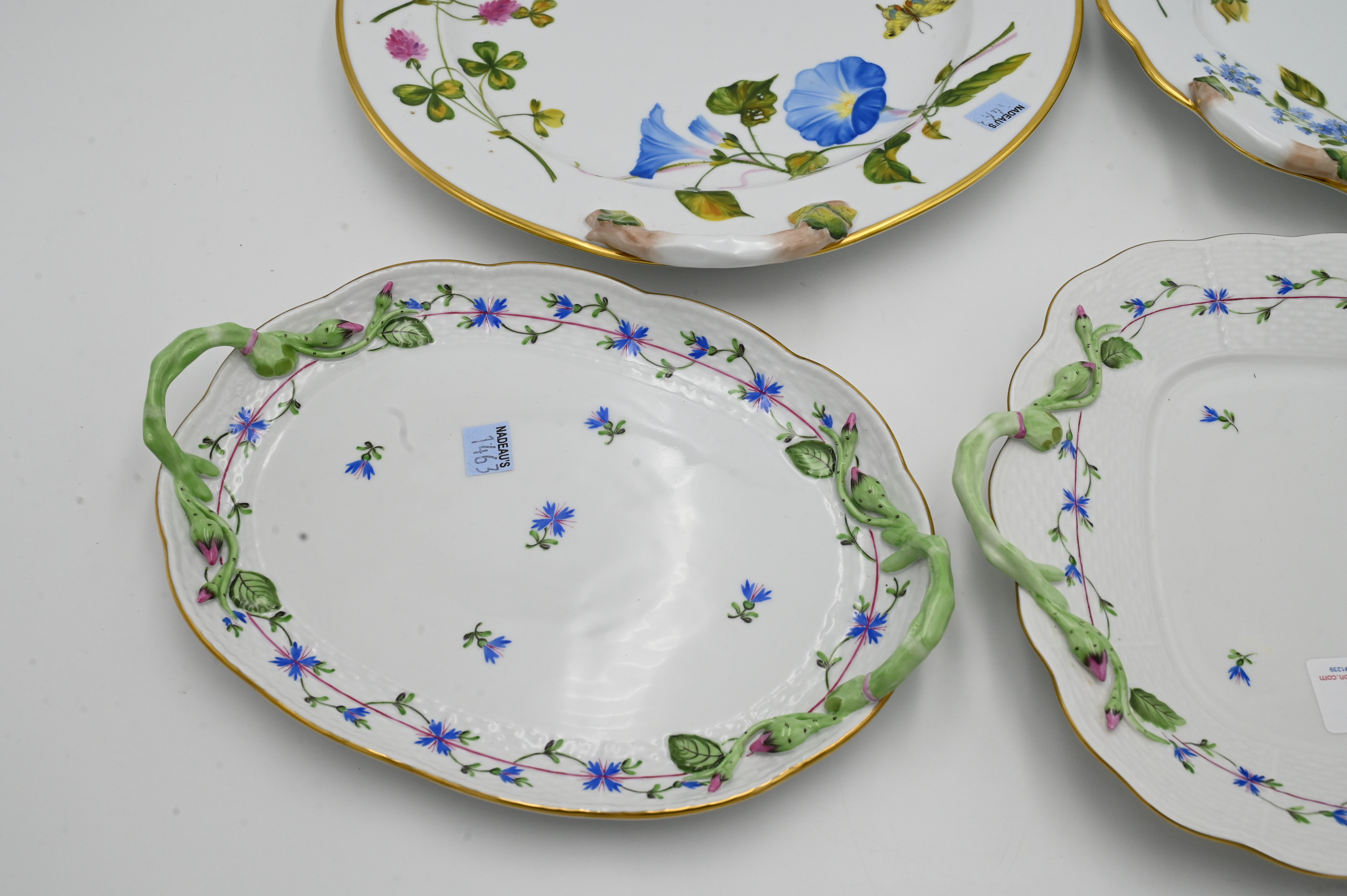 Five Herend Platters with Handles, along with a bottle vase, longest 13 1/2 inches.