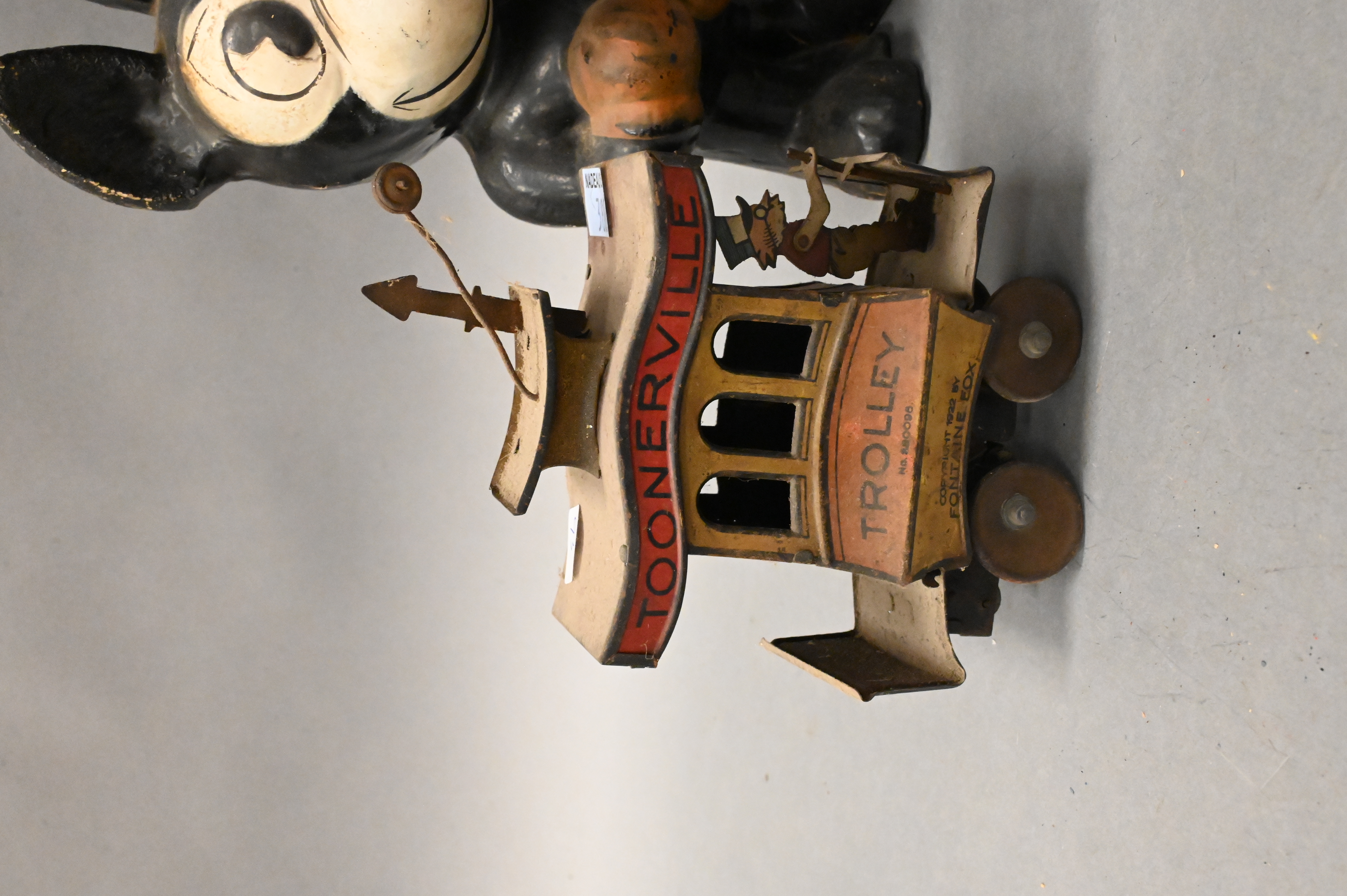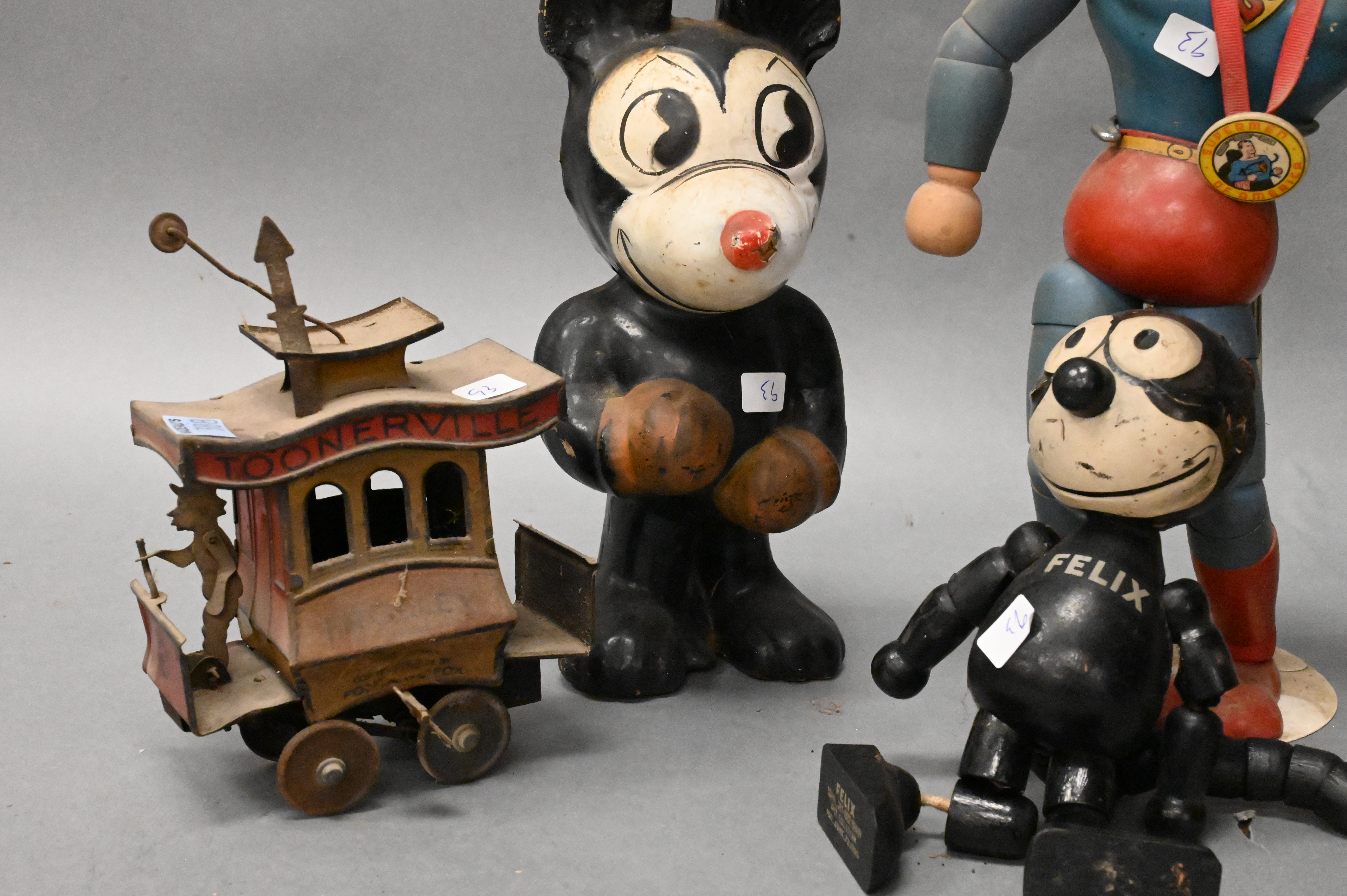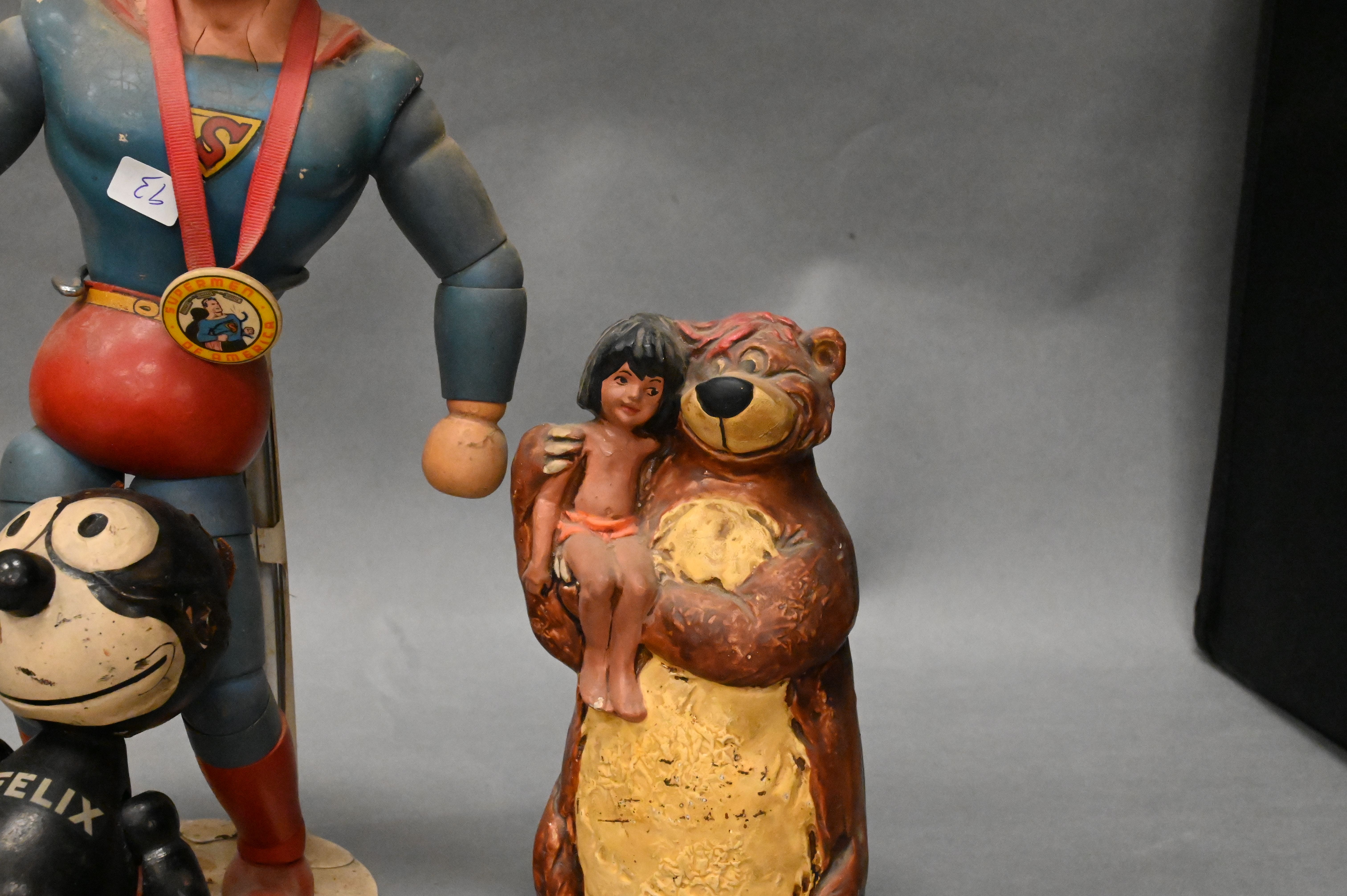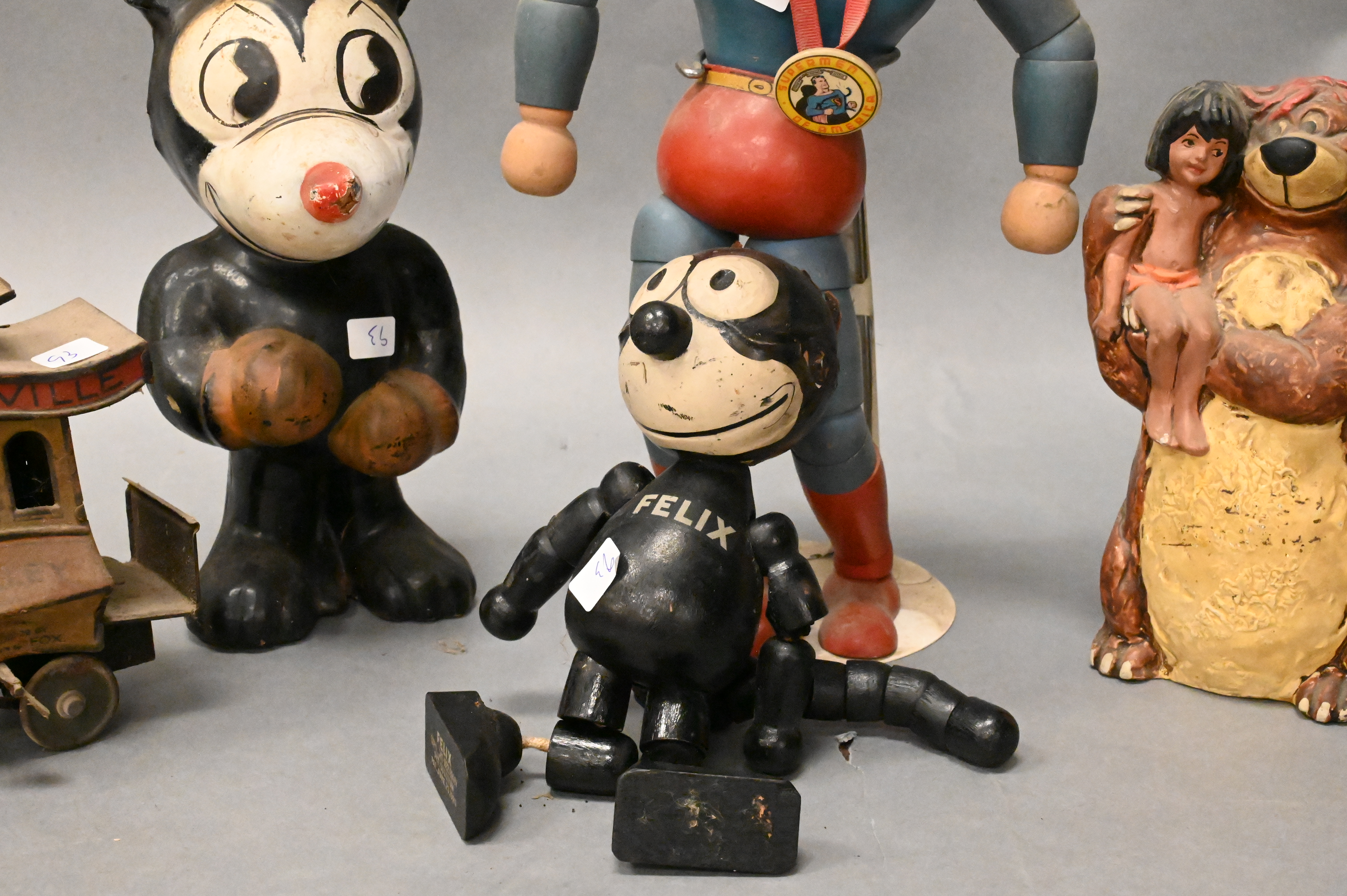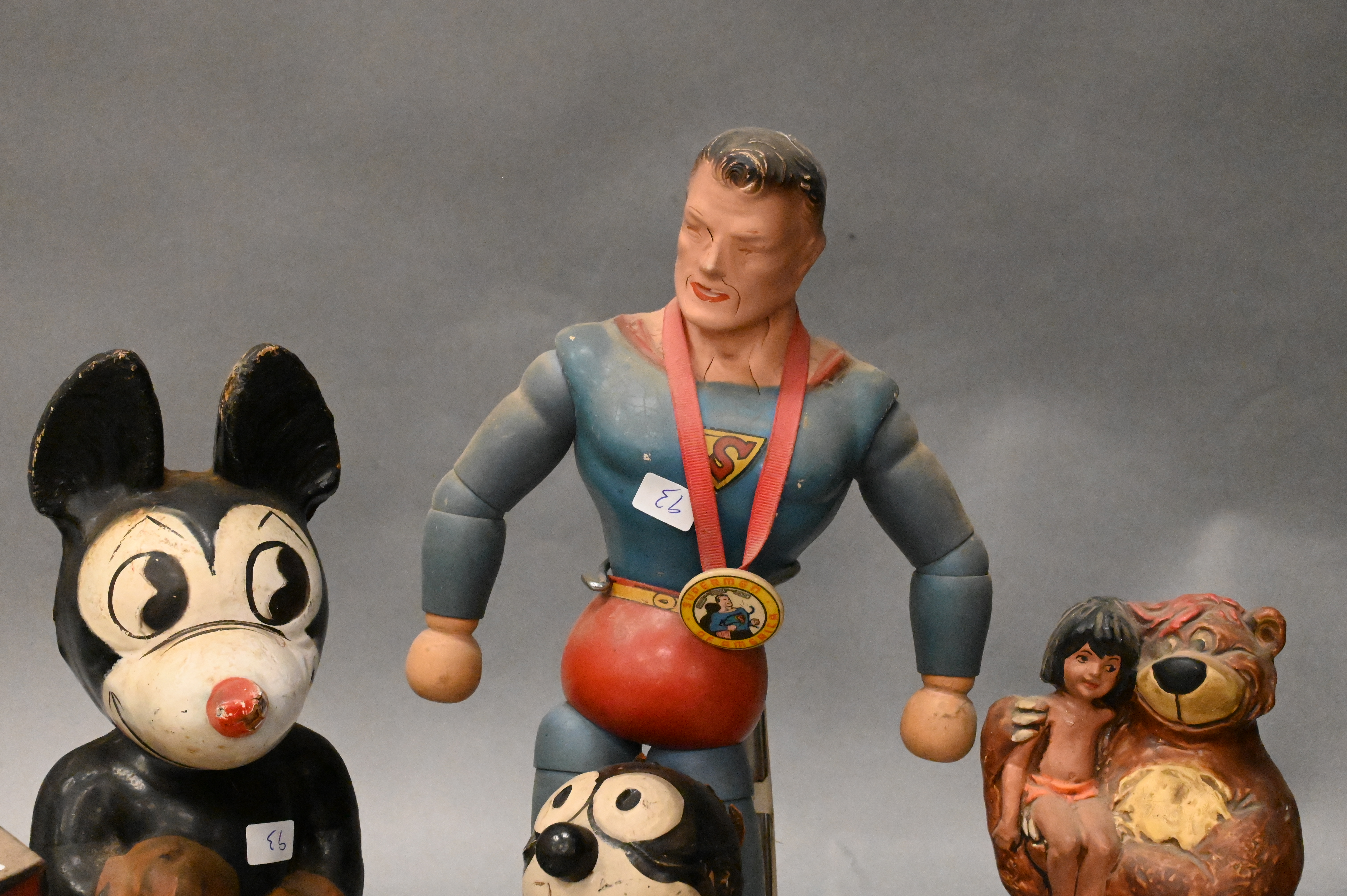 Superman wood and composition jointed doll Ideal 1940, this is the first Superman action figure sold by Ideal novelty and toy company, Walt Disney MCMLXV bear, papier mache Mickey Mouse, painted wood Felix the Cat, and Toonville tin wind up train