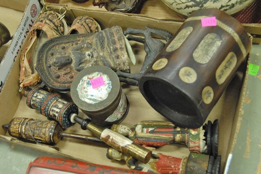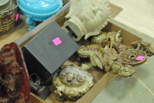 Lot 93: Four box lots of Chinese Asian items to include three piece tea set, two clay figures, bamboo brush pot, two rattles, cinnabar plaqu…
