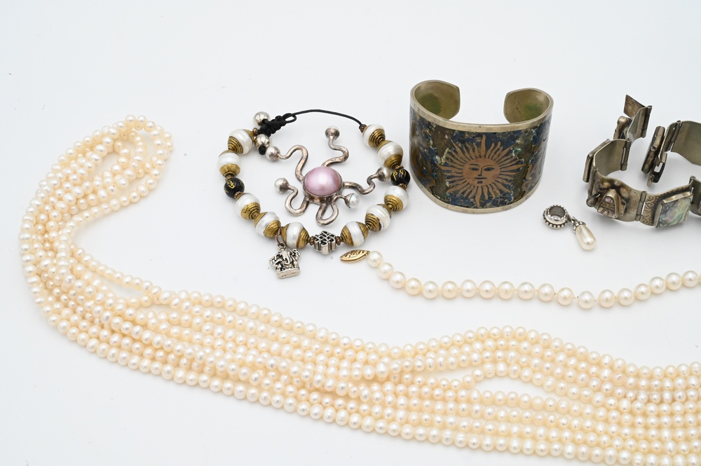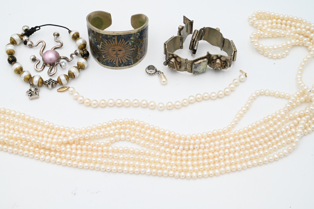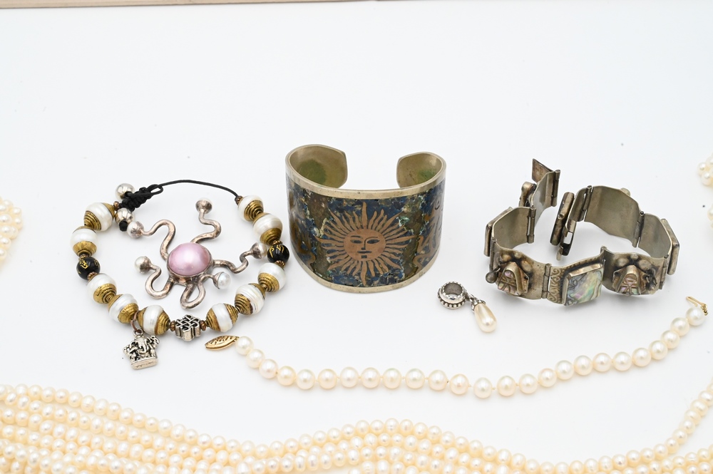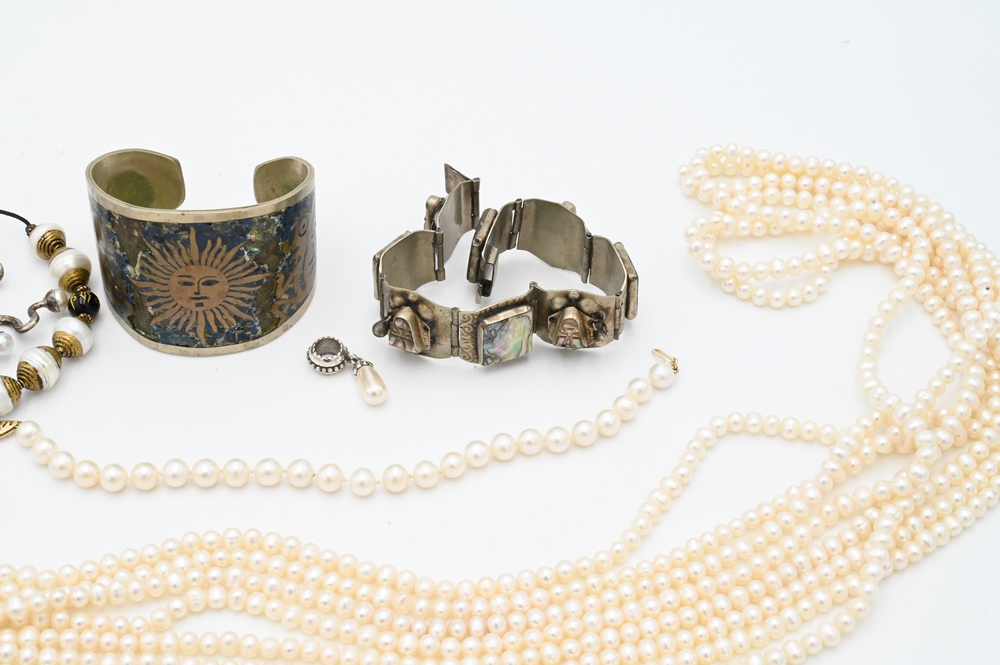 Group of Jewelry, to include two long strings of white pearls, each 100 inches long; a Taxco Mexican silver cuff (as is); sterling silver bracelet; silver pin; along with pearl bracelets.