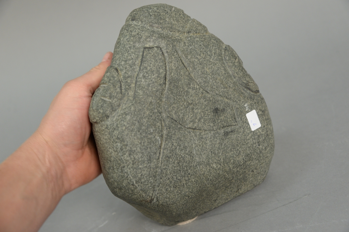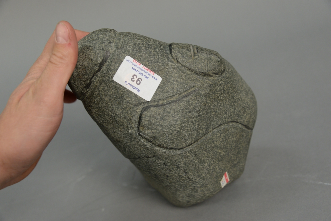 Lot 93: Inuit Eskimo carving Lucy Tasseor Tutsweetok 1934-2012 Arviat Eskimo Point grey soapstone Faces, 8 1/2 x 6 x 7, pedestal ht. …