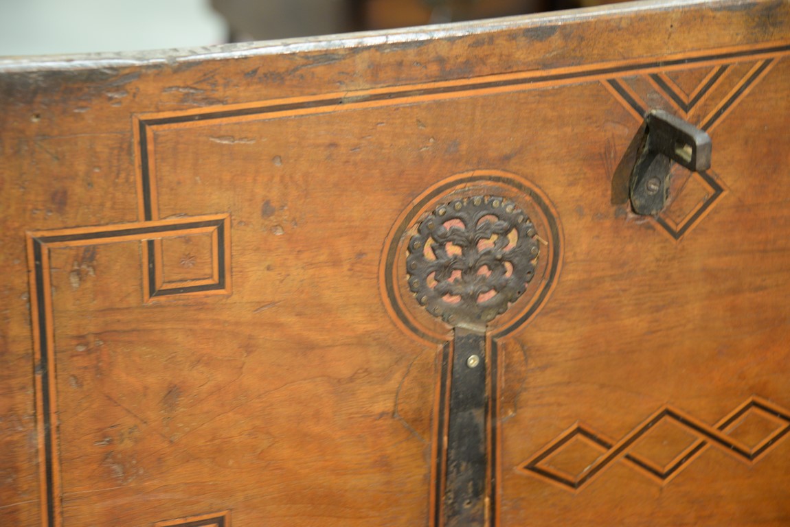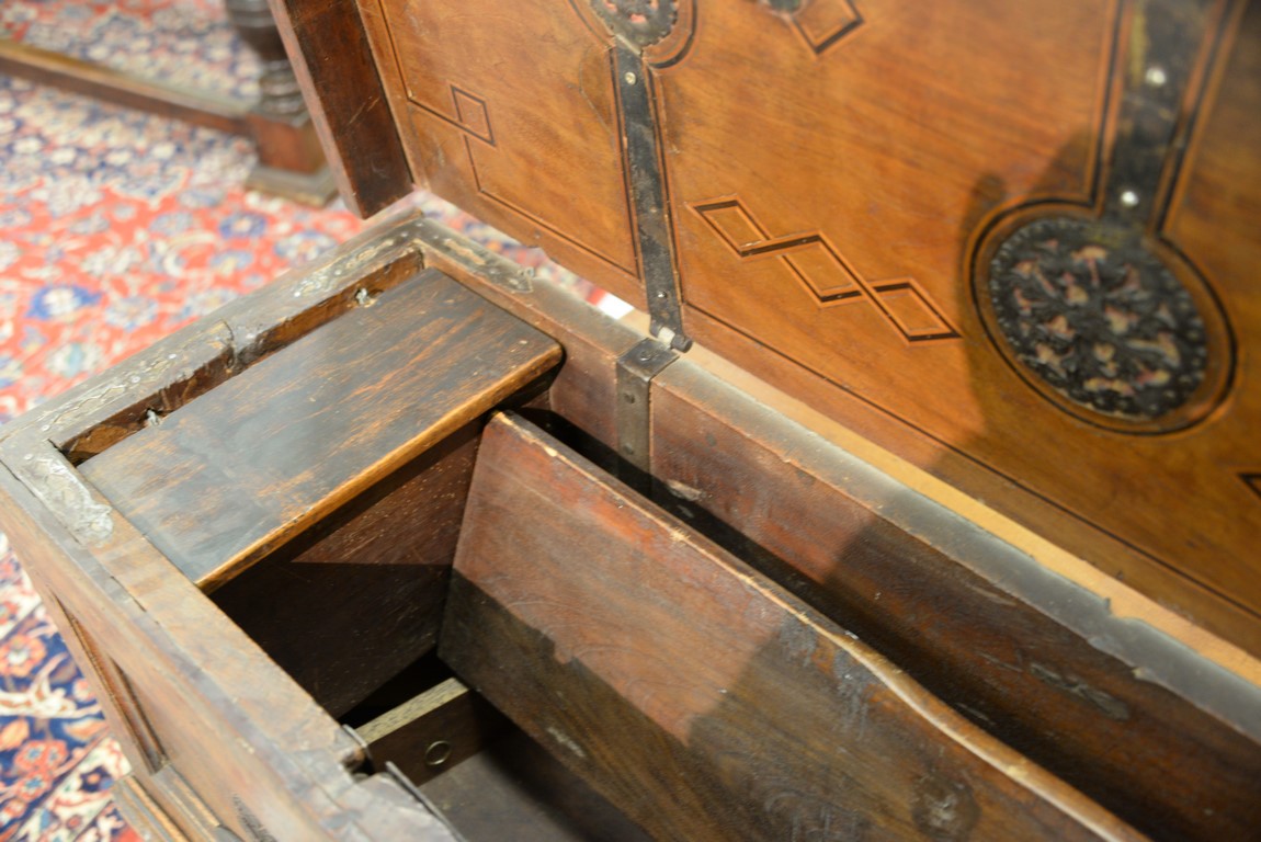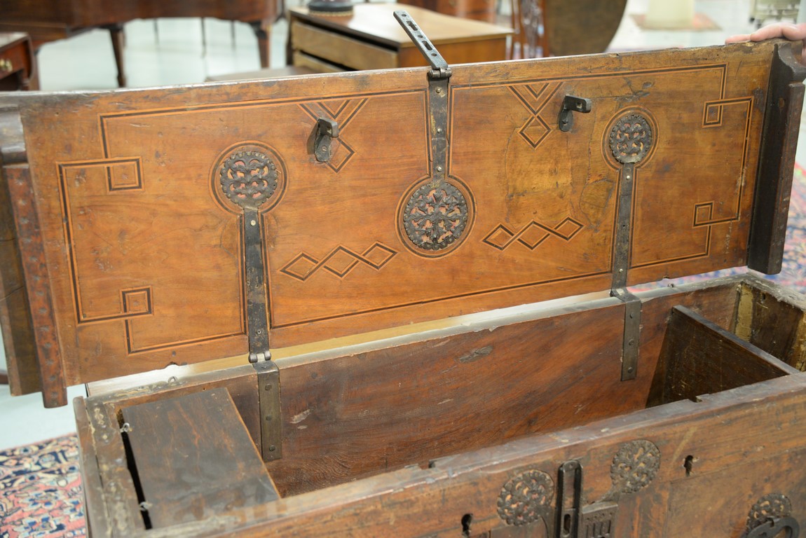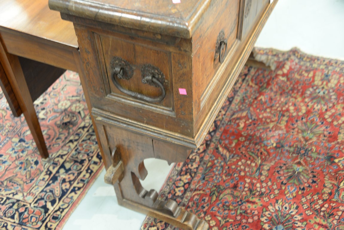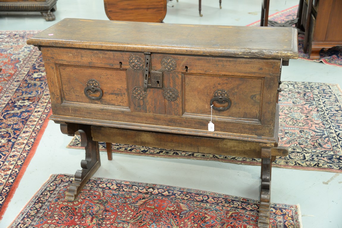 Lot 93: Italian lift top chest having inlaid rectangular lift top opening to reveal inlaid interior lid, false bottom, and two tills, front having two panels with large hand etched iron decorations and lock all on stand with tressel type base, walnut probabl