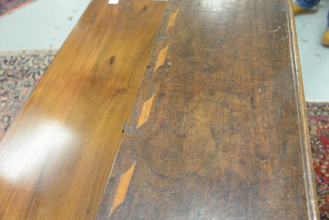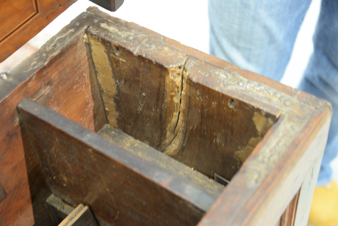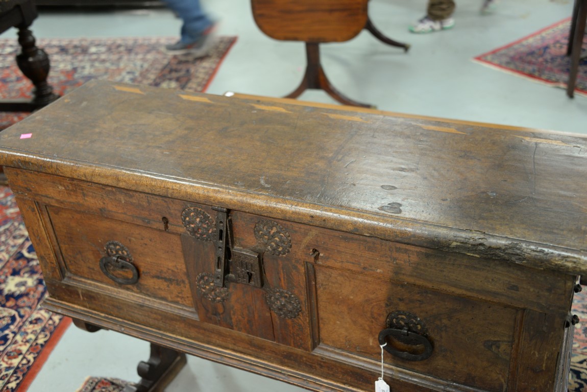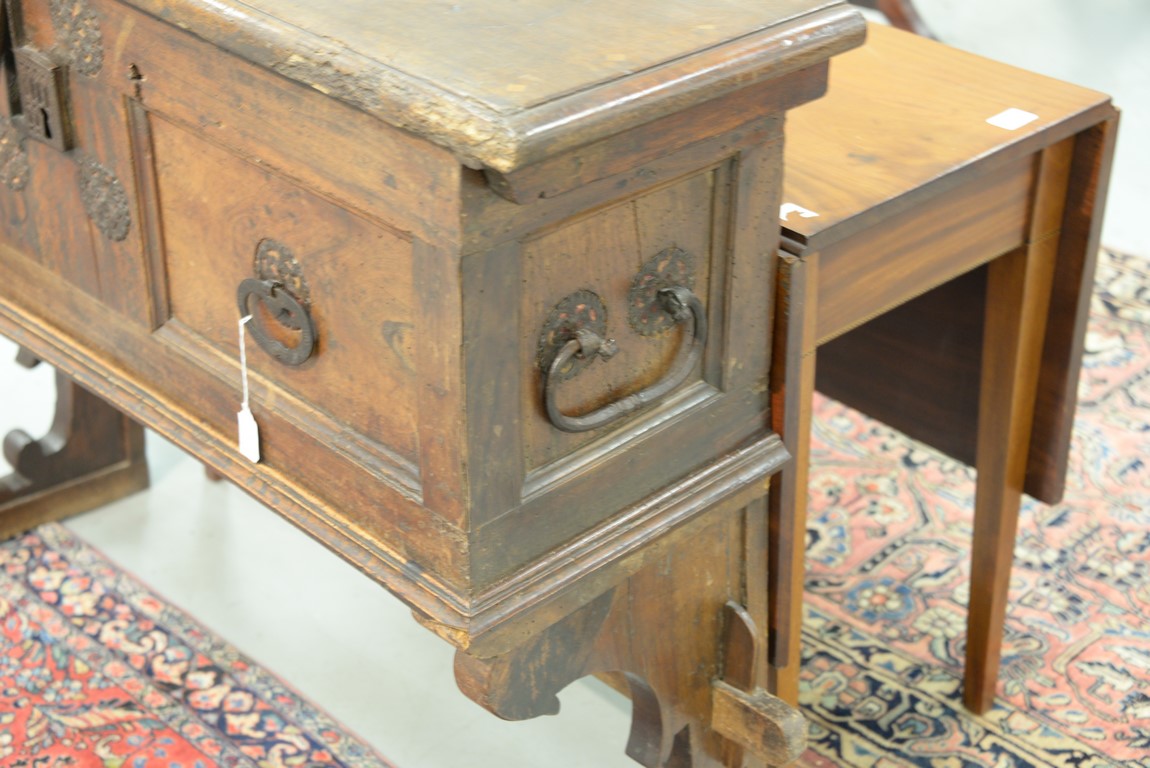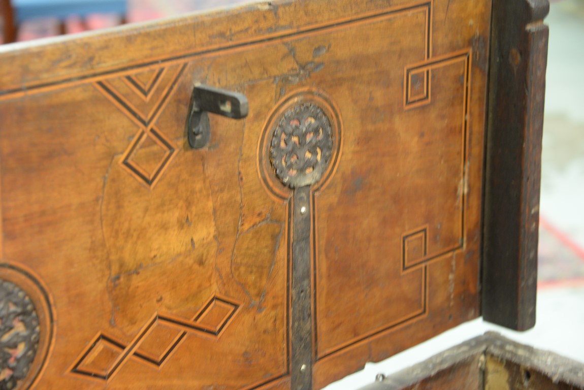 Lot 93: Italian lift top chest having inlaid rectangular lift top opening to reveal inlaid interior lid, false bottom, and two tills, front having two panels with large hand etched iron decorations and lock all on stand with tressel type base, walnut probabl