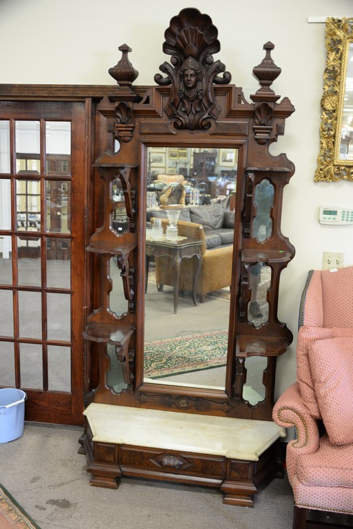 Large Victorian walnut etagere with carved shell over bust having large mirror flanked by three shelves on each side, over marble top base. ht. 31 1/2in., wd. 33in., mirror: 53 x 46