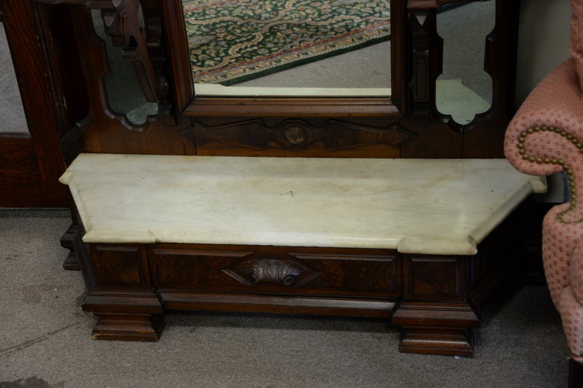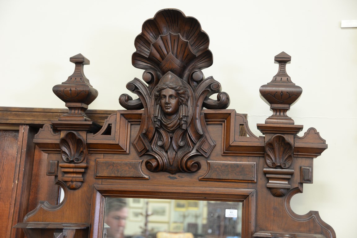 Lot 93: Large Victorian walnut etagere with carved shell over bust having large mirror flanked by three shelves on each side, over marble to…