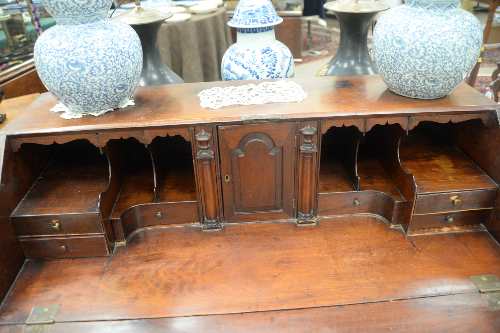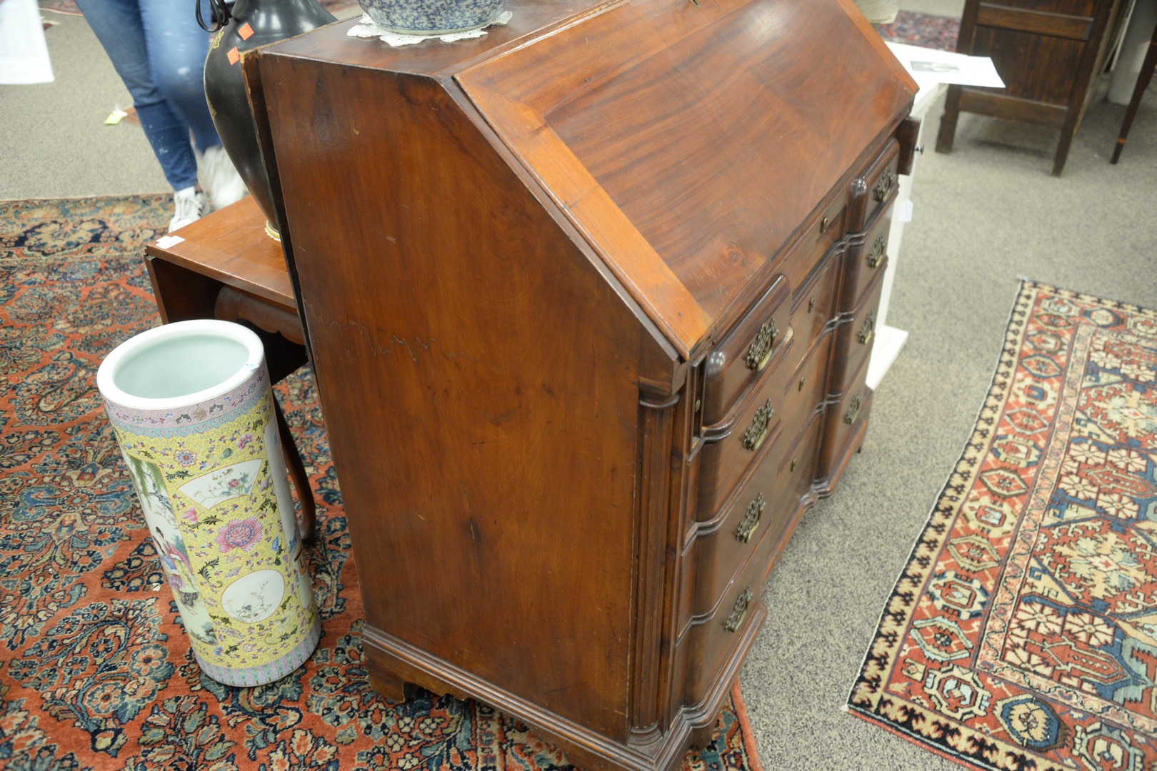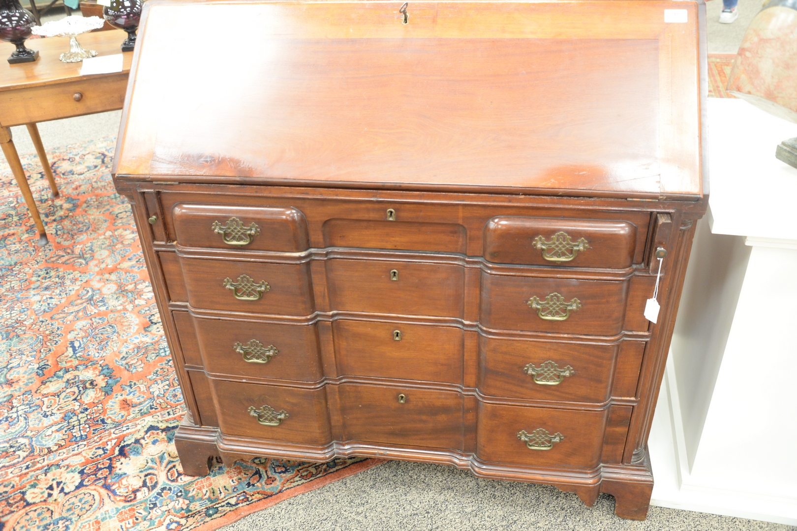 Lot 93: Mahogany Chippendale Desk having slant lid and blocked front on bracket base, all 4 drawer bottoms replaced, circa 1760, height 42 1/2 inches, width 42 3/4 inches.