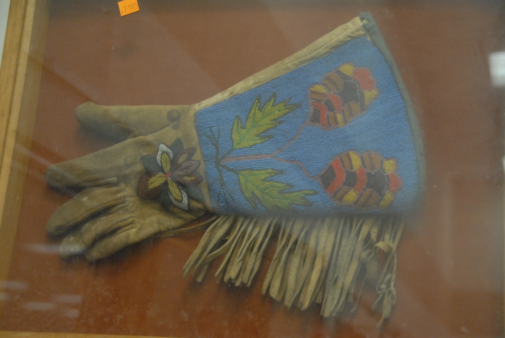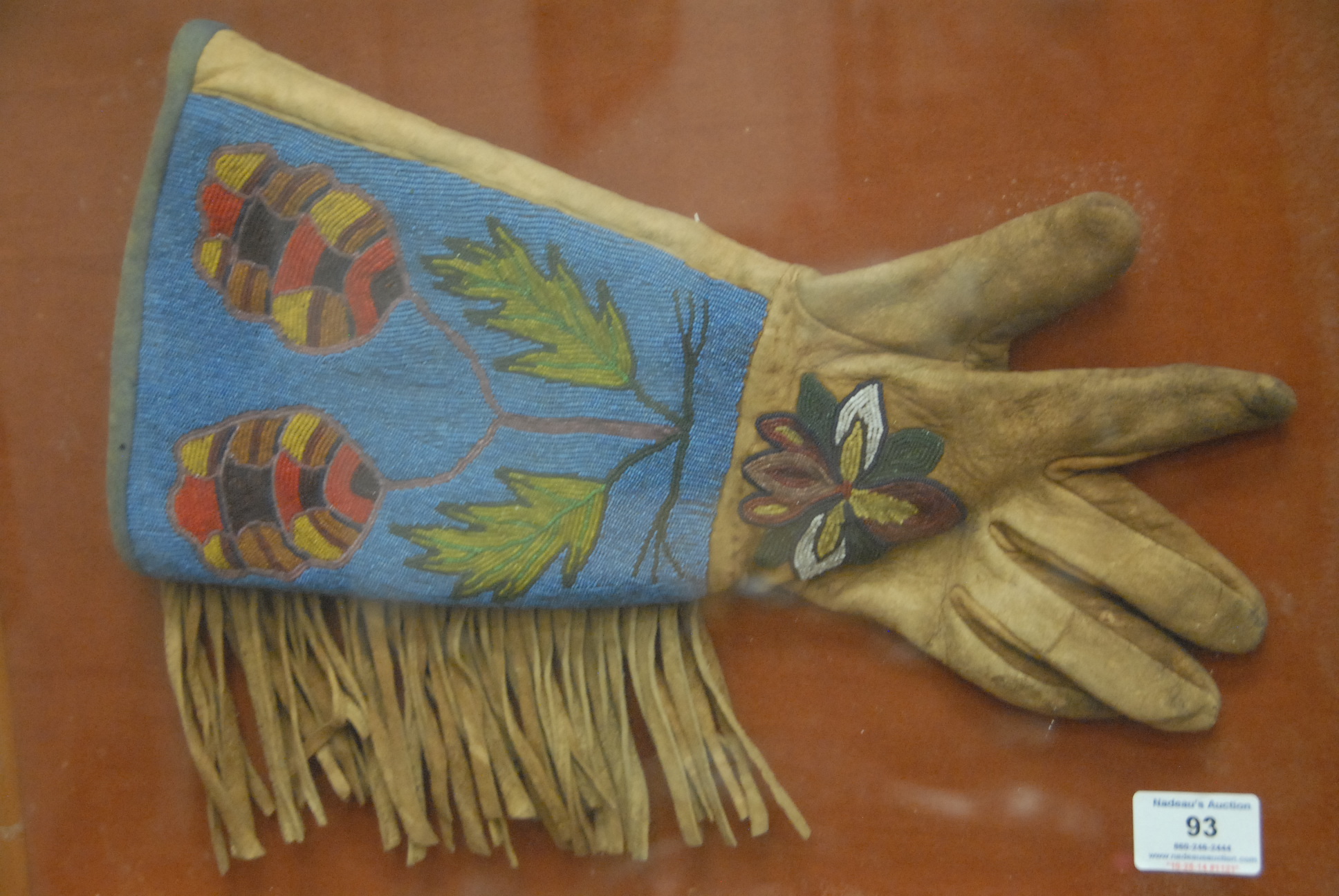 Lot 93: Pair of leather beaded Indian gloves with intricate bead work, each in shadow box frames. frame size: 17 x 21