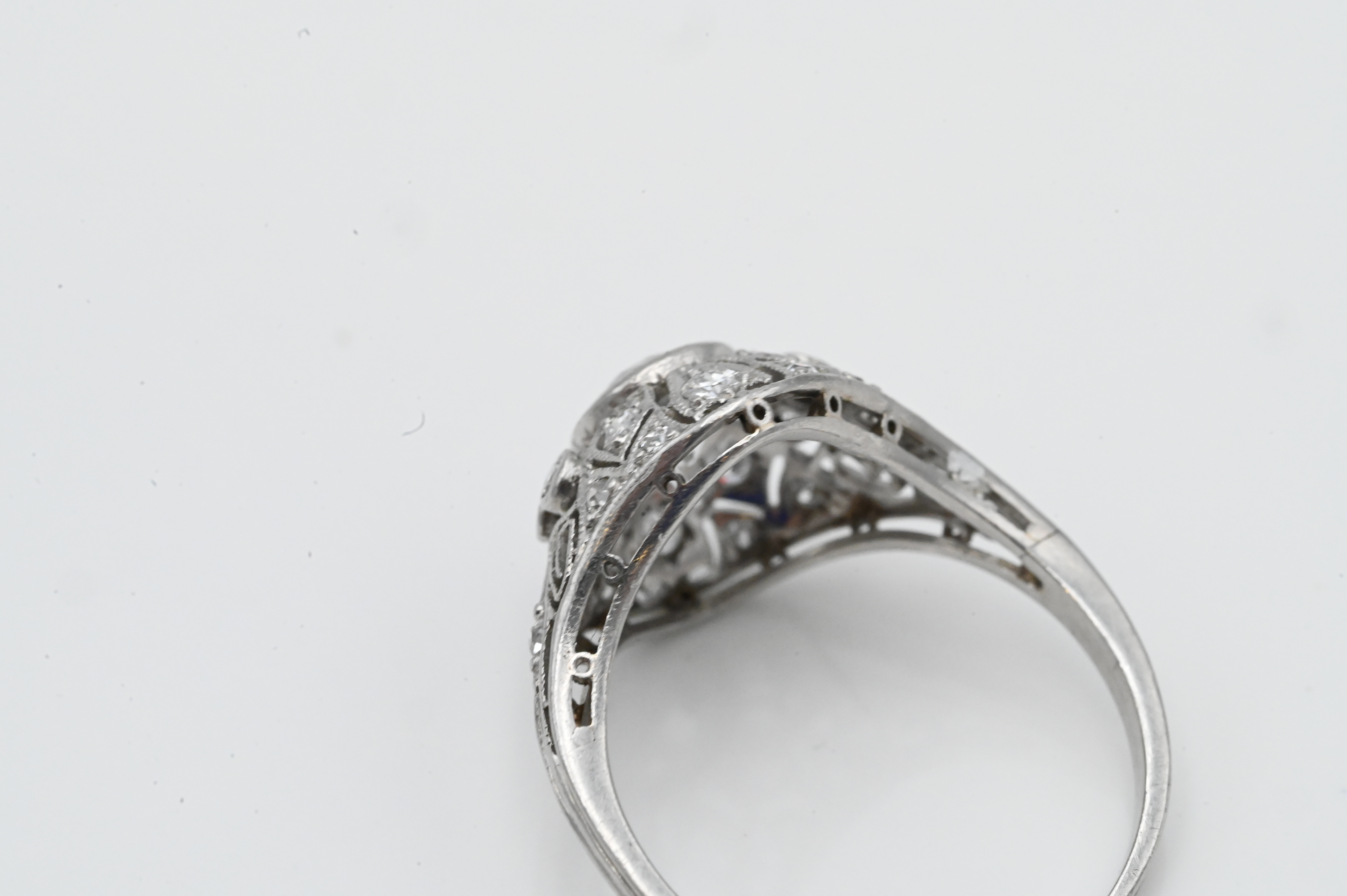 Platinum and Diamond Ring having center stone 5.5 millimeters along with 20 small diamonds size 6 3/4, approximately 0.60 carats Condition: good condition