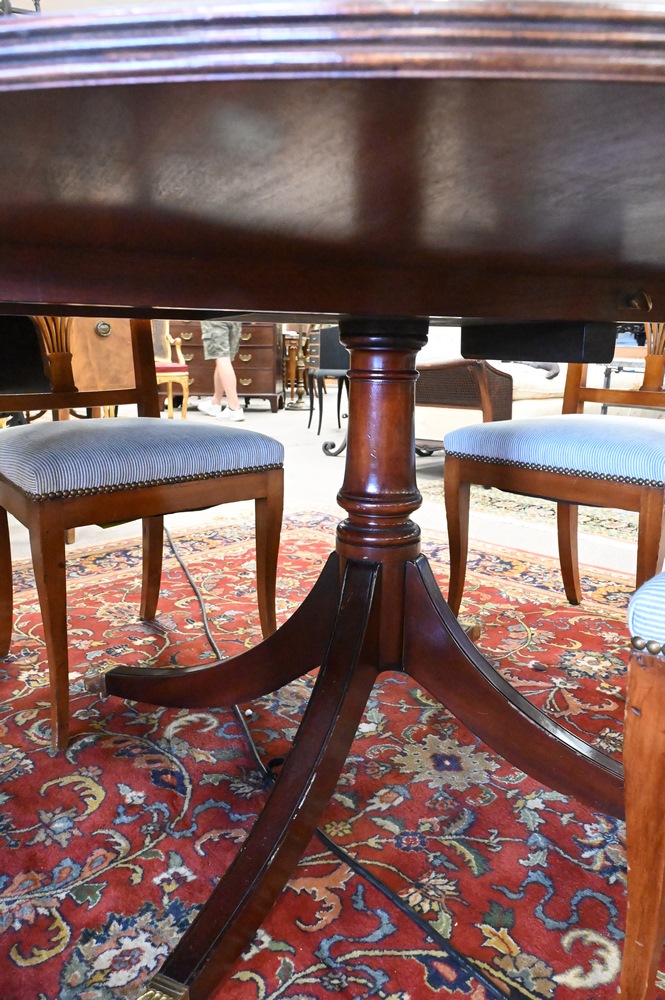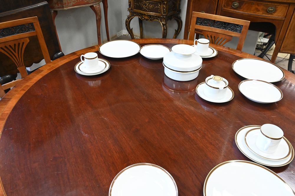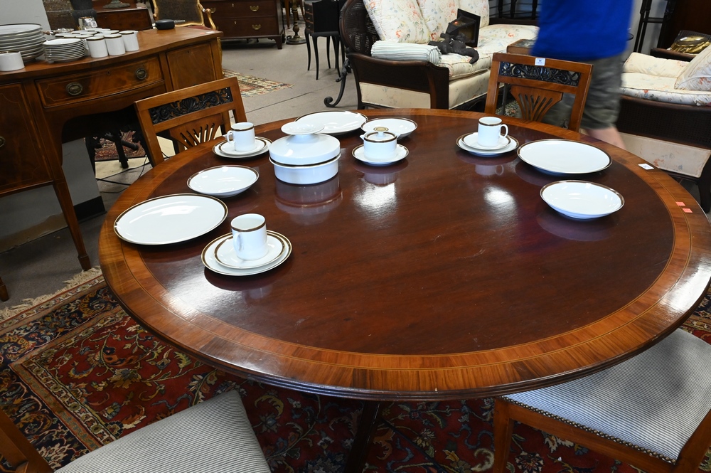 Round Mahogany Breakfast Tip Table, having banded inlaid top on pedestal base, height 28 1/2 inches, diameter 60 inches.