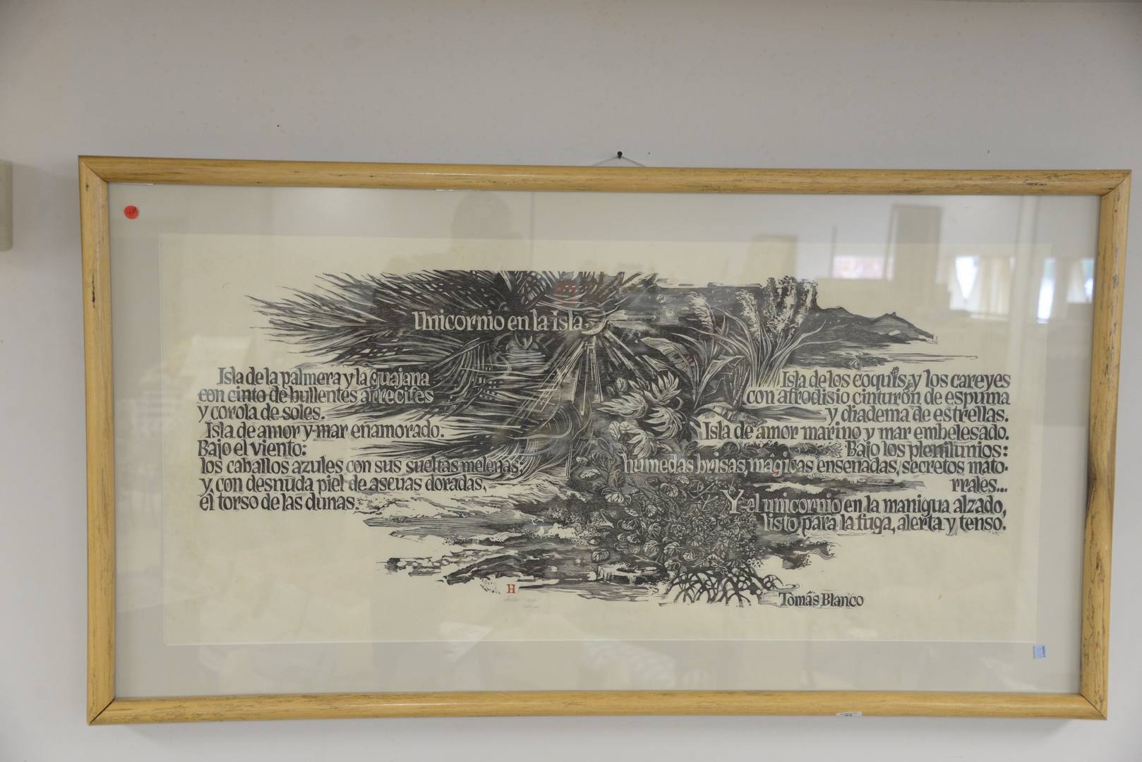 Lot 93: Three framed pieces to include Six Views of Scotland: Pitlochry, Dumfries, Banchory, Kirkcudbright, Falkirk, gelatin silver, framed together, early 20th century, overall 20″ x 19″; Lorenzo Homar (Puerto Rican, 1913 – 2004), Unicornio, lithograph on p