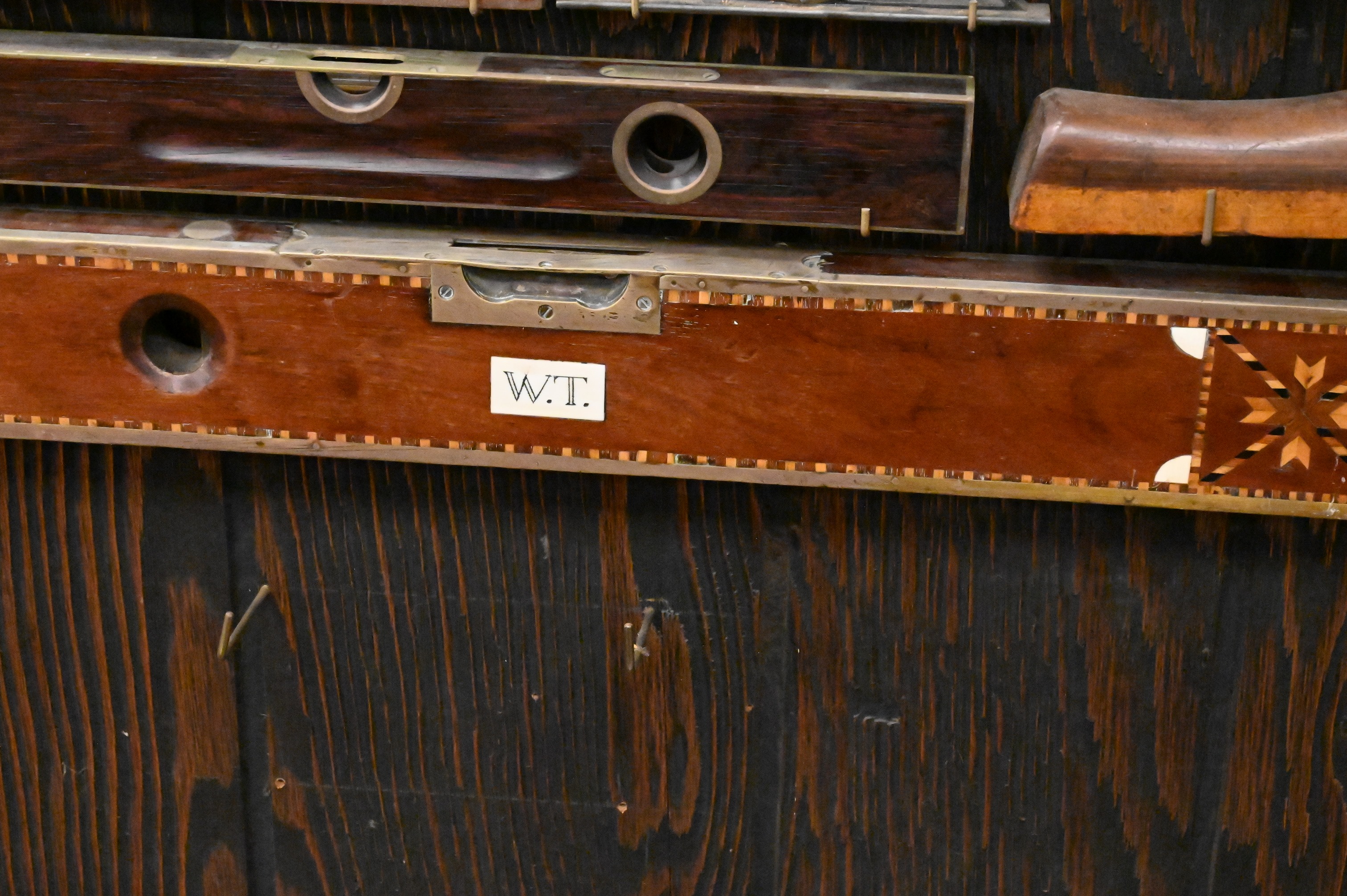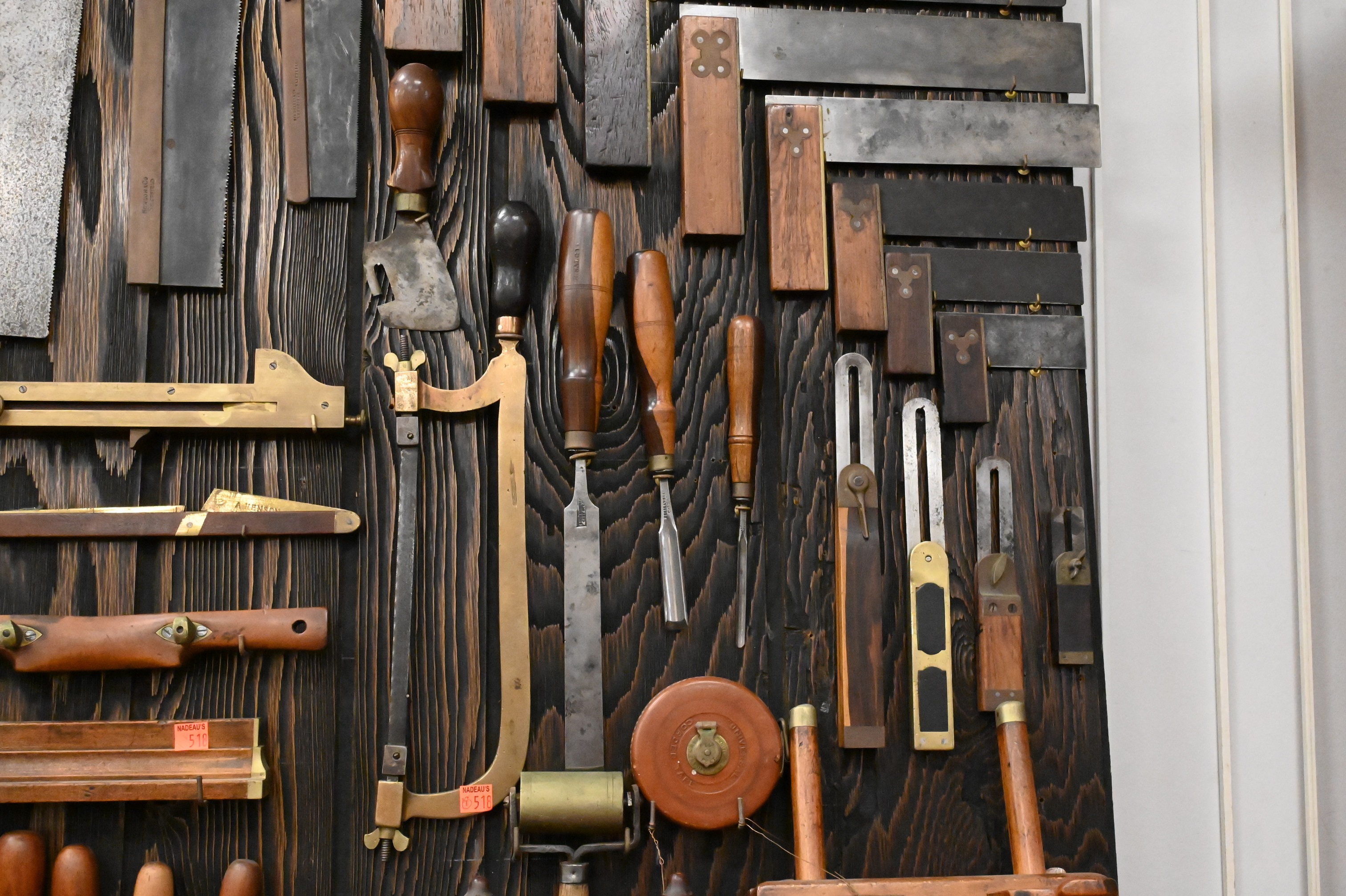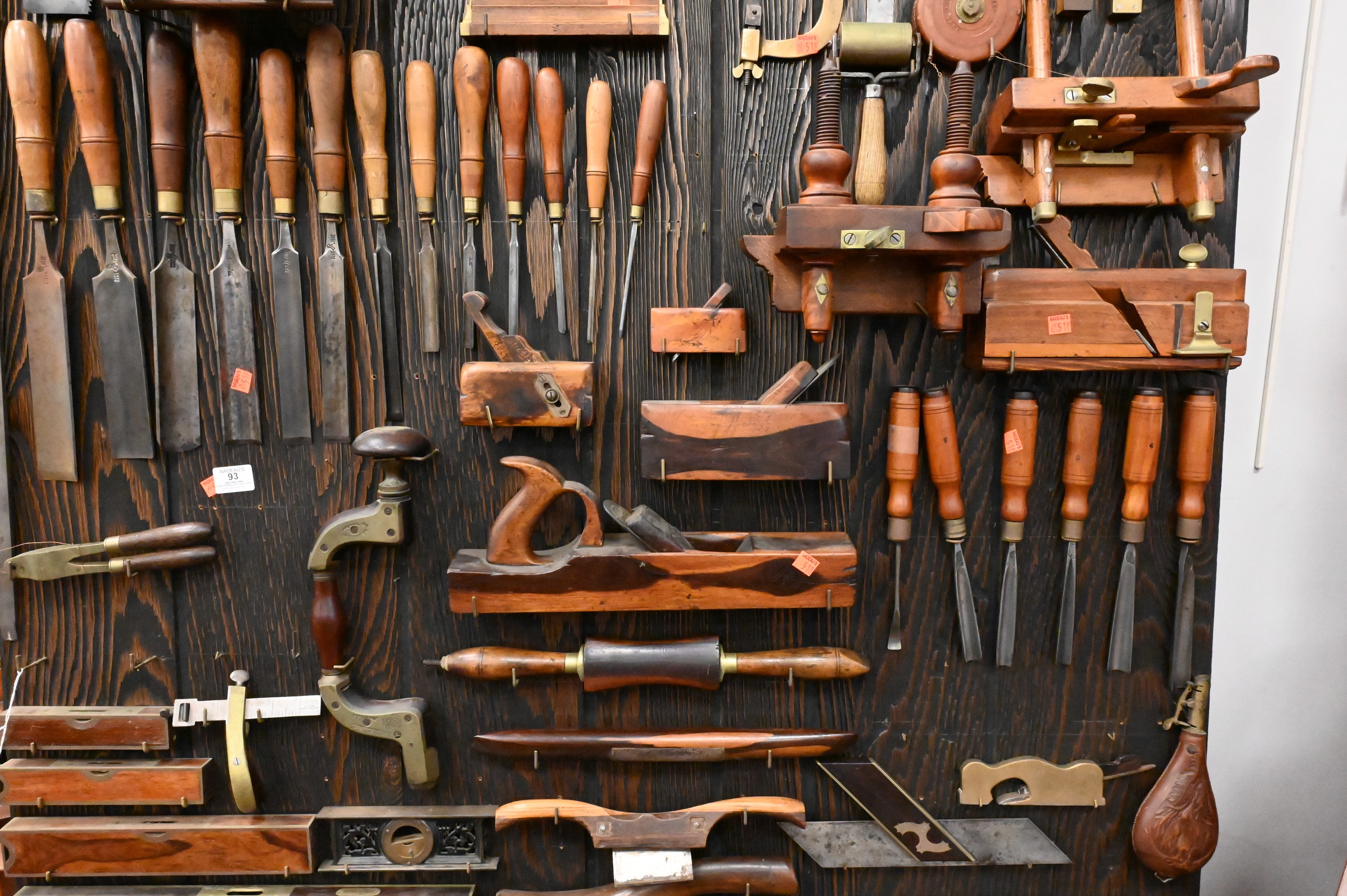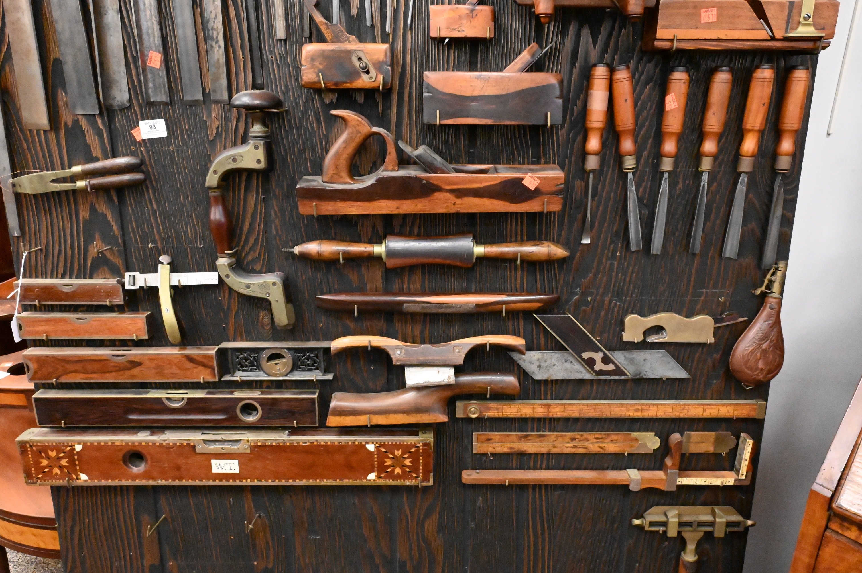 including planes, chisels, saws, inlaid levels, drills, squares and more including lignum vitae and rosewood many pieces squared, makers including D.R. Barton 1800, Stanley Rule Level, Moulson Bros, and Buck Bros