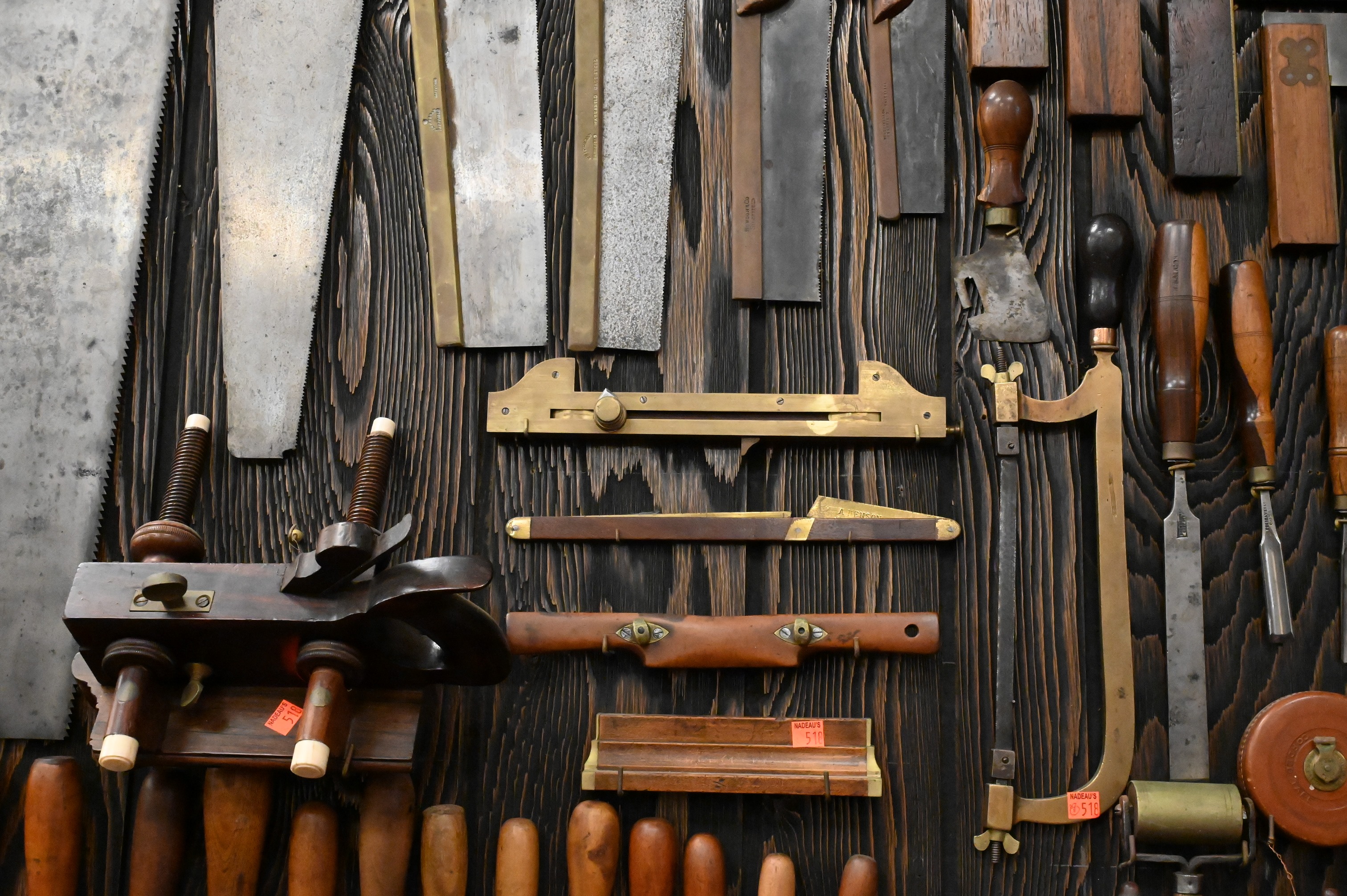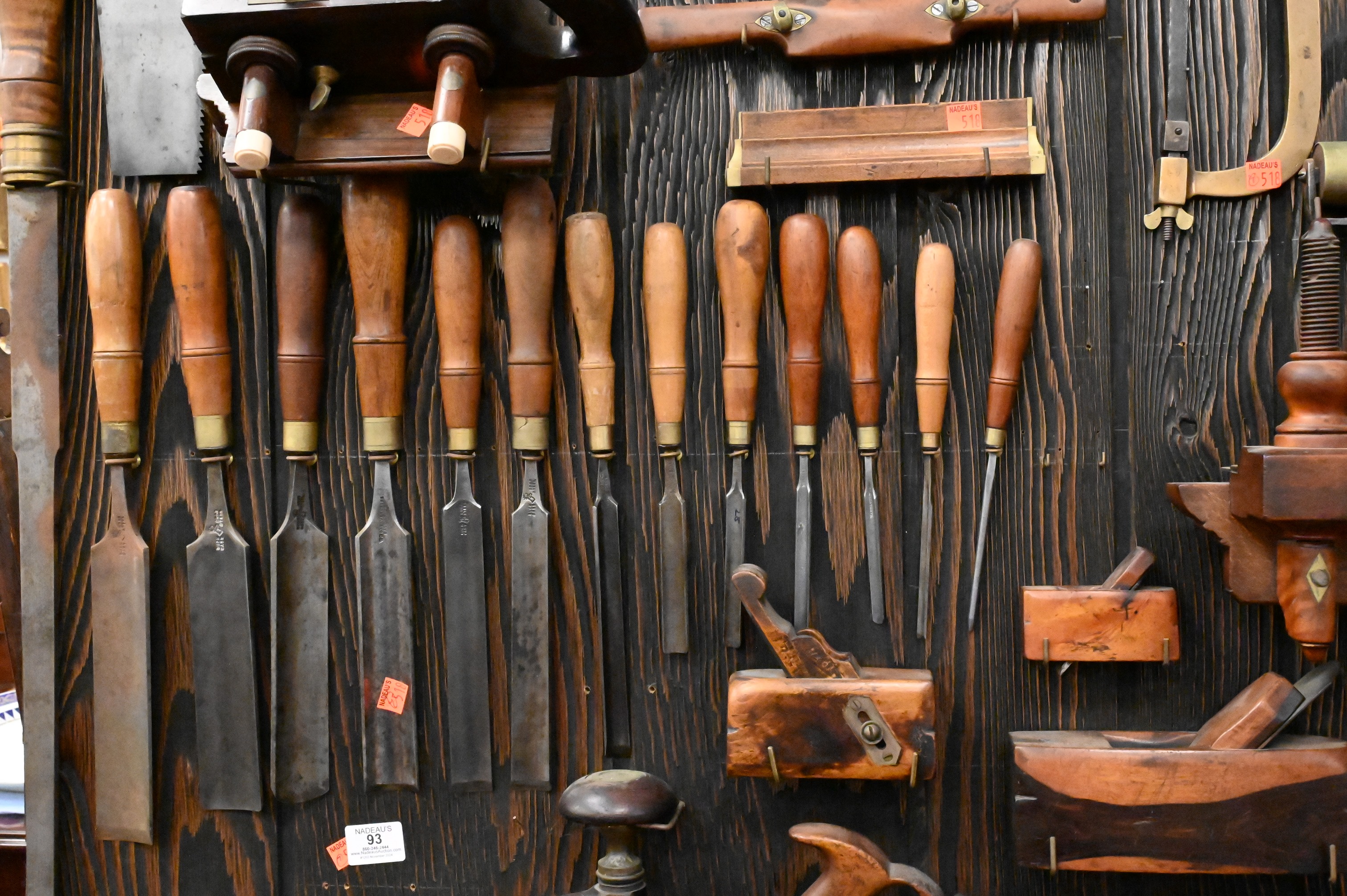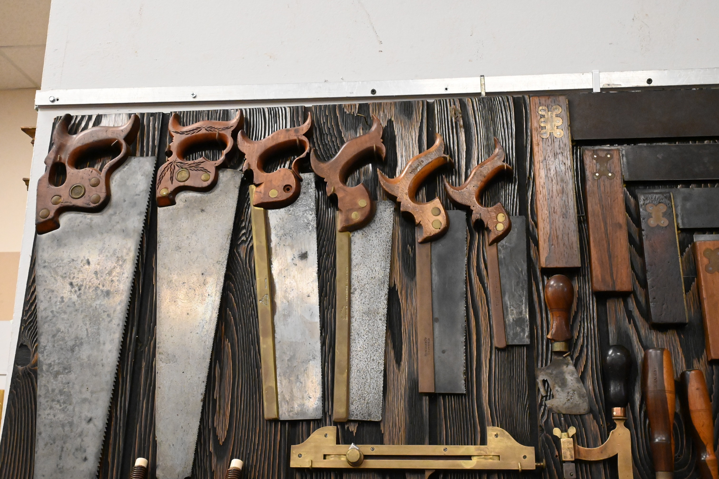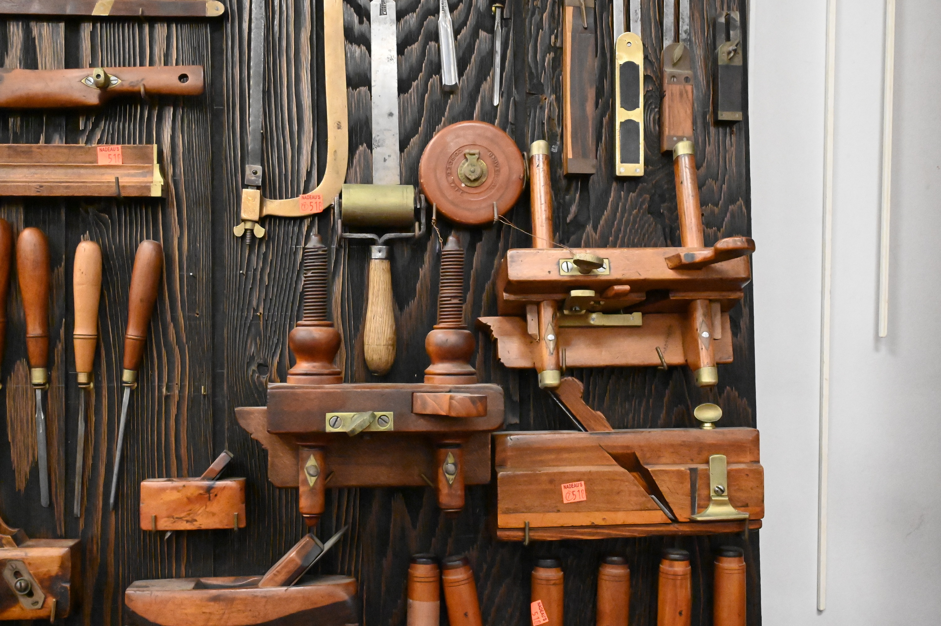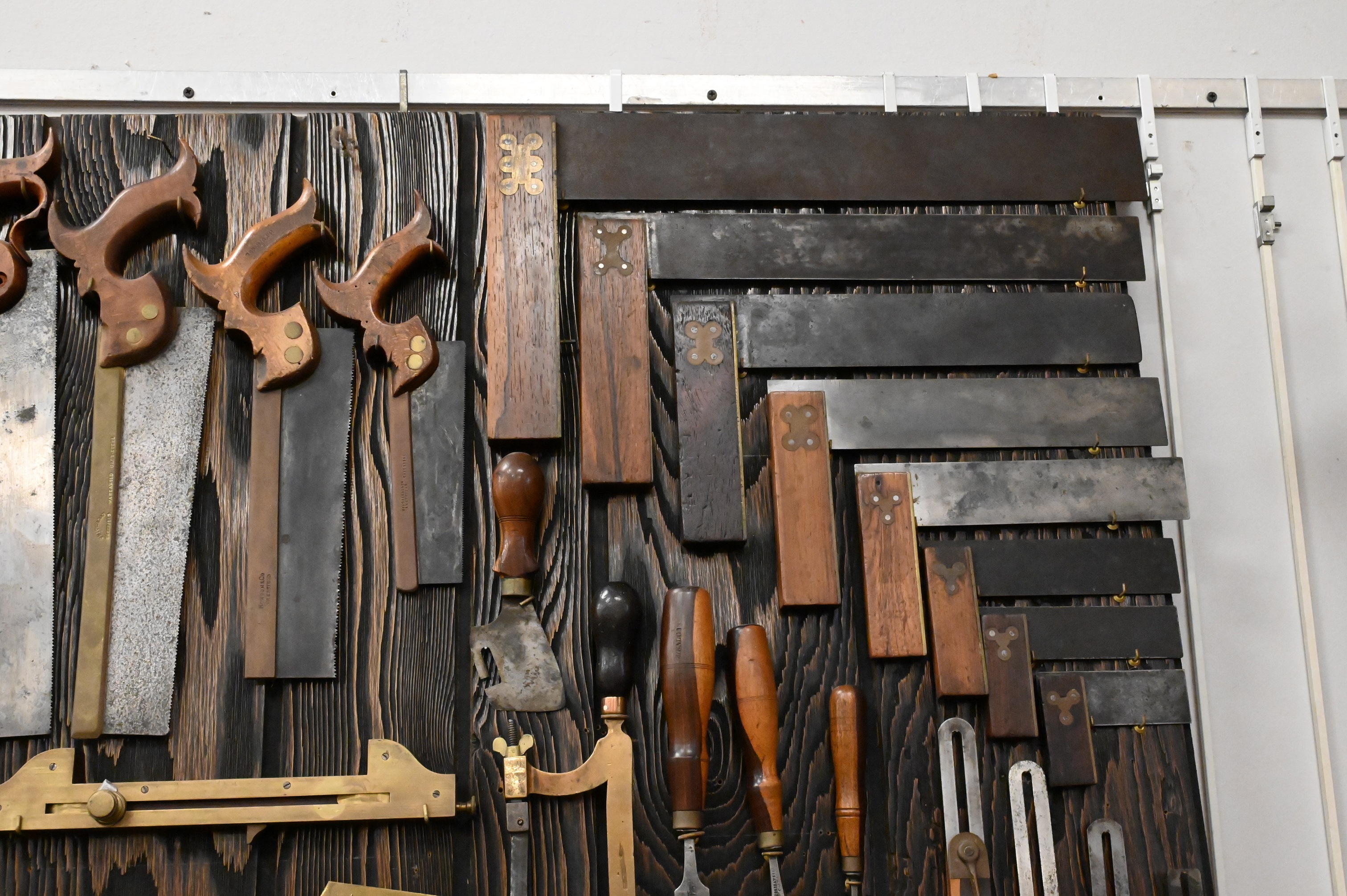 including planes, chisels, saws, inlaid levels, drills, squares and more including lignum vitae and rosewood many pieces squared, makers including D.R. Barton 1800, Stanley Rule Level, Moulson Bros, and Buck Bros