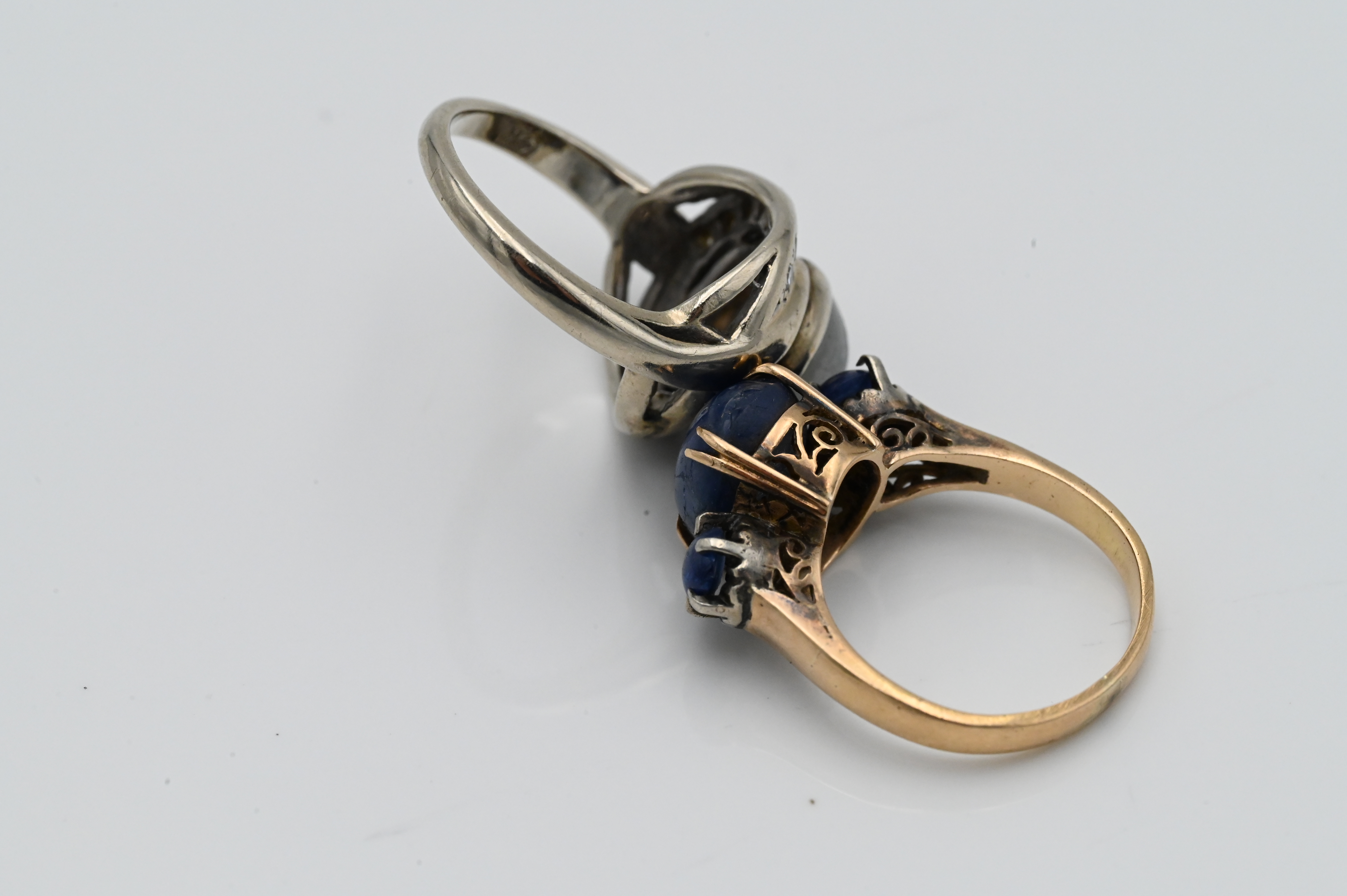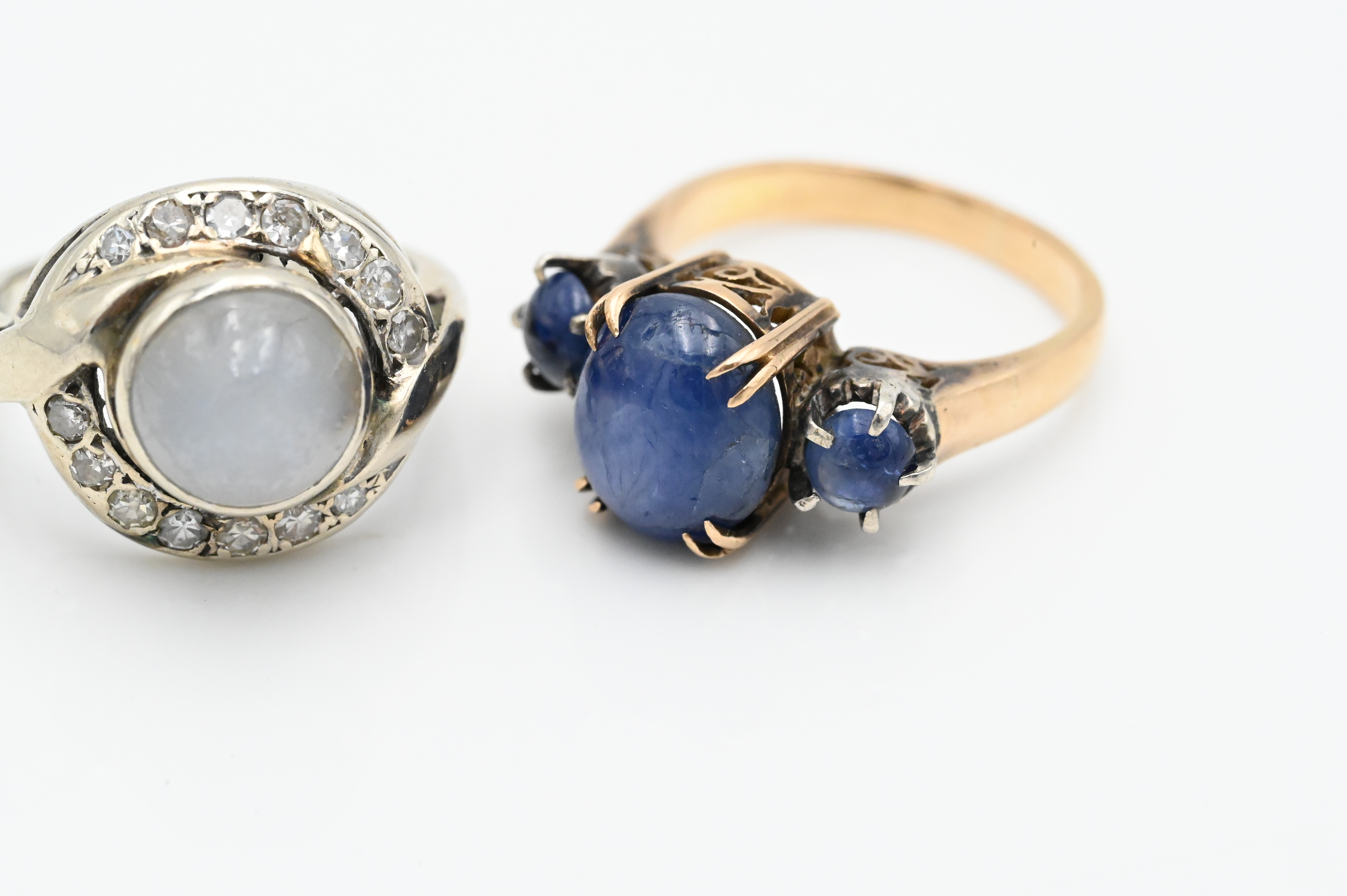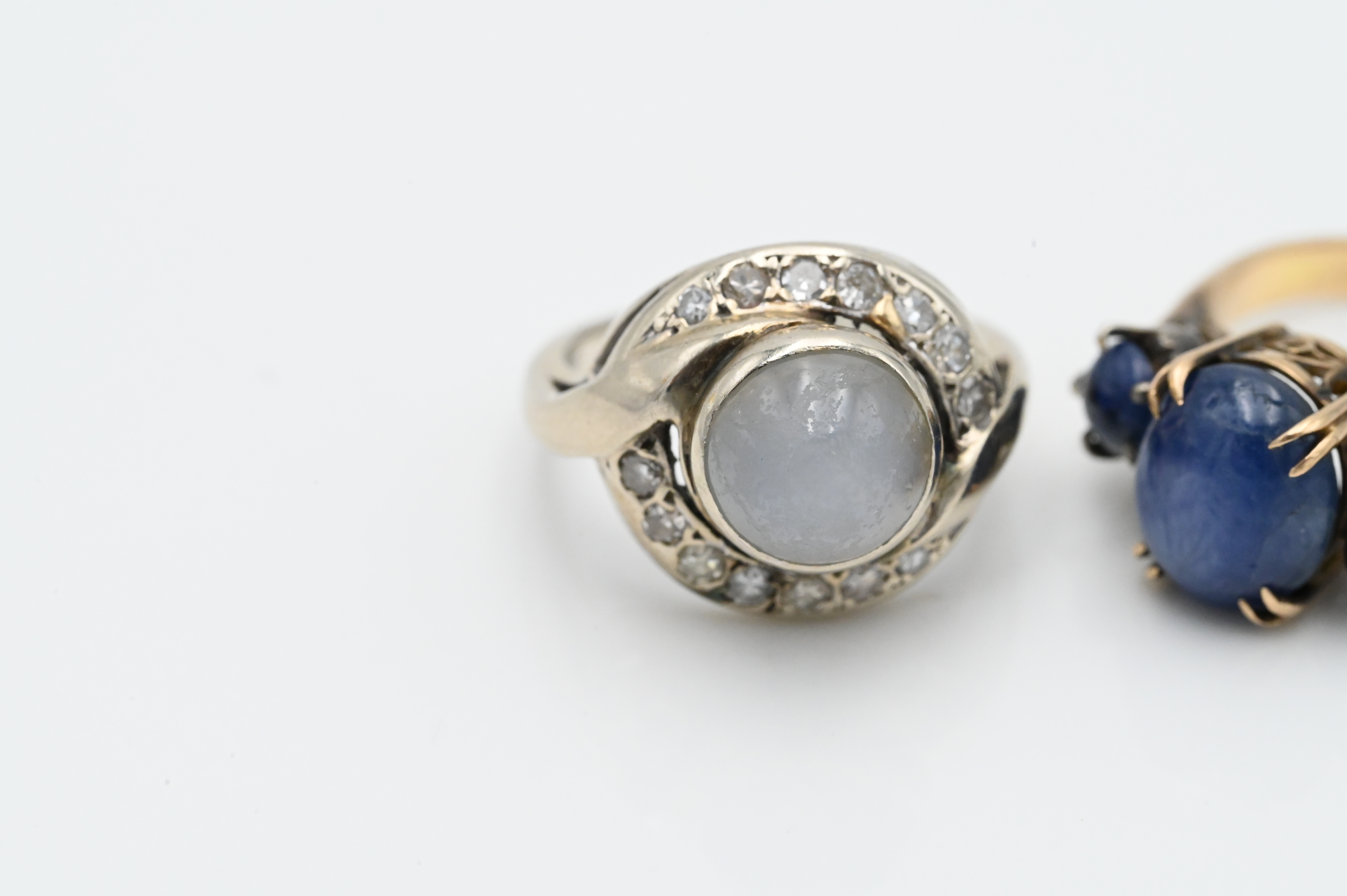 Two 14 Karat White and Yellow Gold Rings, each set with star sapphires, one mounted with diamond surround, size 5 and 4 3/4, total weight 10.4 grams.