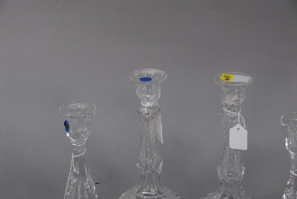 Lot 93: Two pairs of cut crystal candlesticks, one base with small chip and one top with minute chip, ht. 10 and ht. 8.