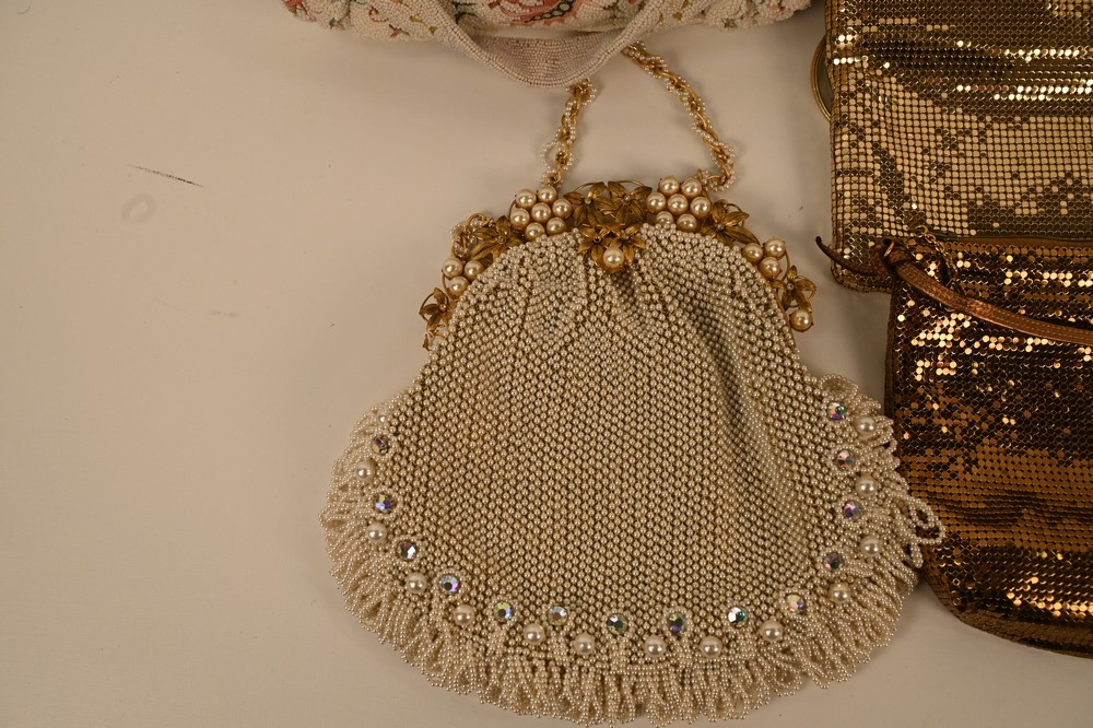 Whiting & Davis and Vintage Beaded Bags, to include white beaded bag by Josef, pearl bag by Jacomo, and three Whiting & Davis mesh bags, all in good condition.