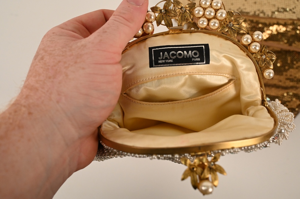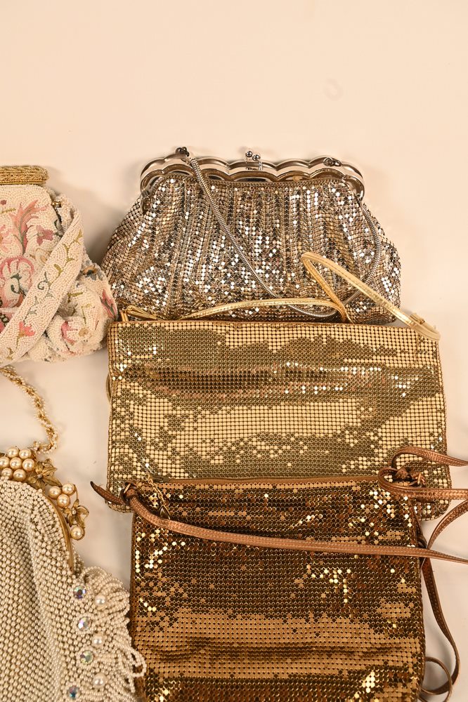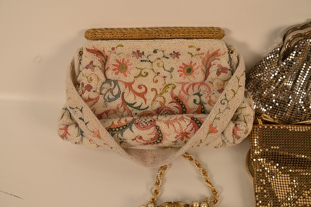 Lot 93: Whiting & Davis and Vintage Beaded Bags, to include white beaded bag by Josef, pearl bag by Jacomo, and three Whiting & Davis mesh b…