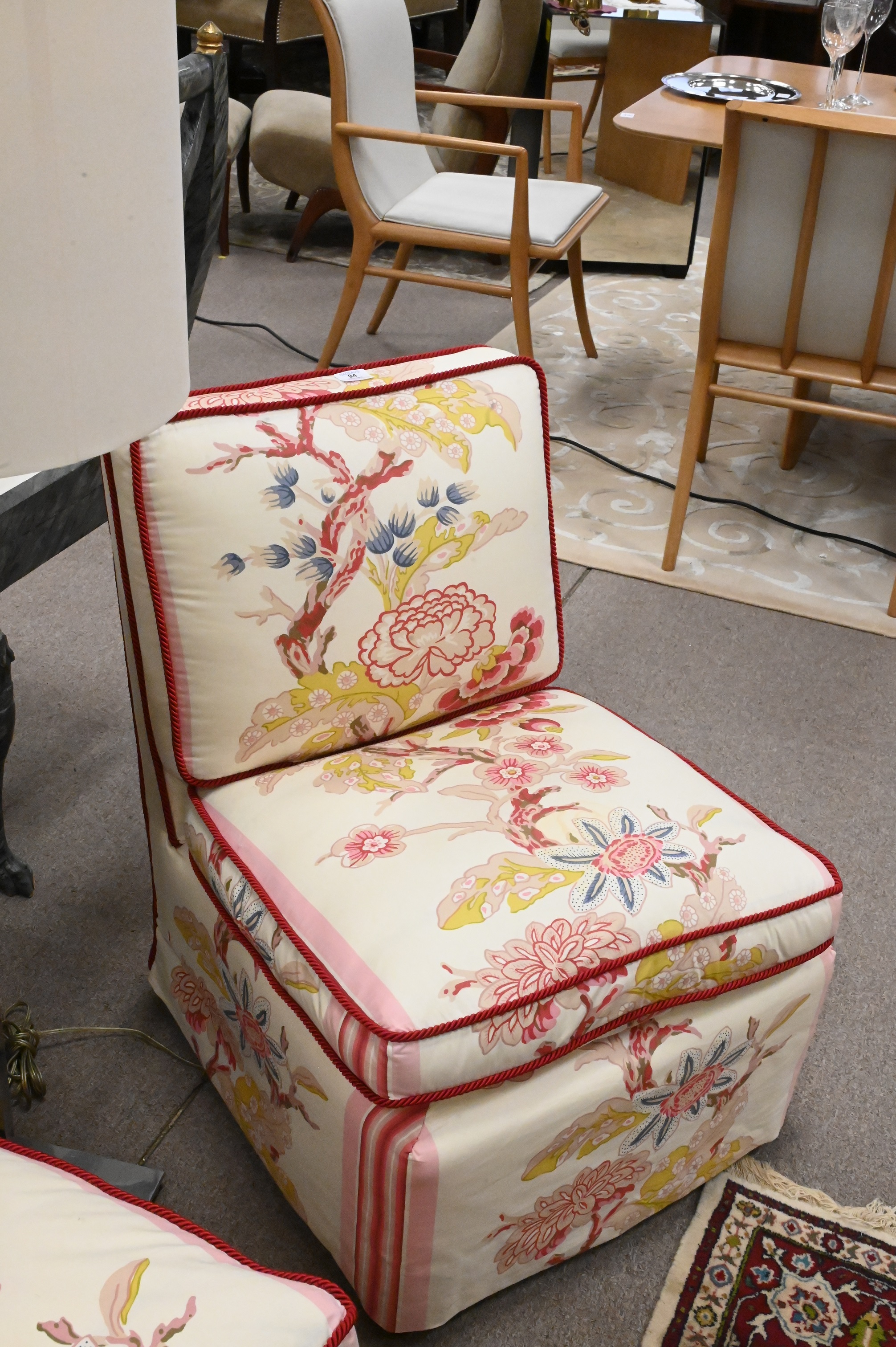 A Pair of Custom Chintz Upholstered Slipper Chairs, attributed to Billy Baldwin, having floral upholstered down filled cushion, height 28 1/2 inches, width 21 inches, depth 27 inches. Provenance: Property from a private New York collection sold to benefit charitable foundations.