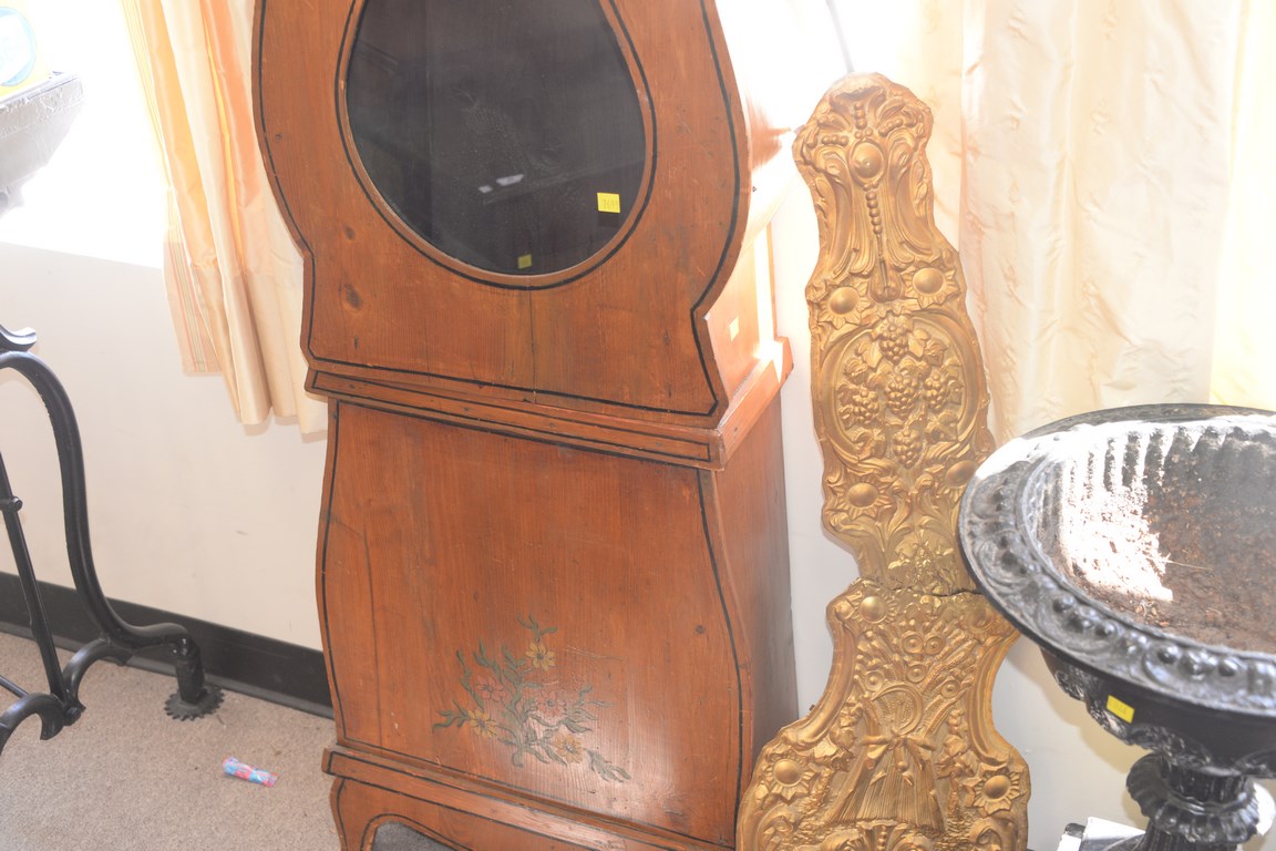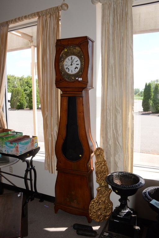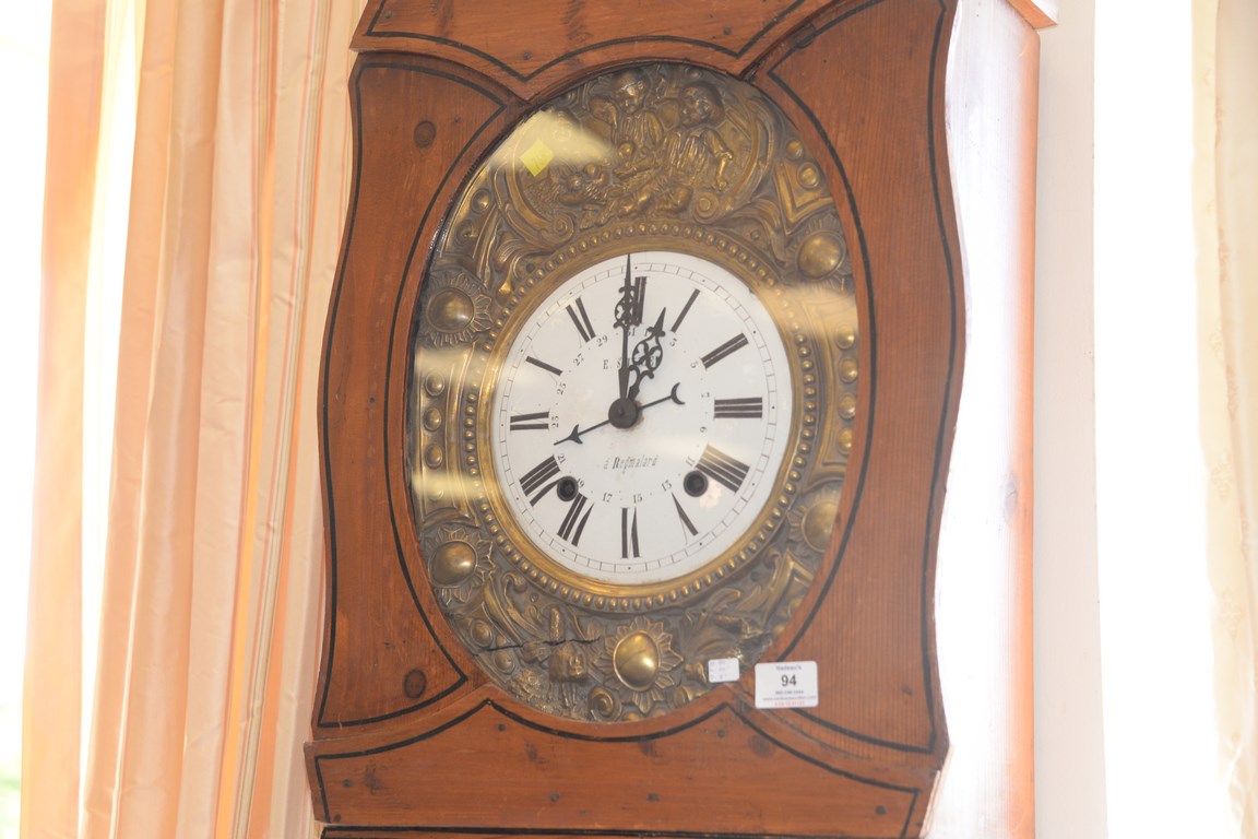 Lot 94: Continental tall case clock with enameled dial, brass surround, and brass pendulum. ht. 90 in.