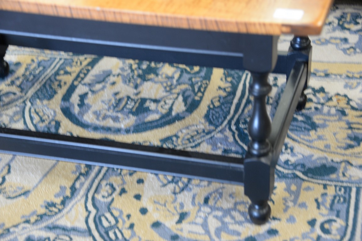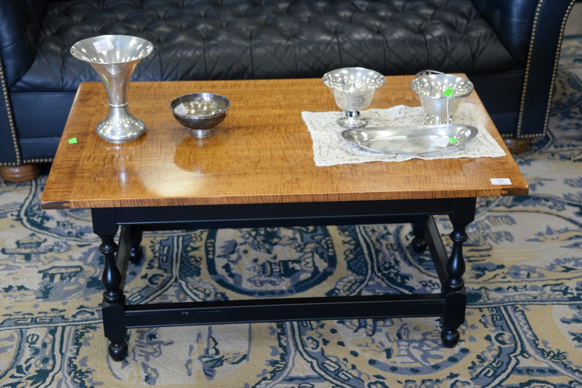 Lot 94: Custom tiger maple coffee table having tiger maple breadboard top over turned leg base, possibly Dimes. ht. 18in., top: 38 x 24.