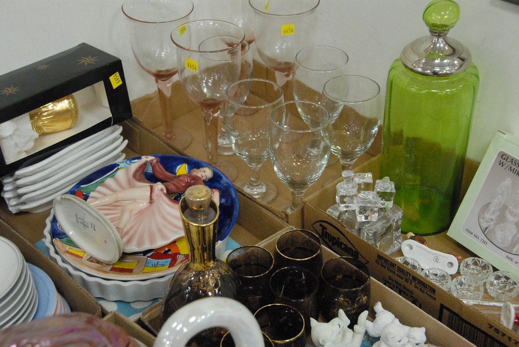 Eight box lots Christmas items, plates, bear collection, decanter set, glasses, plates, etc.