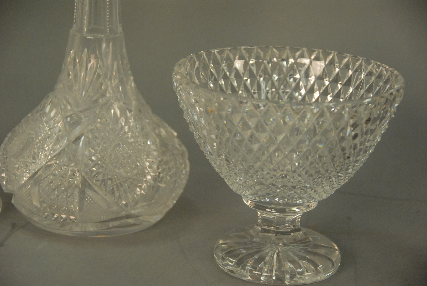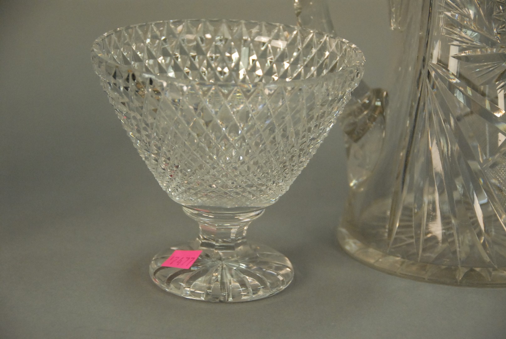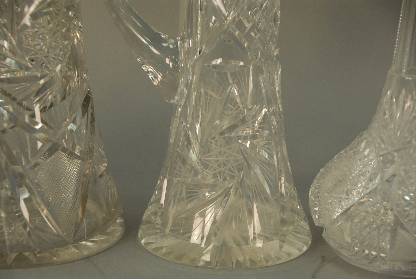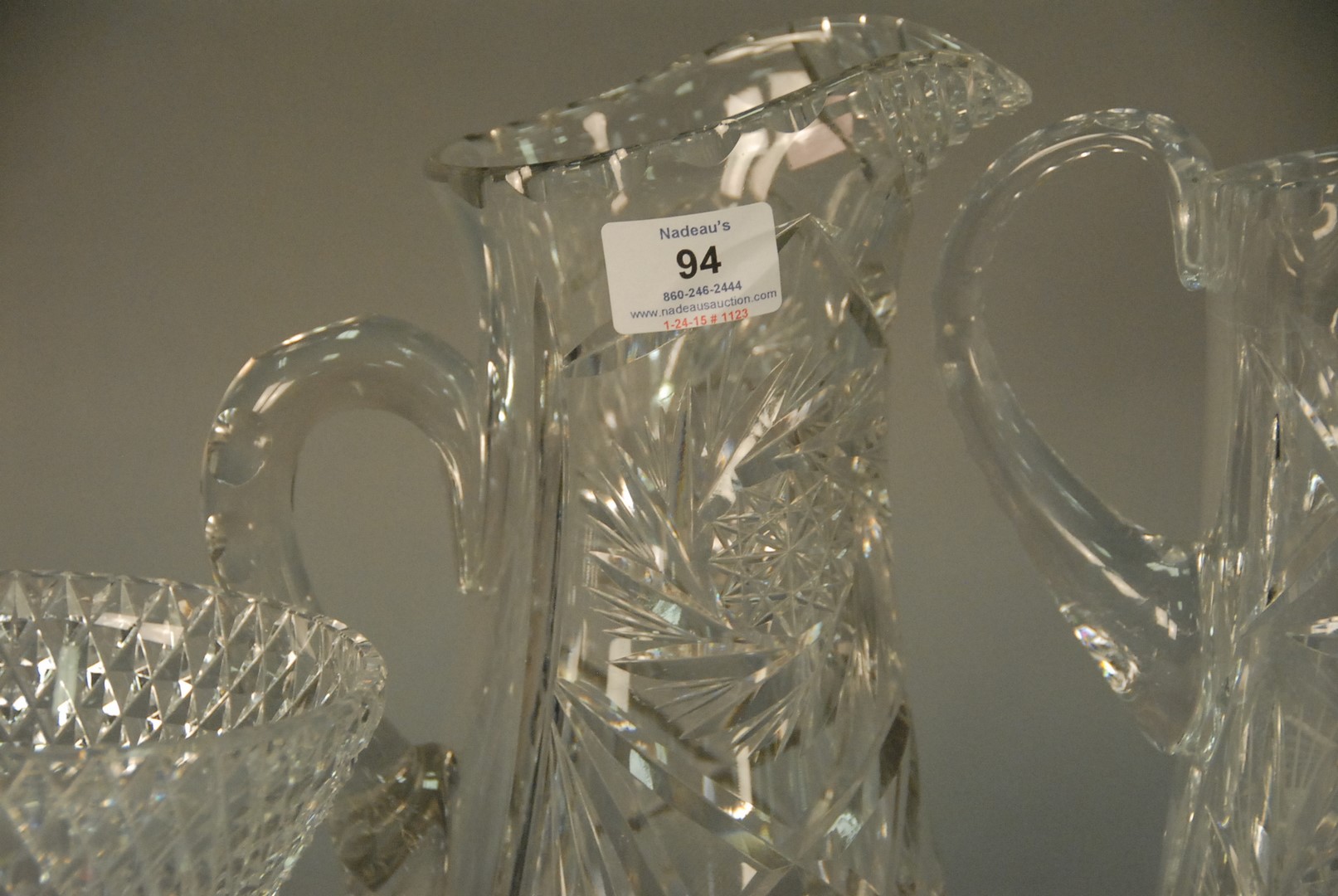 Group of five cut glass pieces including pair of vases, two pitchers, and a compote.