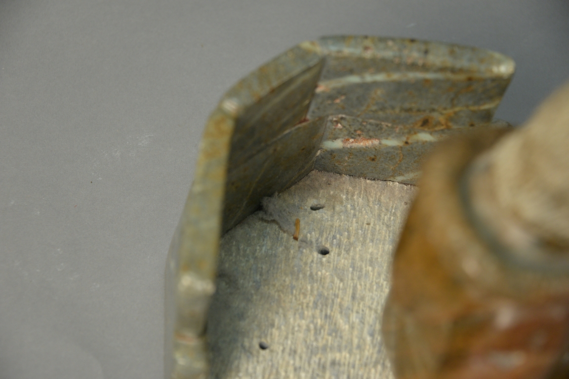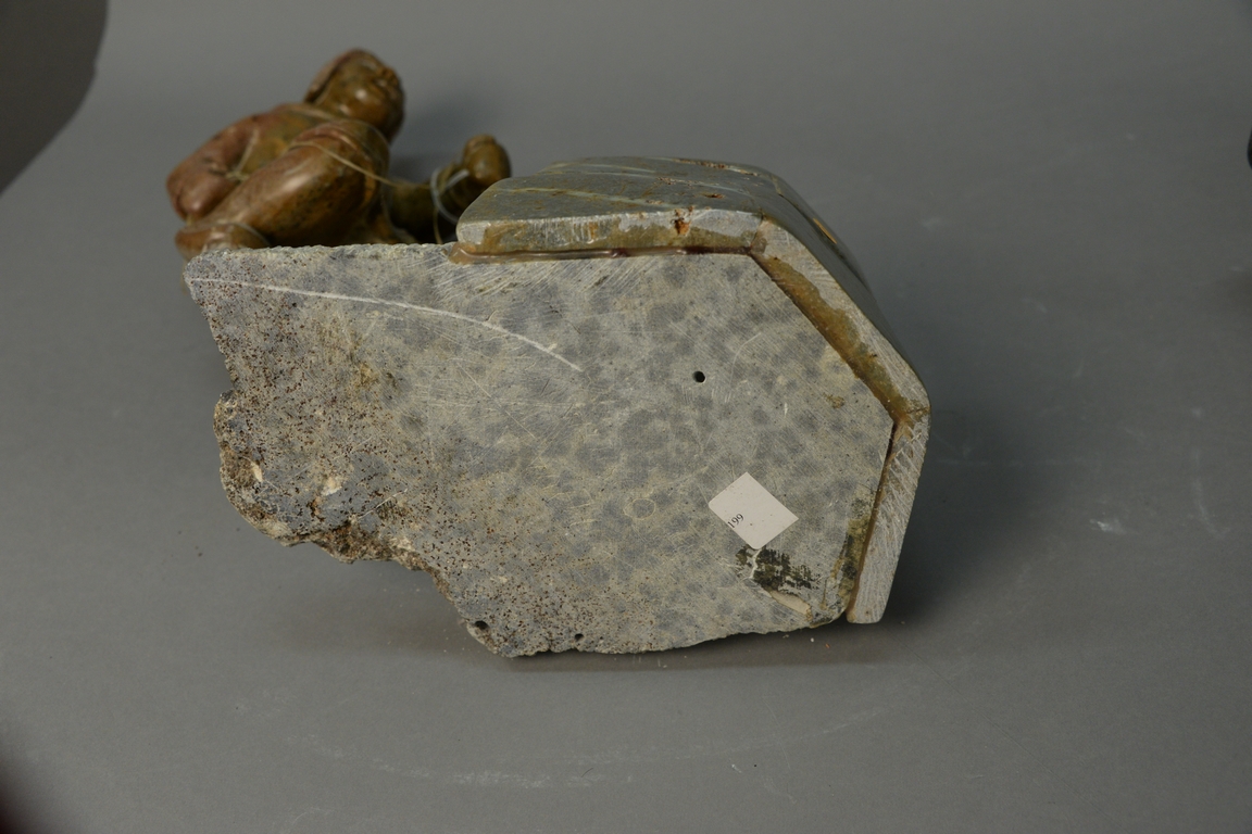 Inuit Eskimo carving Paul QayutiNNuaq b. 1957 brown soapstone Inset Inuk Hunter/Snow Block ht. 9 1in., with pedestal ht. 30in.