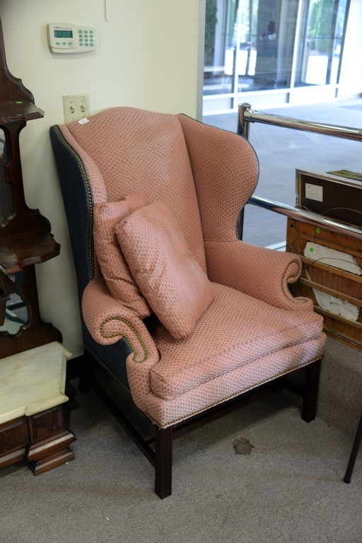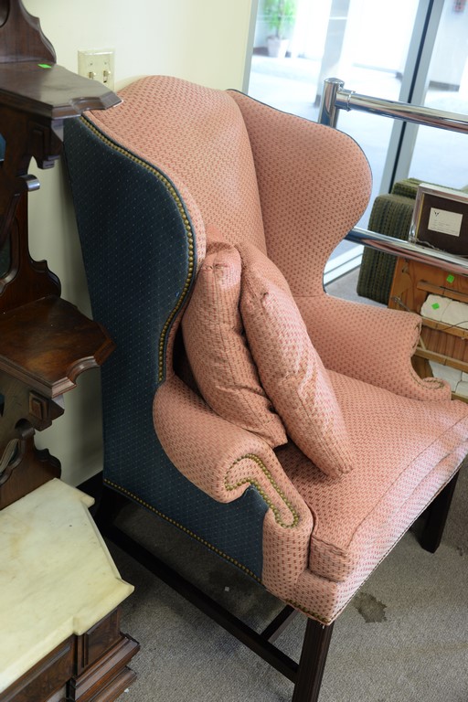 J. Royale Furniture custom upholstered Chippendale style wing chair.