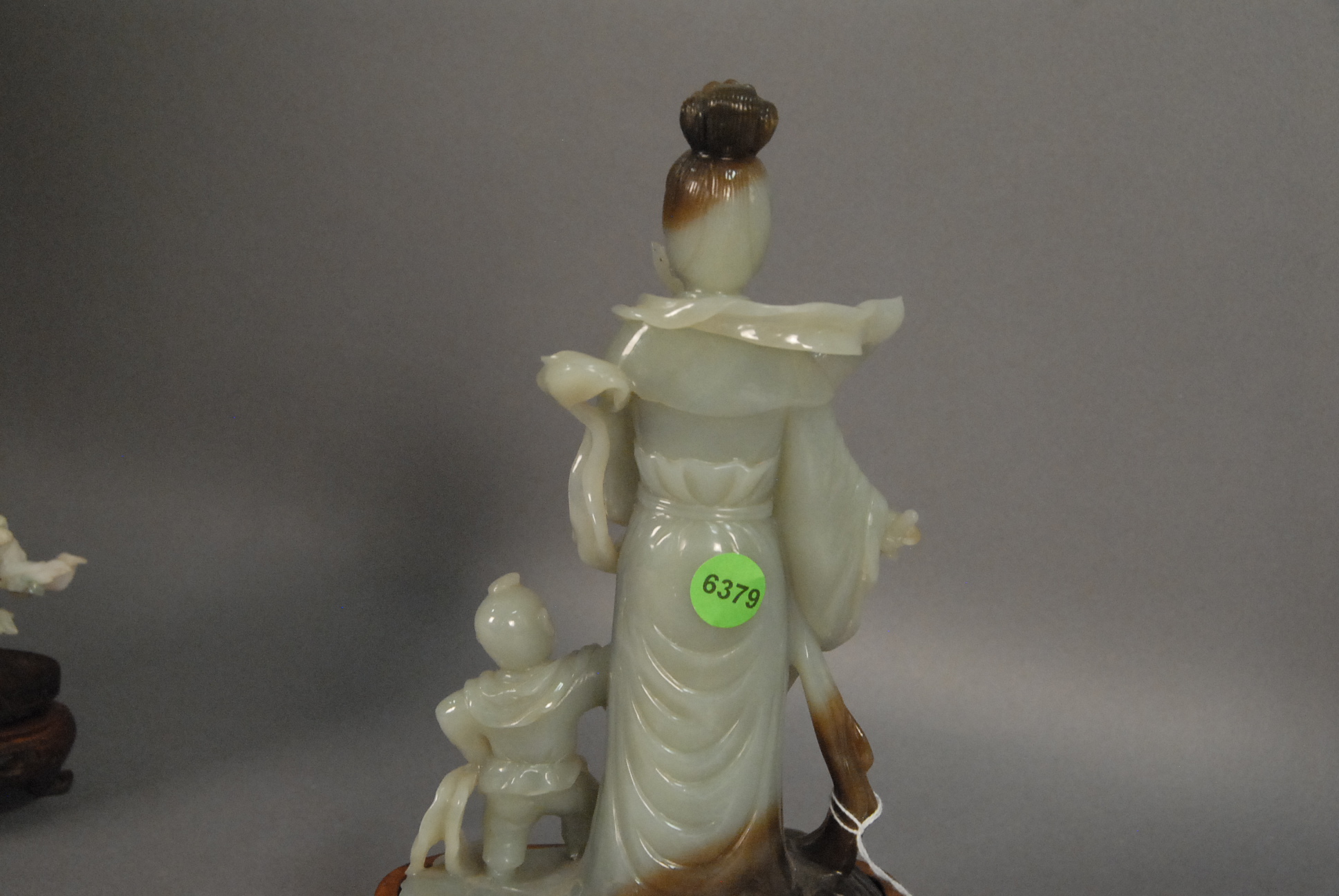 Large grey jade carved guanyin with young boy having ringed bracelet and russet colored hair with carved wood base, ht. 10 1/4, wd. 5 1/2.